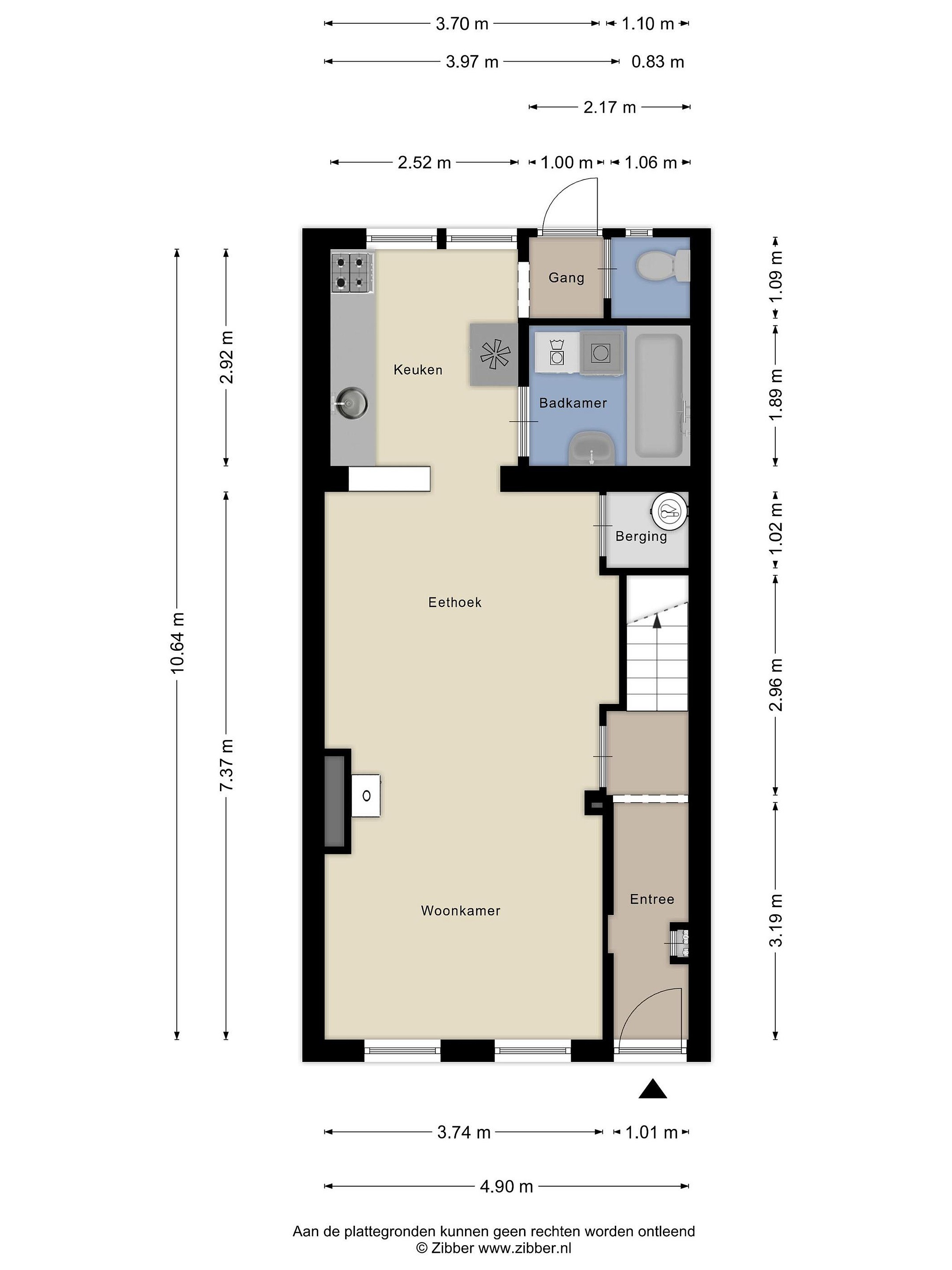Entree / hal met meterkast en trapopgang. De woonkamer beschikt over een gashaard en aan de achterzijde de keukenopstelling met een gaskookplaat en een afzuigkap. Via een halletje bereikt u het toilet en de achtertuin. De badkamer is bereikbaar vanuit de keuken en voorzien van een wastafel en een ligbad met douche.
