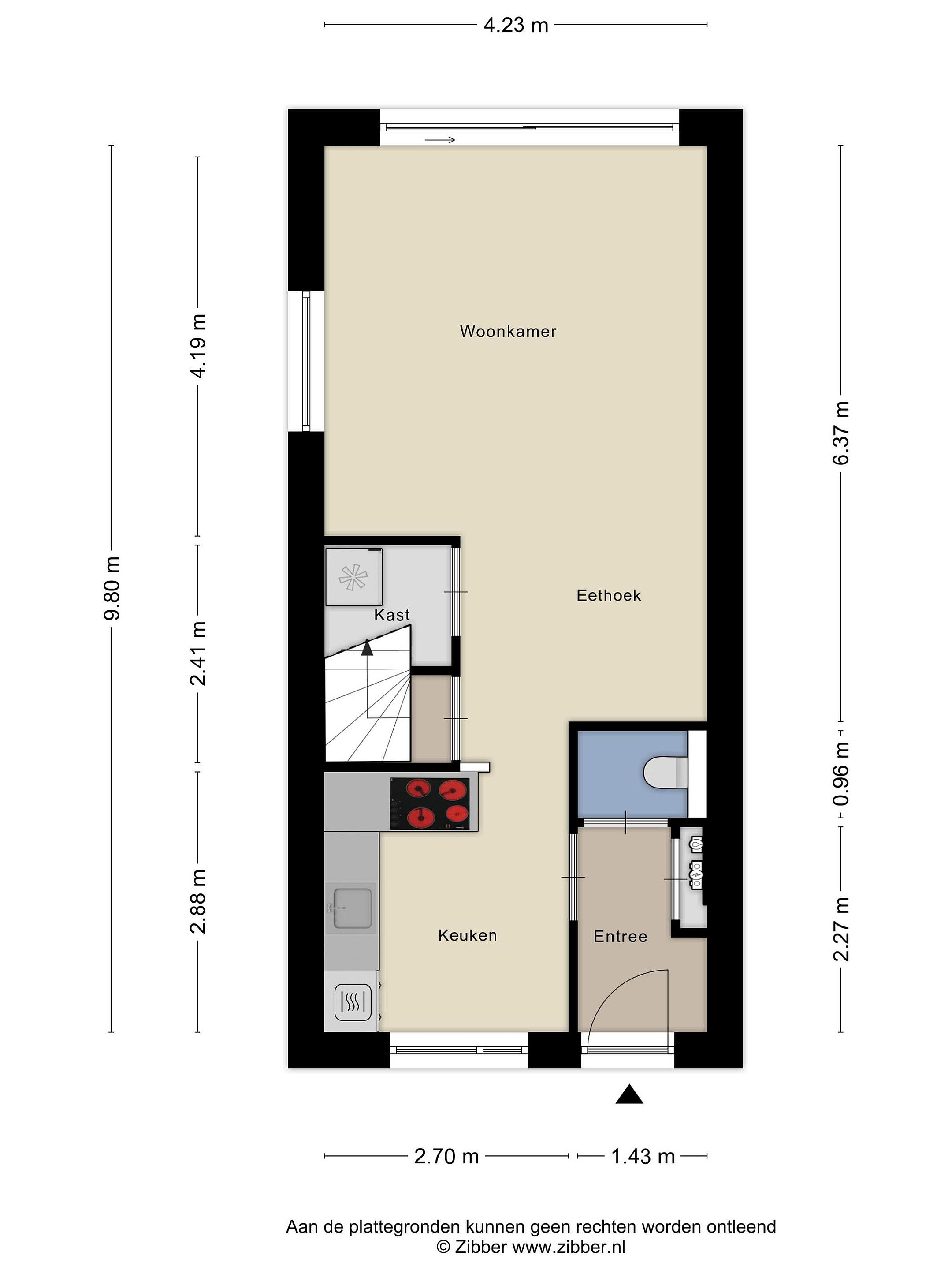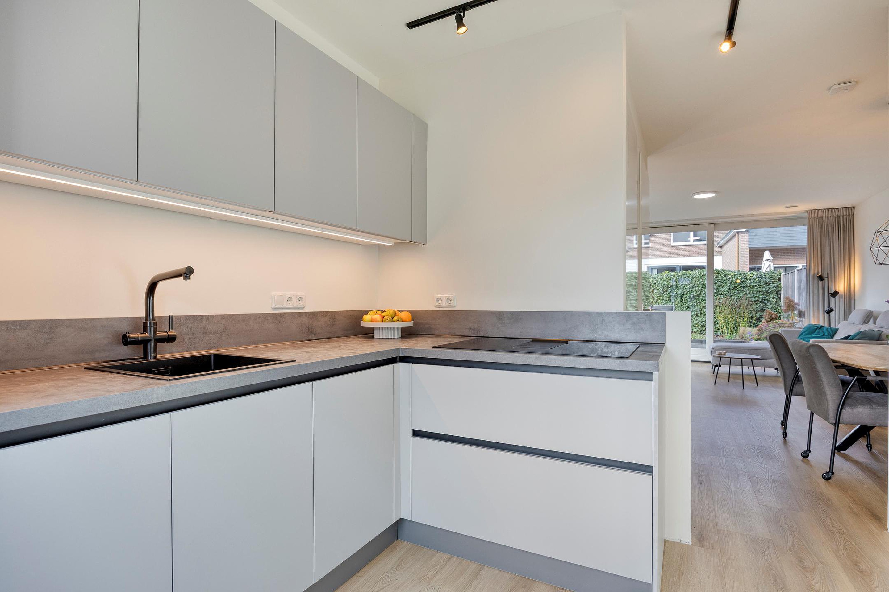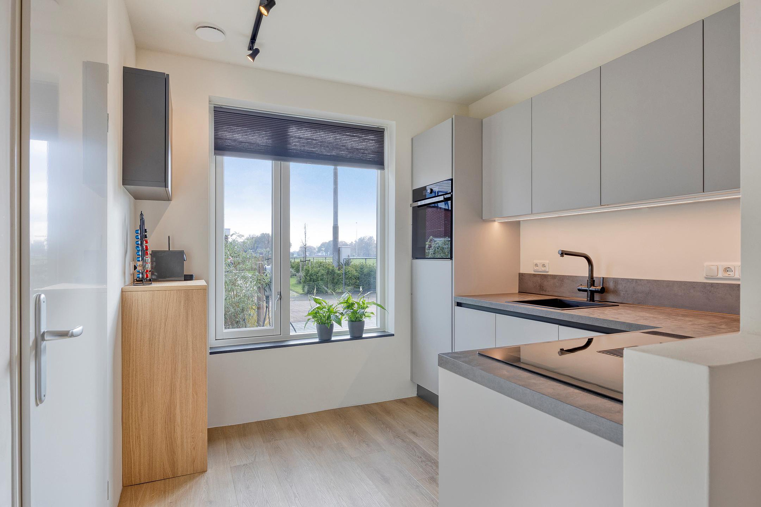 Entree/hal met meterkast en toilet. De ruime woonkamer is voorzien van veel lichtinval, schuifpui, trapkast, trapopgang en aan de voorzijde de keukenopstelling met diverse inbouwapparatuur, o.a. een inductiekookplaat, afzuigkap, oven, koelkast en een vaatwasmachine.