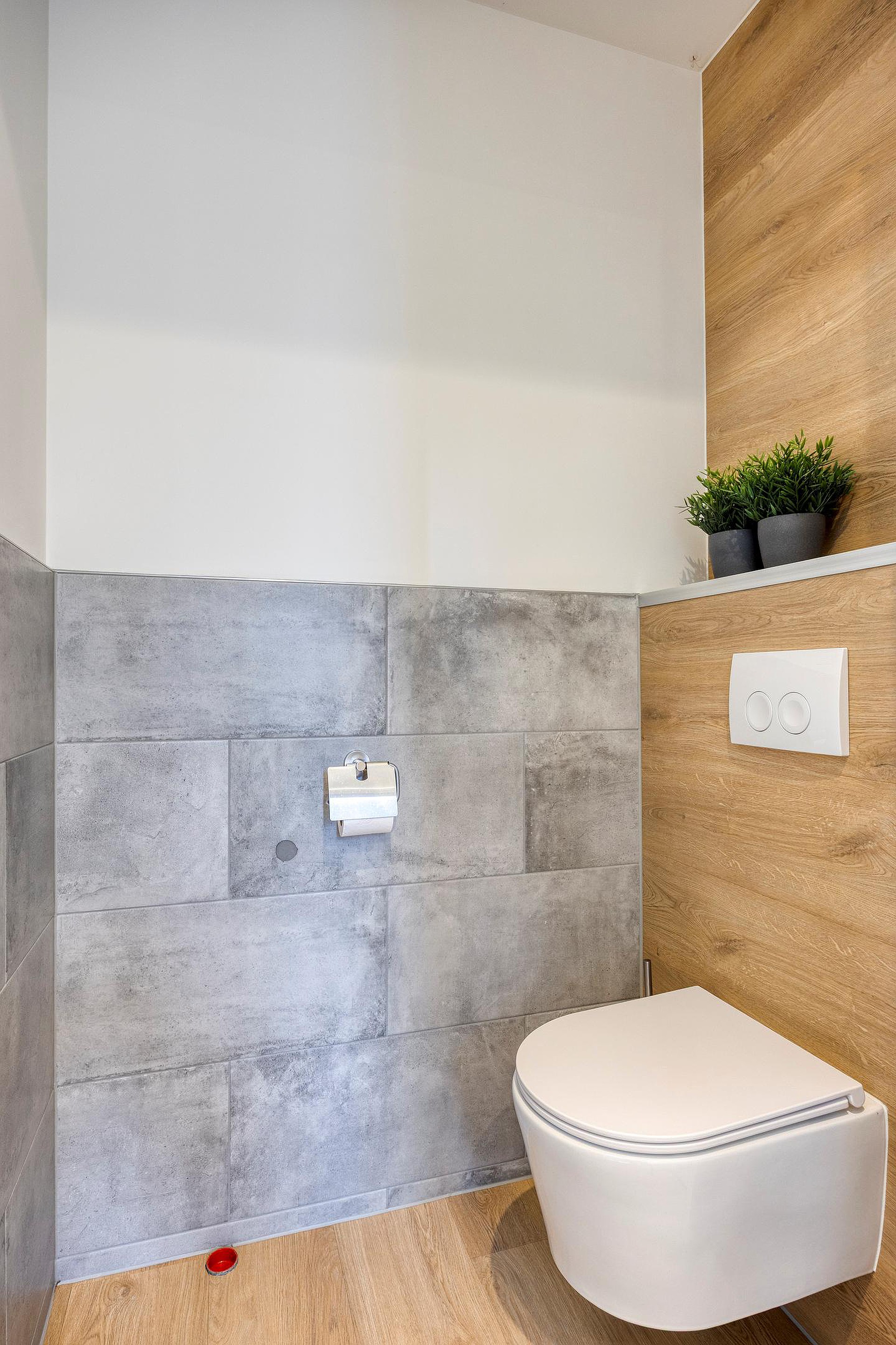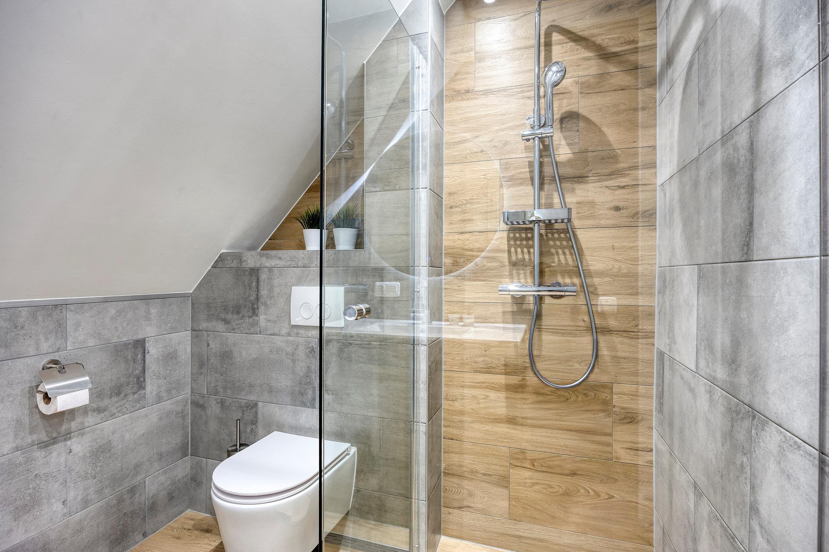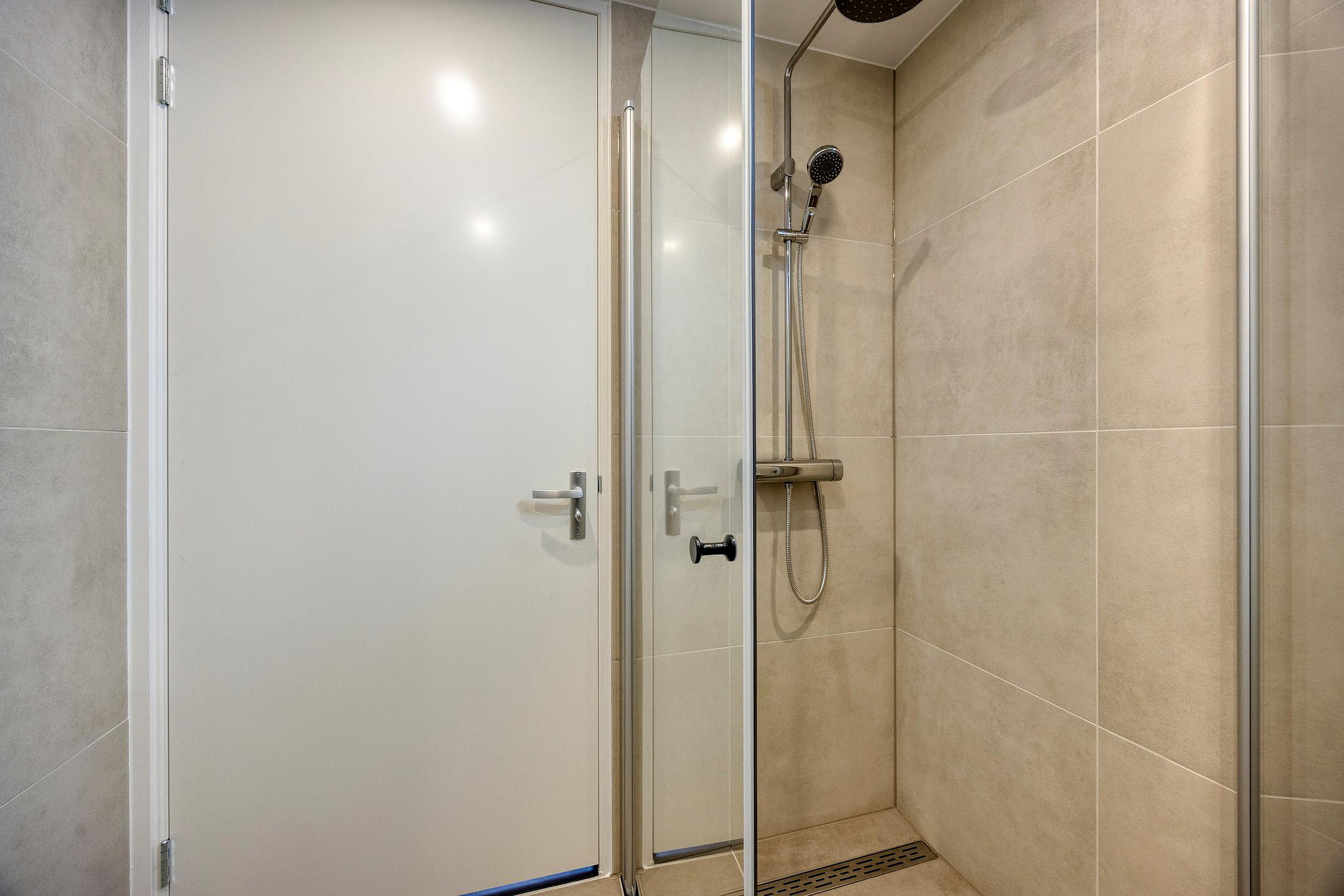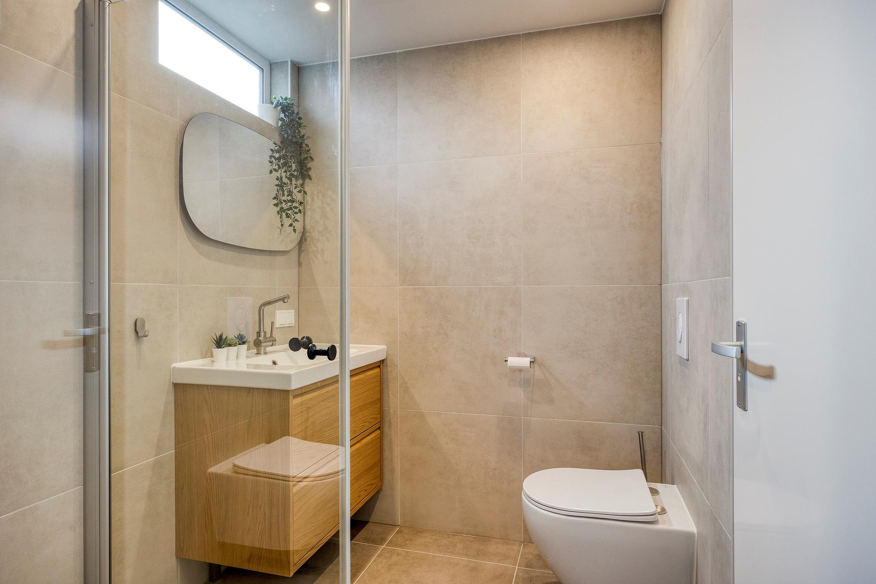 - De woning beschikt over een badkamer met douche, toilet en wastafel in meubel;