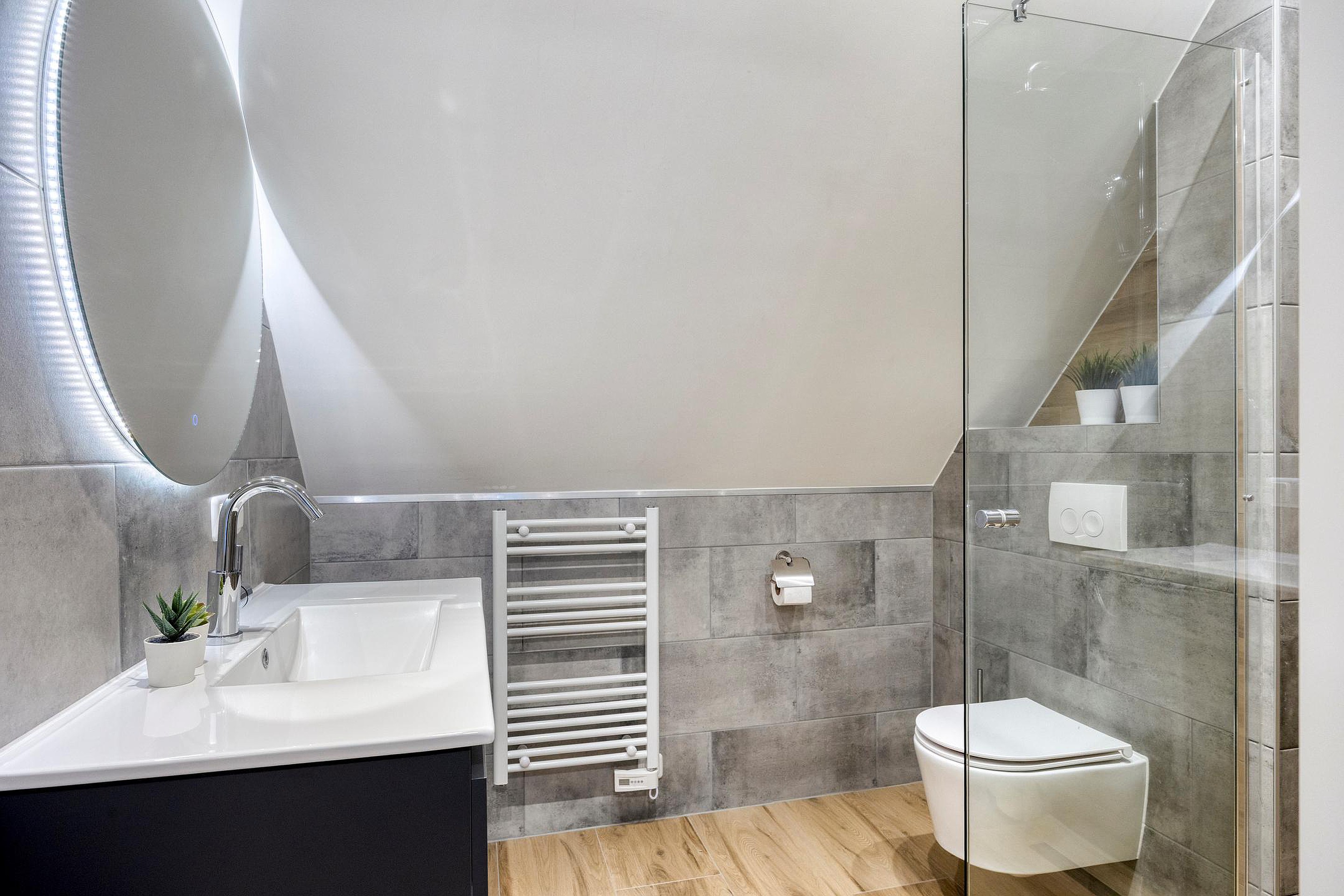 Overloop met trapopgang, 2 slaapkamers en de badkamer voorzien van een douche, toilet en wastafel in meubel.