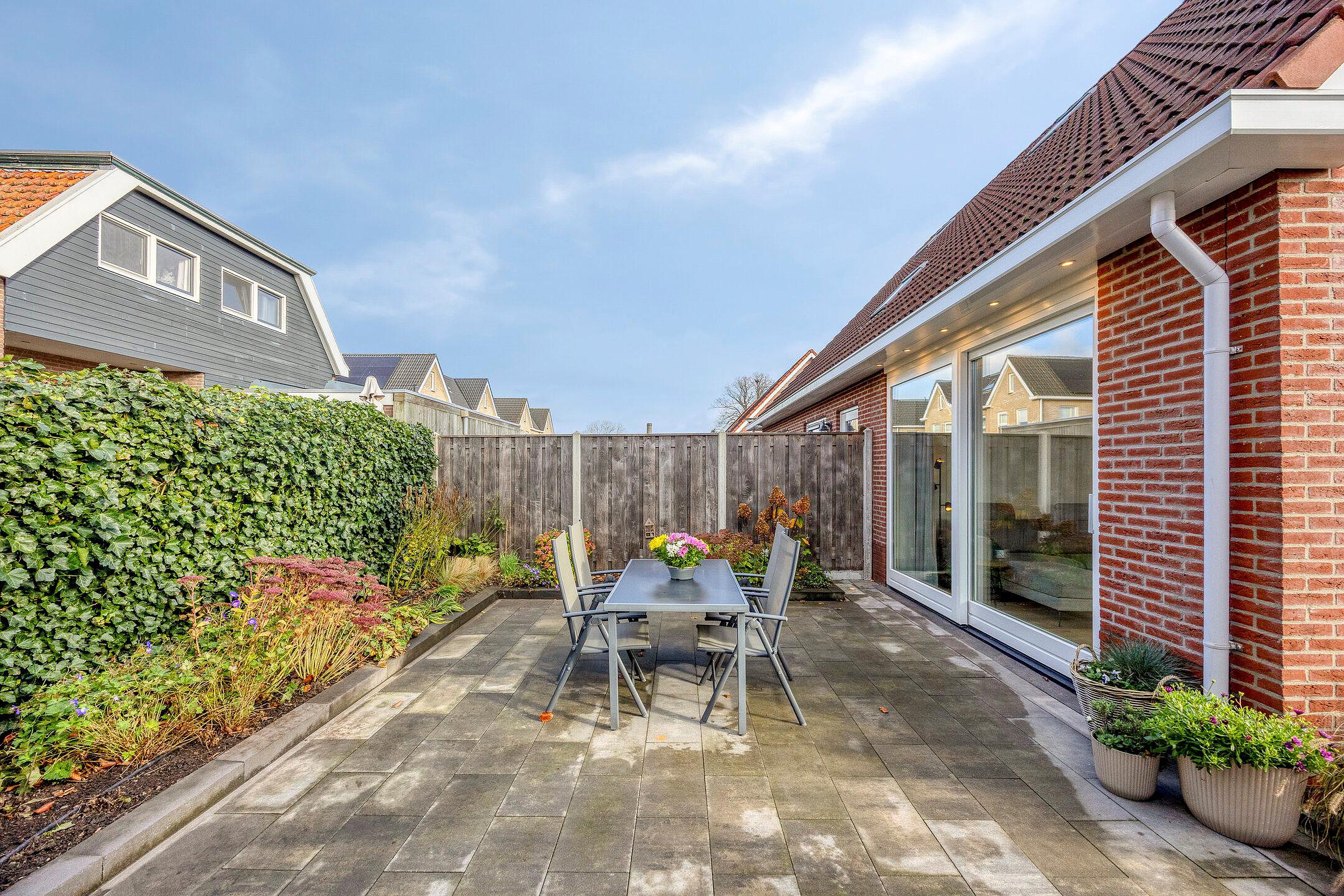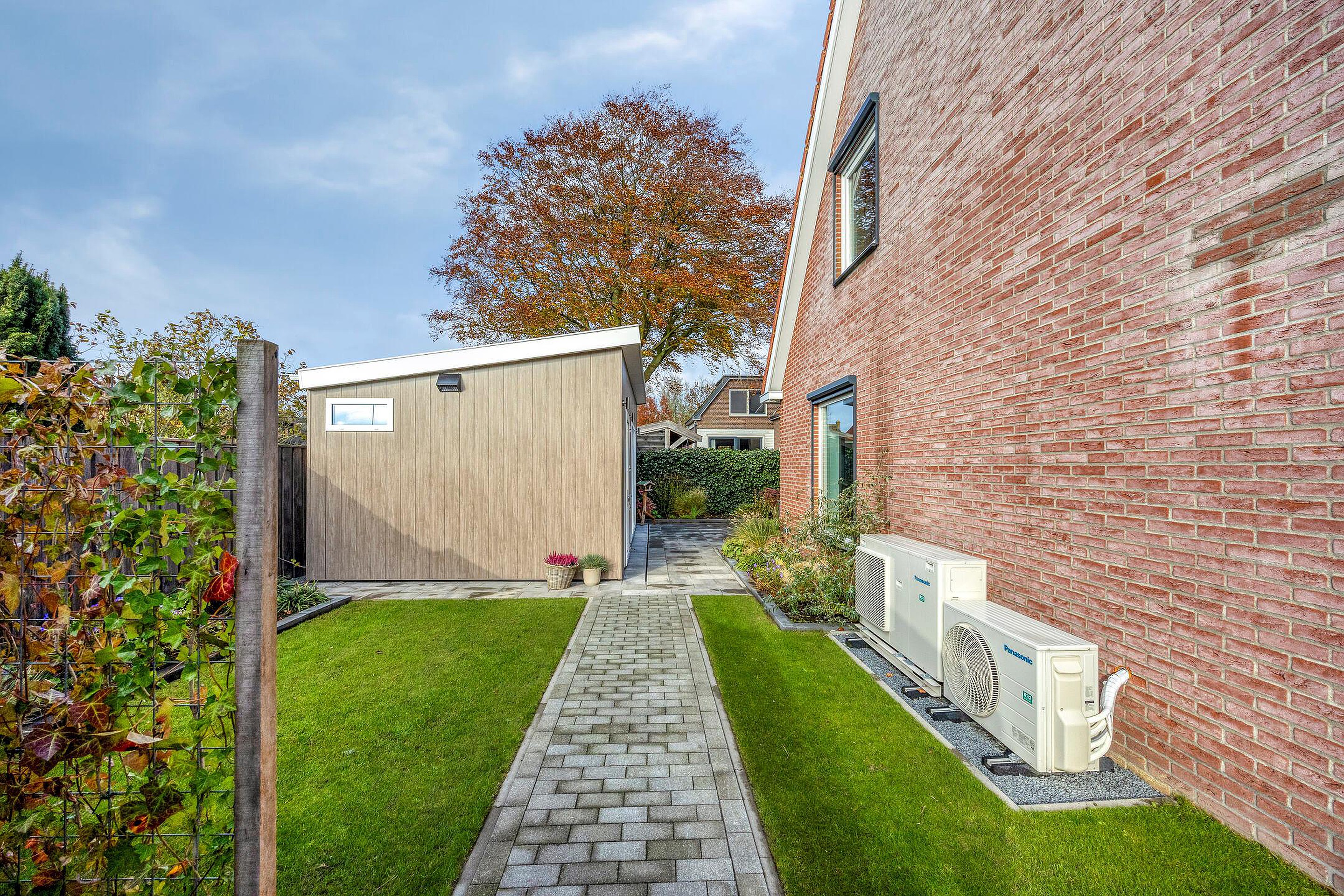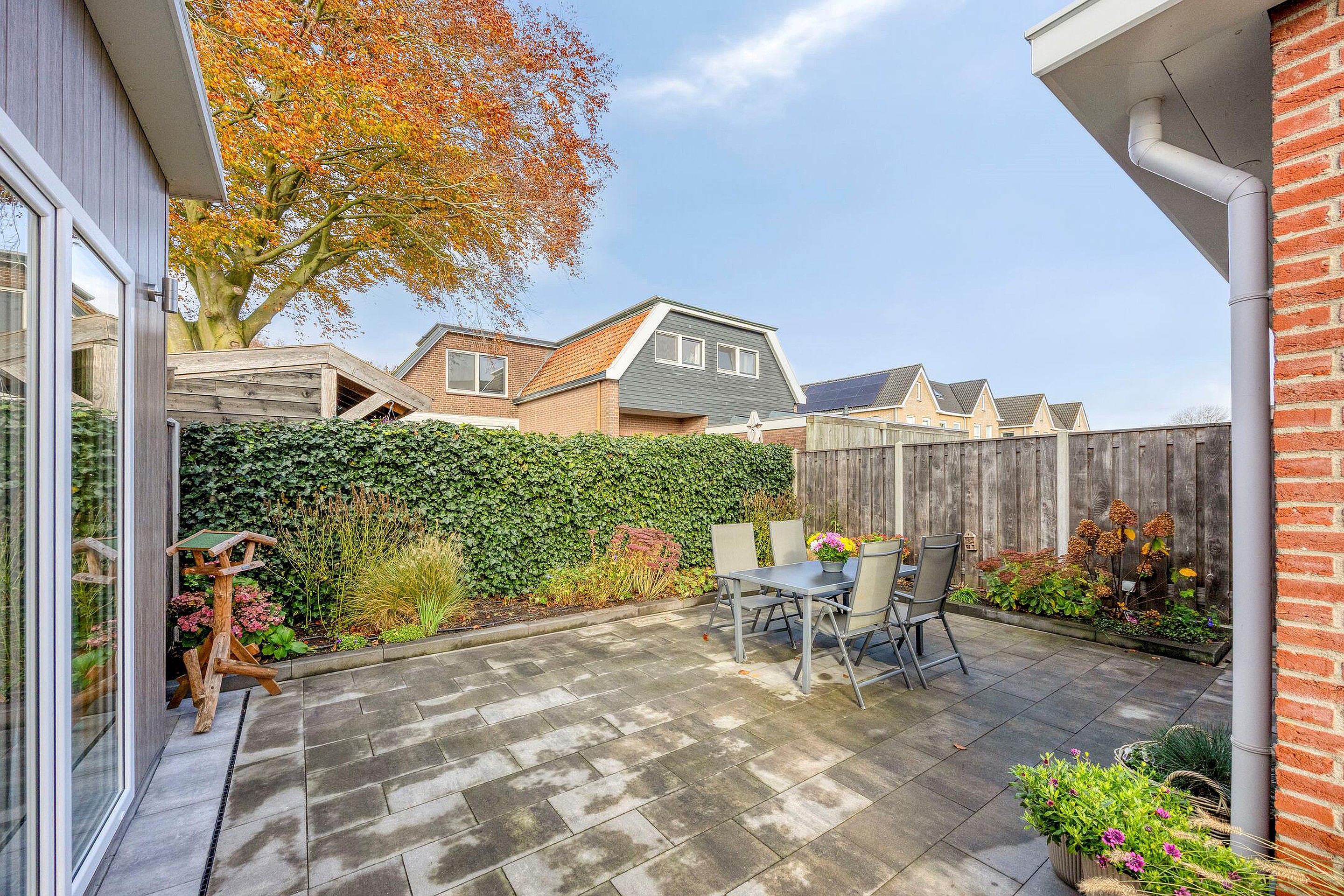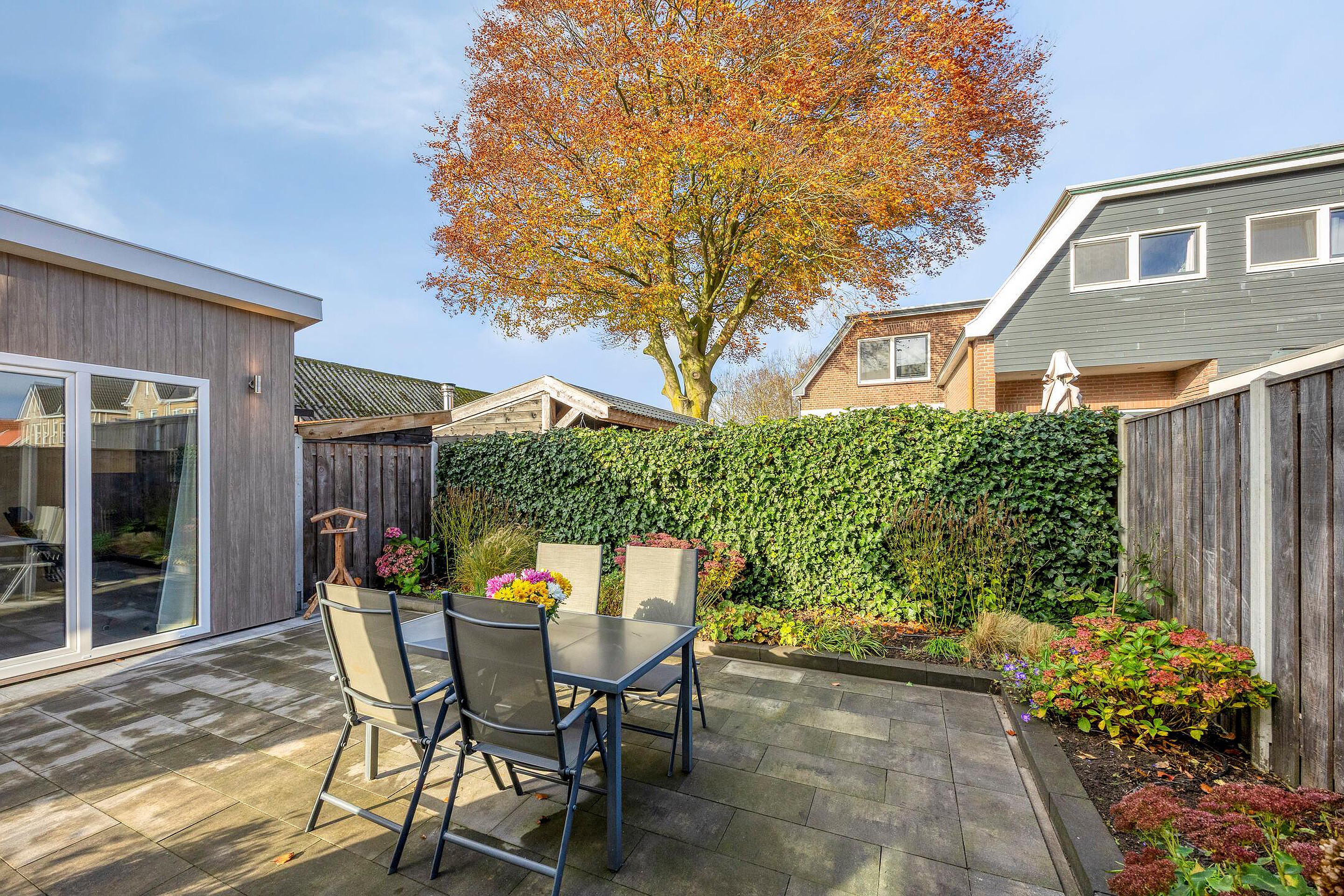 De onderhoudsvriendelijke tuin beschikt over een terras, een grasveld, een houten overkapping, parkeergelegenheid en een tuinhuis met een eigen badkamer. Het geïsoleerde tuinhuis is geschikt voor diverse doeleinden, o.a. gastenverblijf, praktijkruimte of werkstudio.