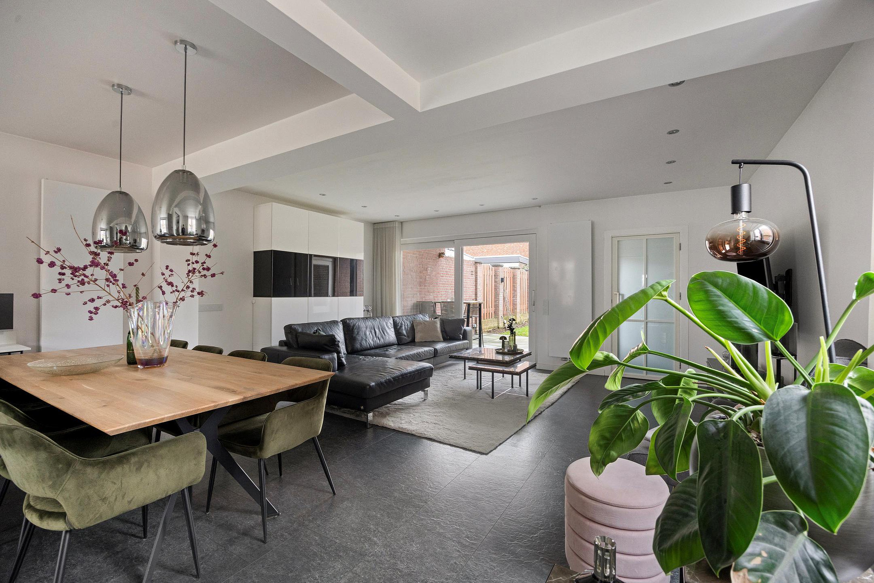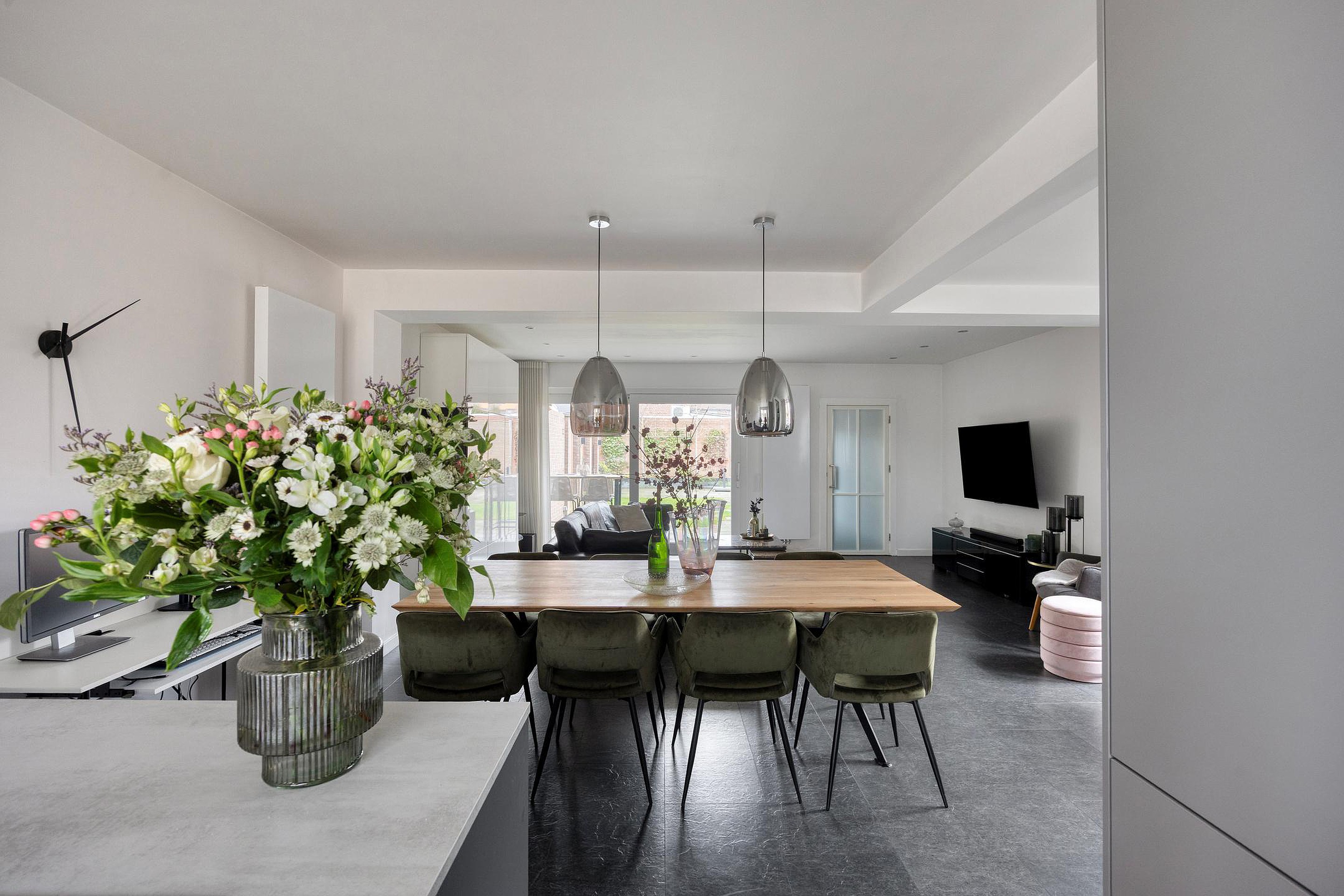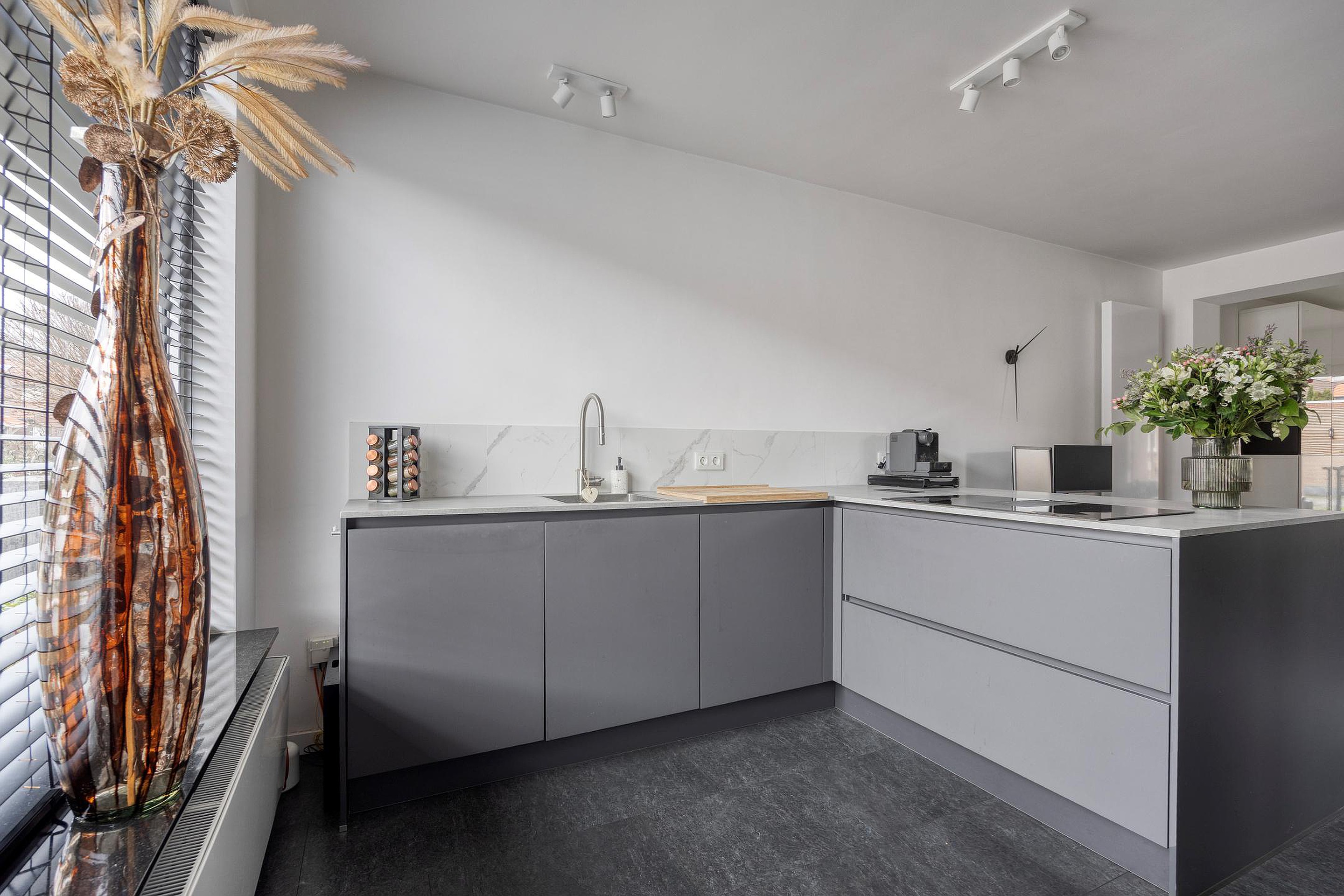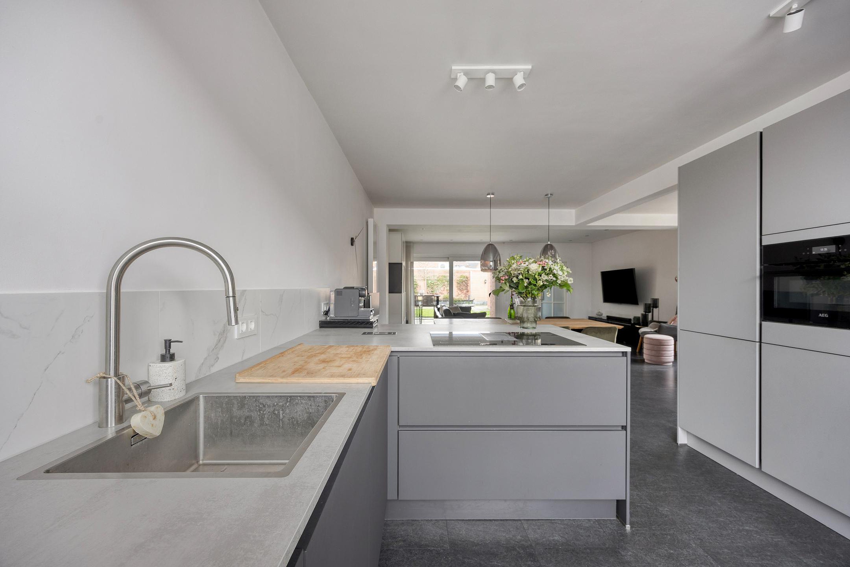Fraaie hal met pvc vloer, garderobe, meterkast (voorzien van 3-fase), toegang naar de living, trap naar eerste verdieping en het geheel betegelde gastentoilet voorzien van verwarming. Bij binnenkomst in de royale living ,middels de stalen deur, valt direct de lichte en sfeervolle leefruimte op, waar wonen en eten naadloos in elkaar overlopen. De stijlvolle, moderne keuken is uitgevoerd in een praktische wandopstelling met onderkasten en loopt door in een L-vormig keukenblok. Dit zorgt niet alleen voor een ruimtelijk gevoel, maar ook voor een efficiënte en comfortabele werkruimte. Het L-gedeelte is voorzien van een rvs spoelbak, vaatwasser en een 4-pits inductiekookplaat met geïntegreerde afzuiging. Het robuuste betonlook werkblad geeft de keuken een stoere, eigentijdse uitstraling en is tegelijkertijd onderhoudsvriendelijk. Aan de overzijde bevindt zich een royale kastenwand met een hoge koelkast, oven en combimagnetron. Alle inbouwapparatuur is van het hoogwaardige merk AEG, wat garant staat voor kwaliteit, gebruiksgemak en duurzaamheid. Aangrenzend aan de living is de bijkeuken, hier bevinden zich de aansluitingen voor het witgoed en de Remeha Avanta cv-ketel. Zowel vanuit de bijkeuken als de living is de achtertuin bereikbaar.
