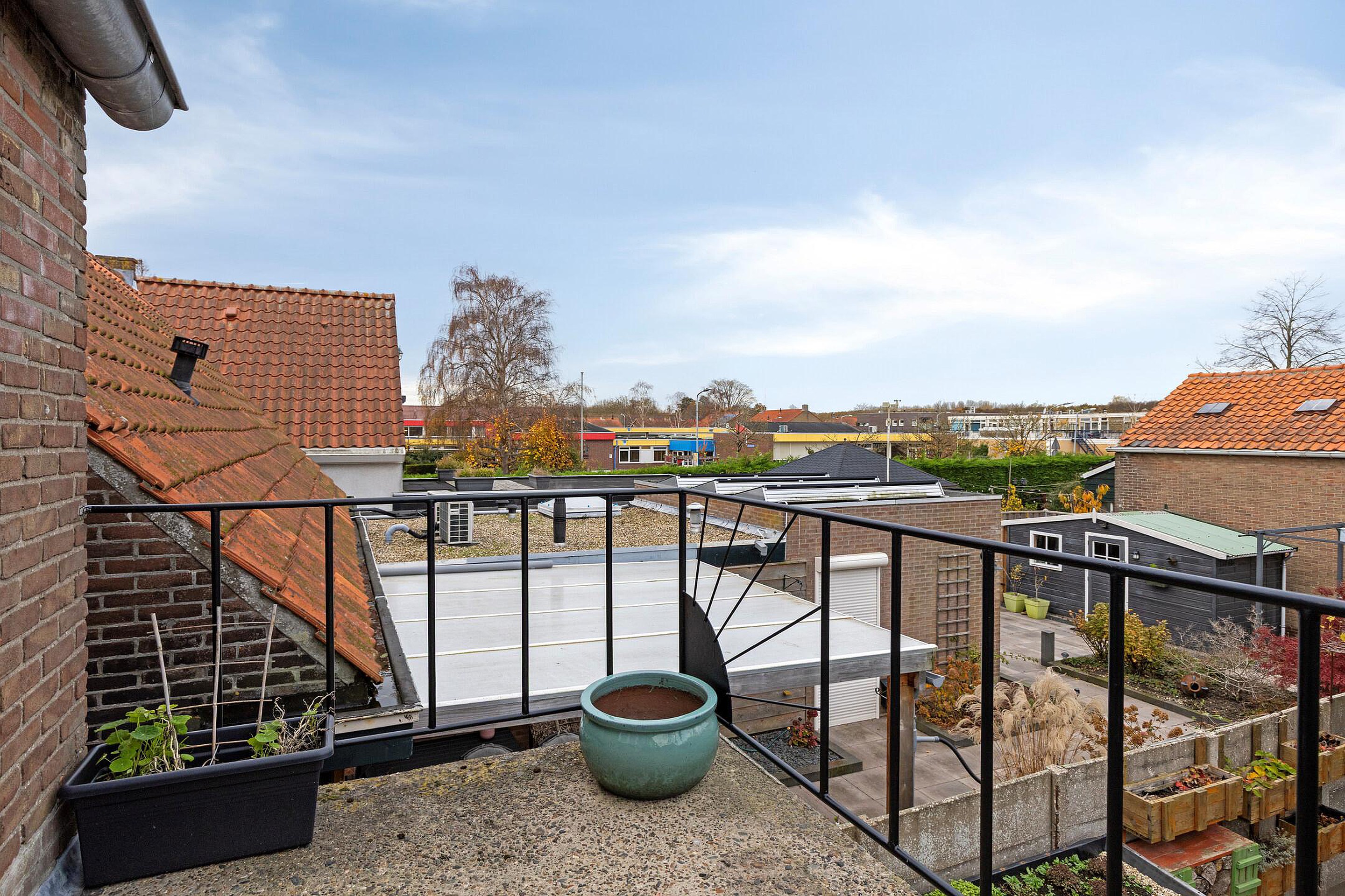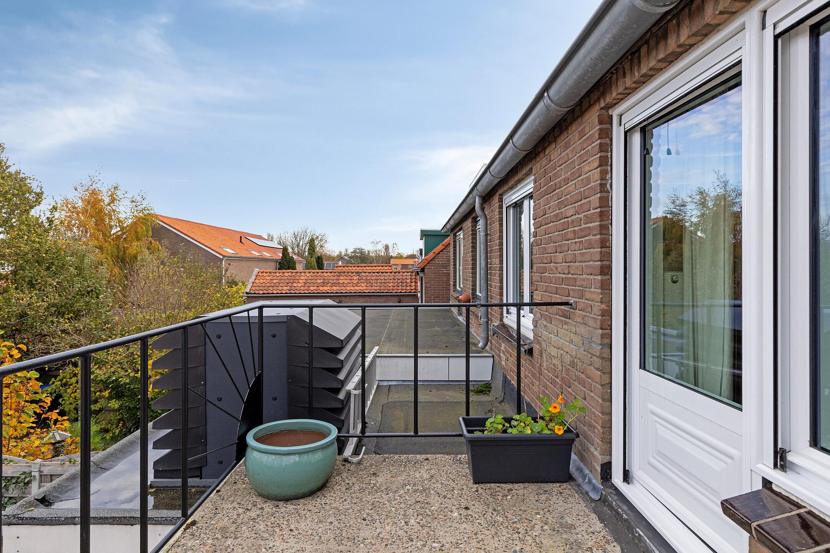Aan de achterzijde biedt het balkon een beschutte plek voor een kop koffie in de ochtendzon.