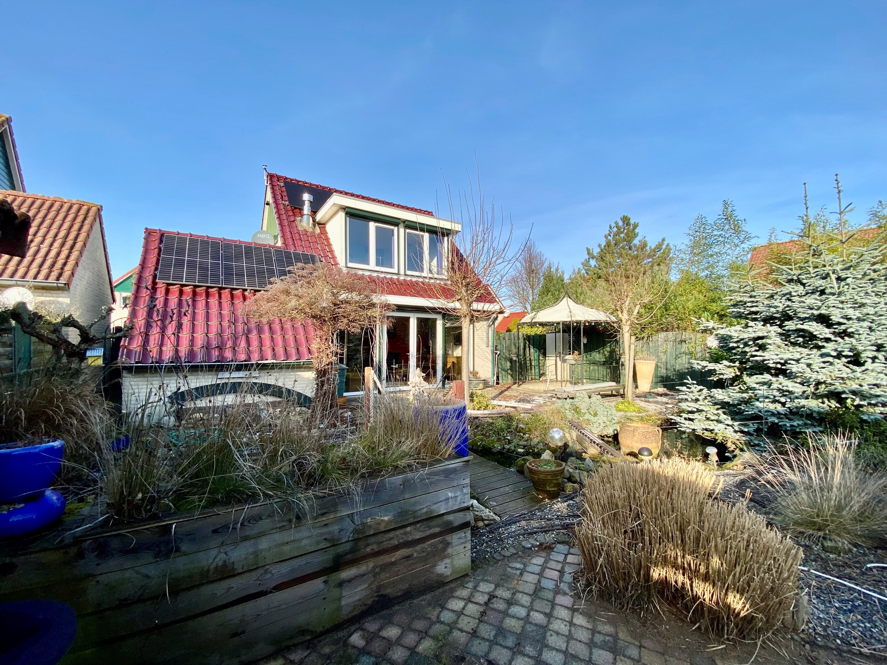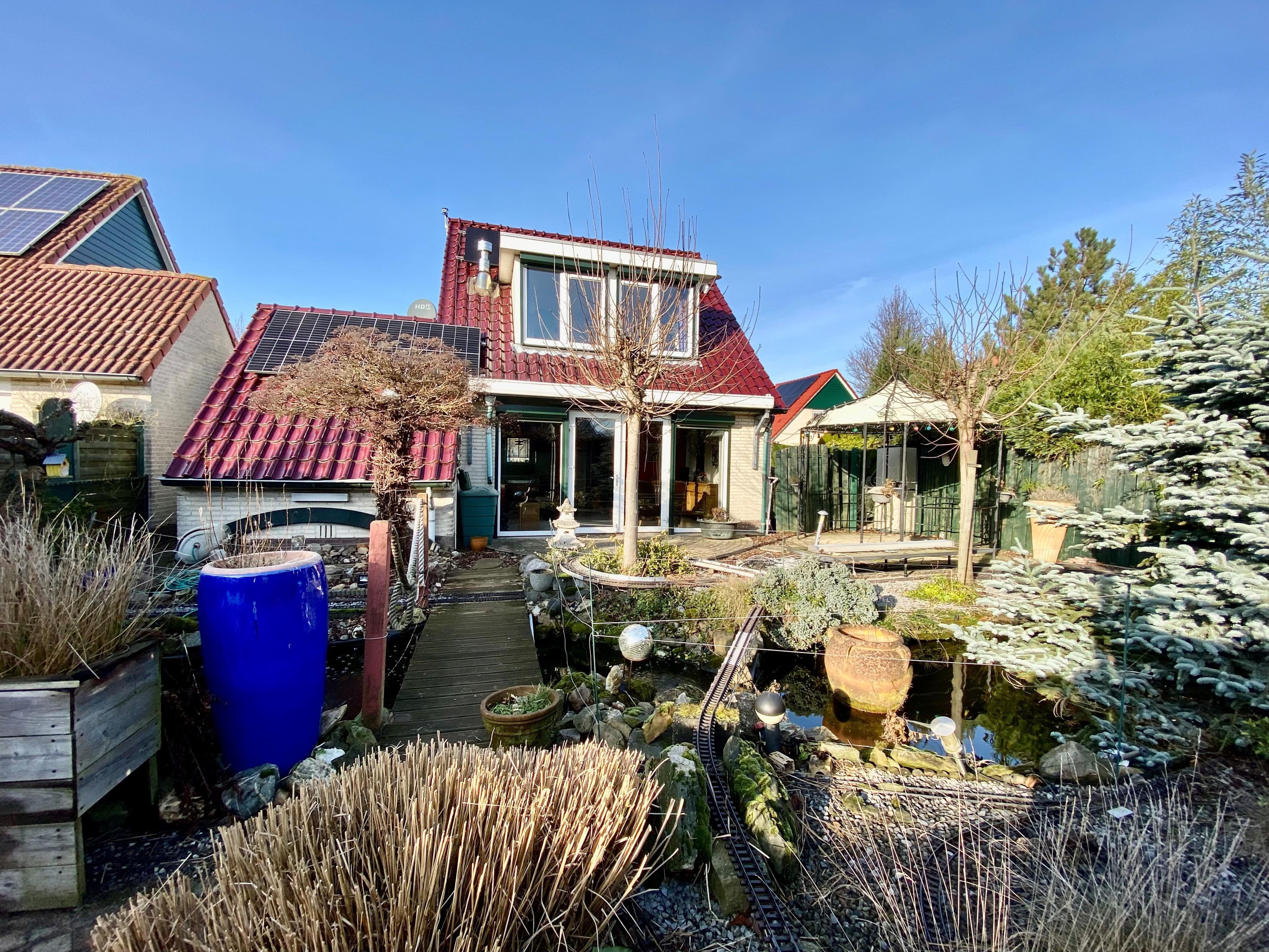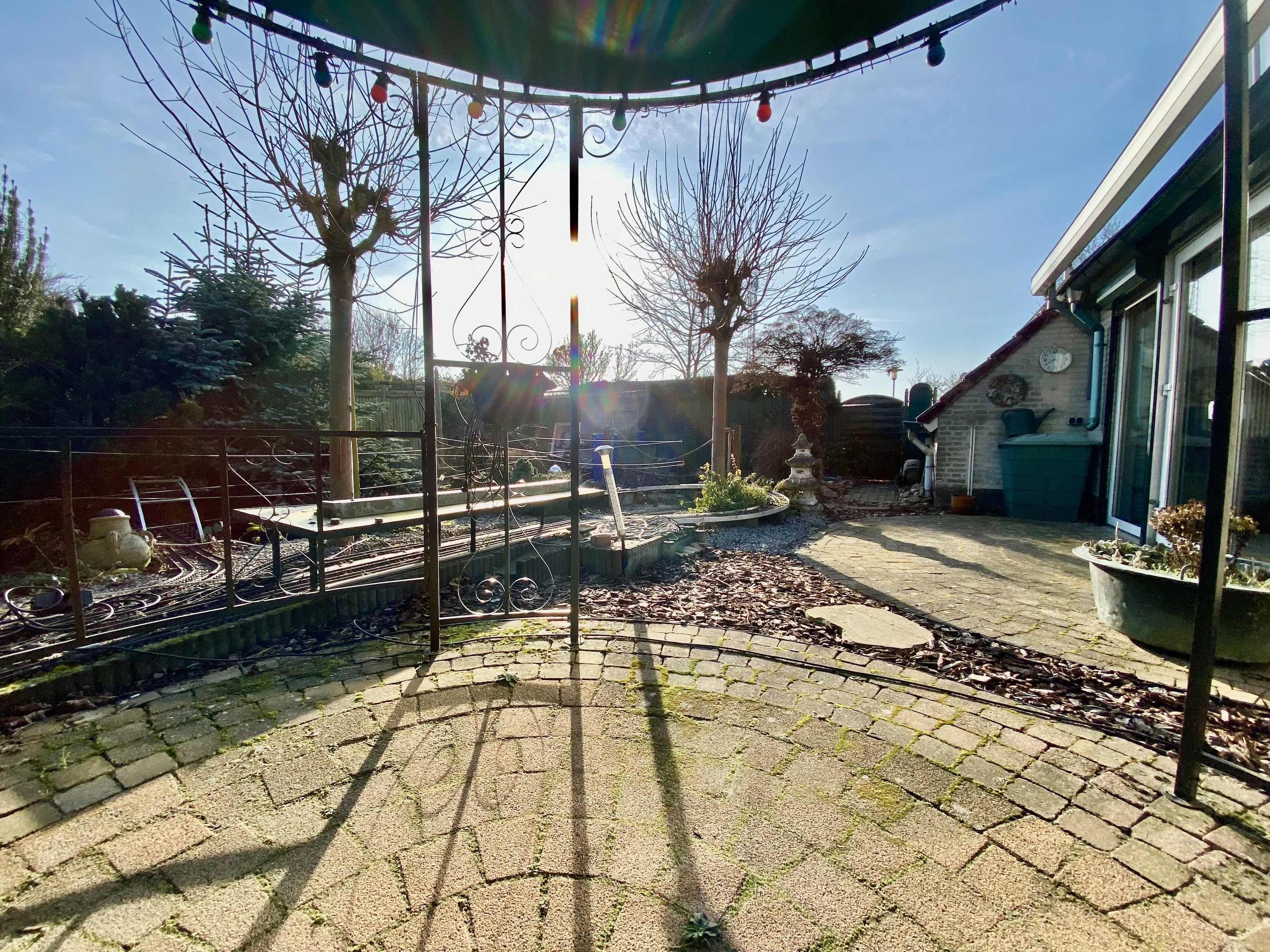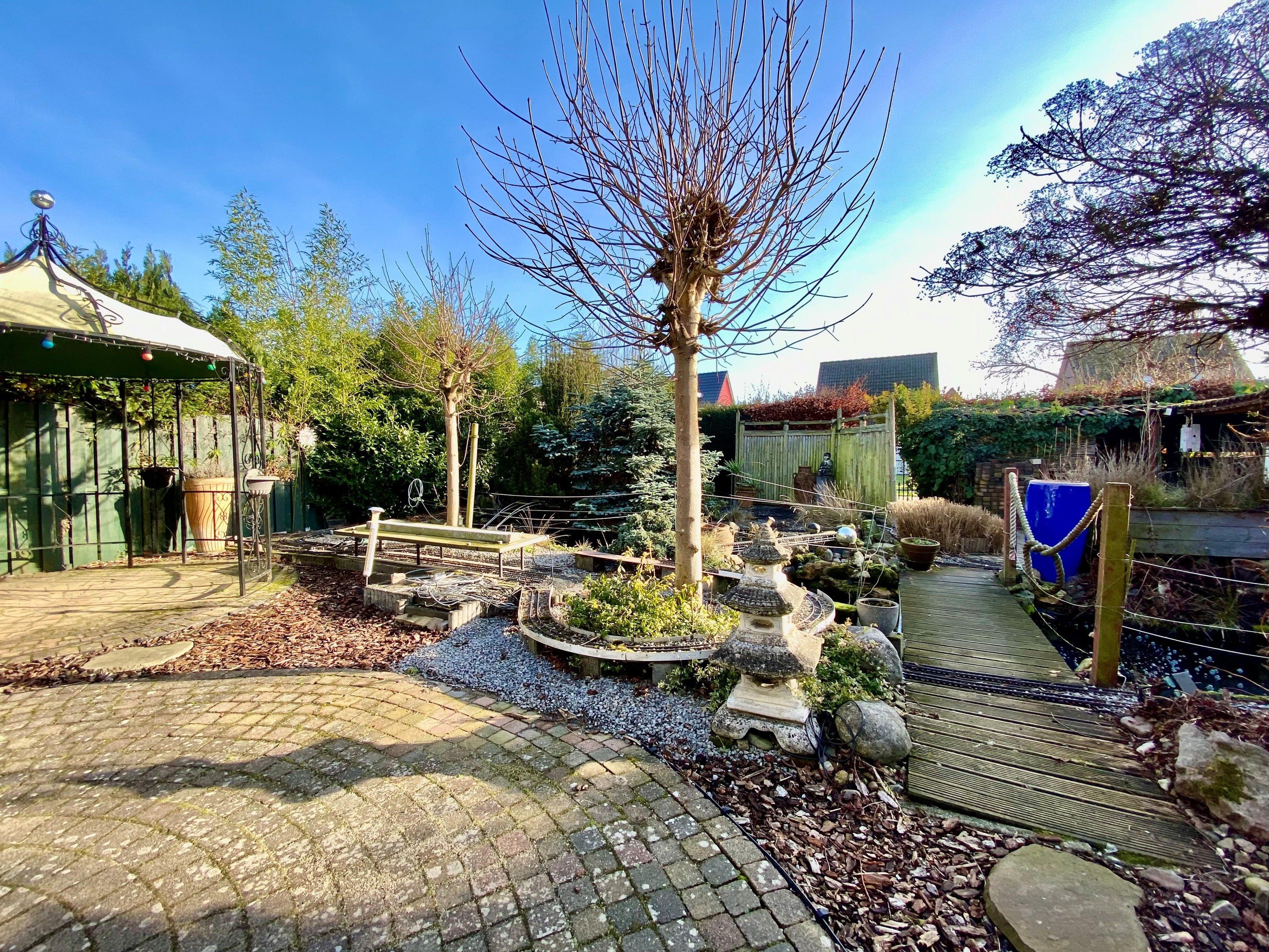 De fraai aangelegde tuin, gelegen op het zuidoosten, biedt volop rust en privacy. De tuin is volledig omheind en voorzien van een ruim terras, een overkapping met zitgedeelte, een vijverpartij en een gevarieerde beplanting met bloemen, struiken en planten.