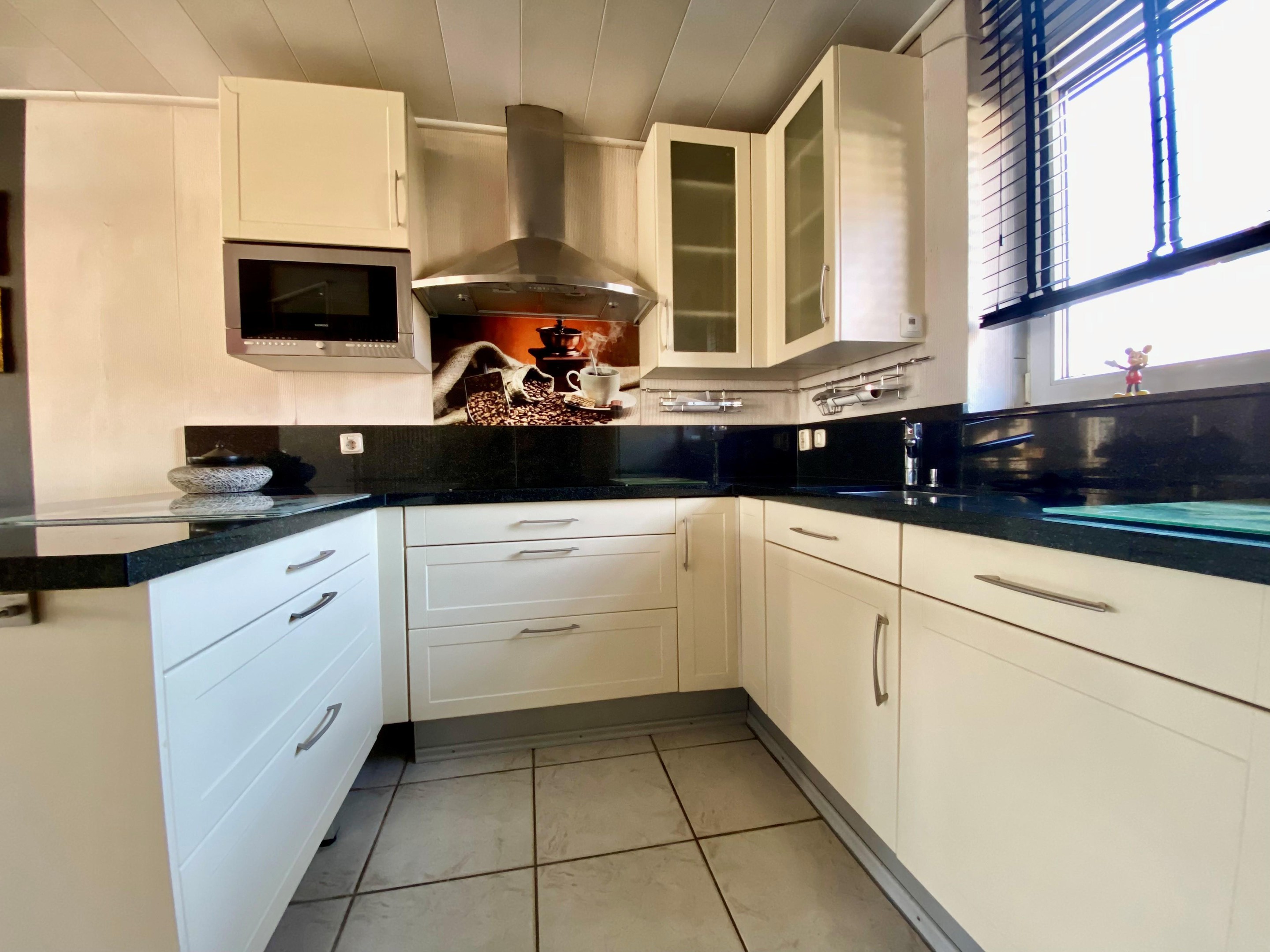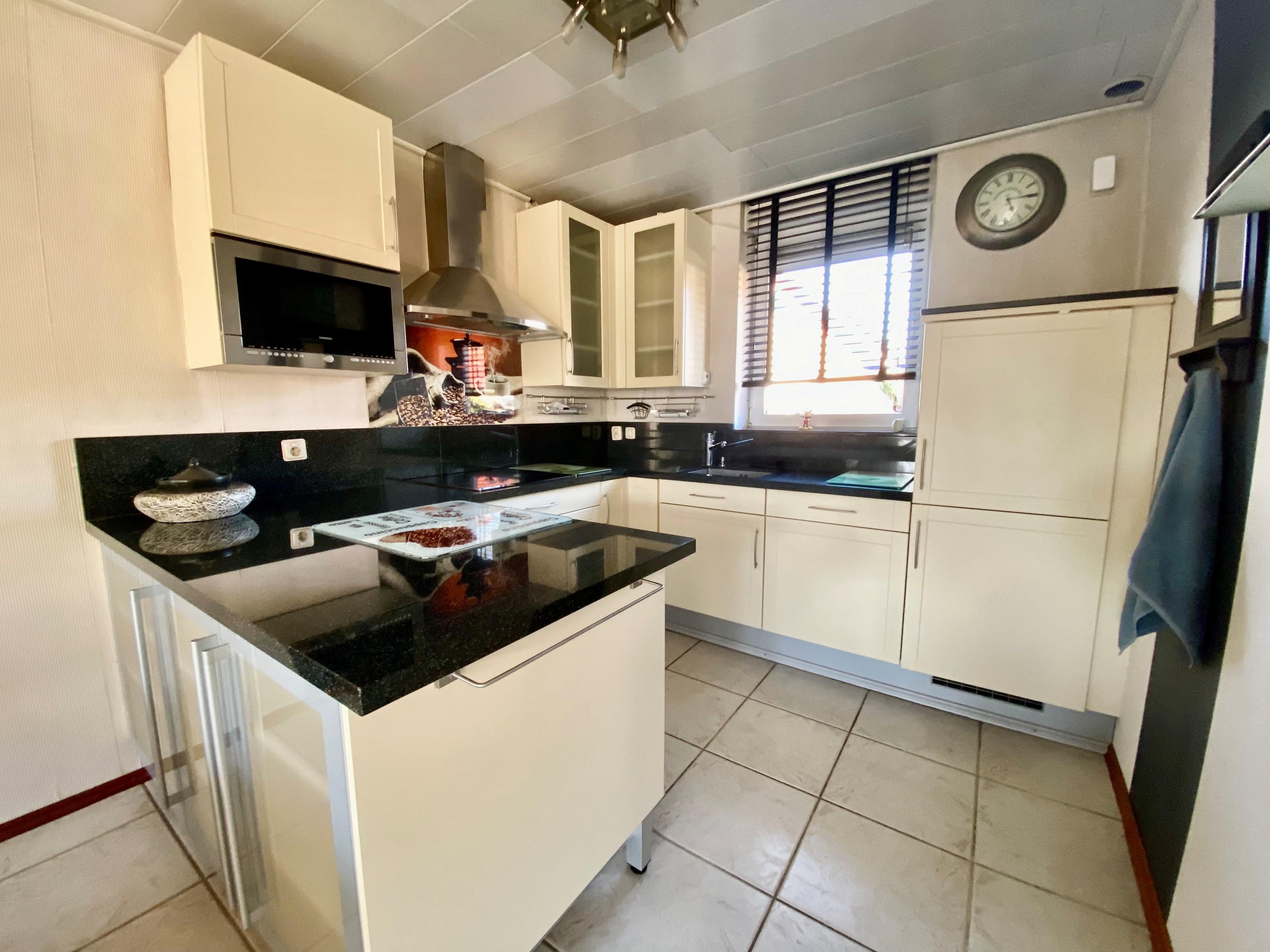 De open keuken in U-opstelling is compleet uitgerust met diverse inbouwapparatuur, waaronder een inductiekookplaat, afzuigkap, combimagnetron, koelkast met vriesvak en vaatwasser. Het geheel wordt gecompleteerd door ruime opbergkasten, lades en een granieten werkblad.