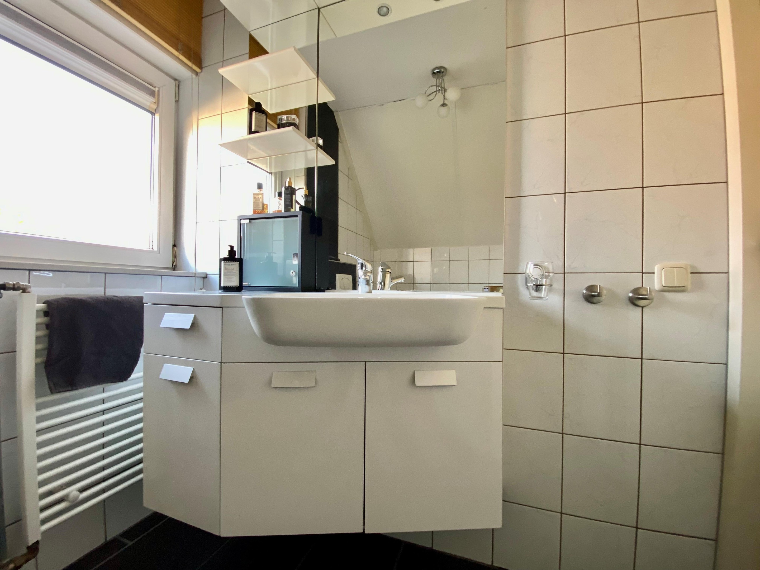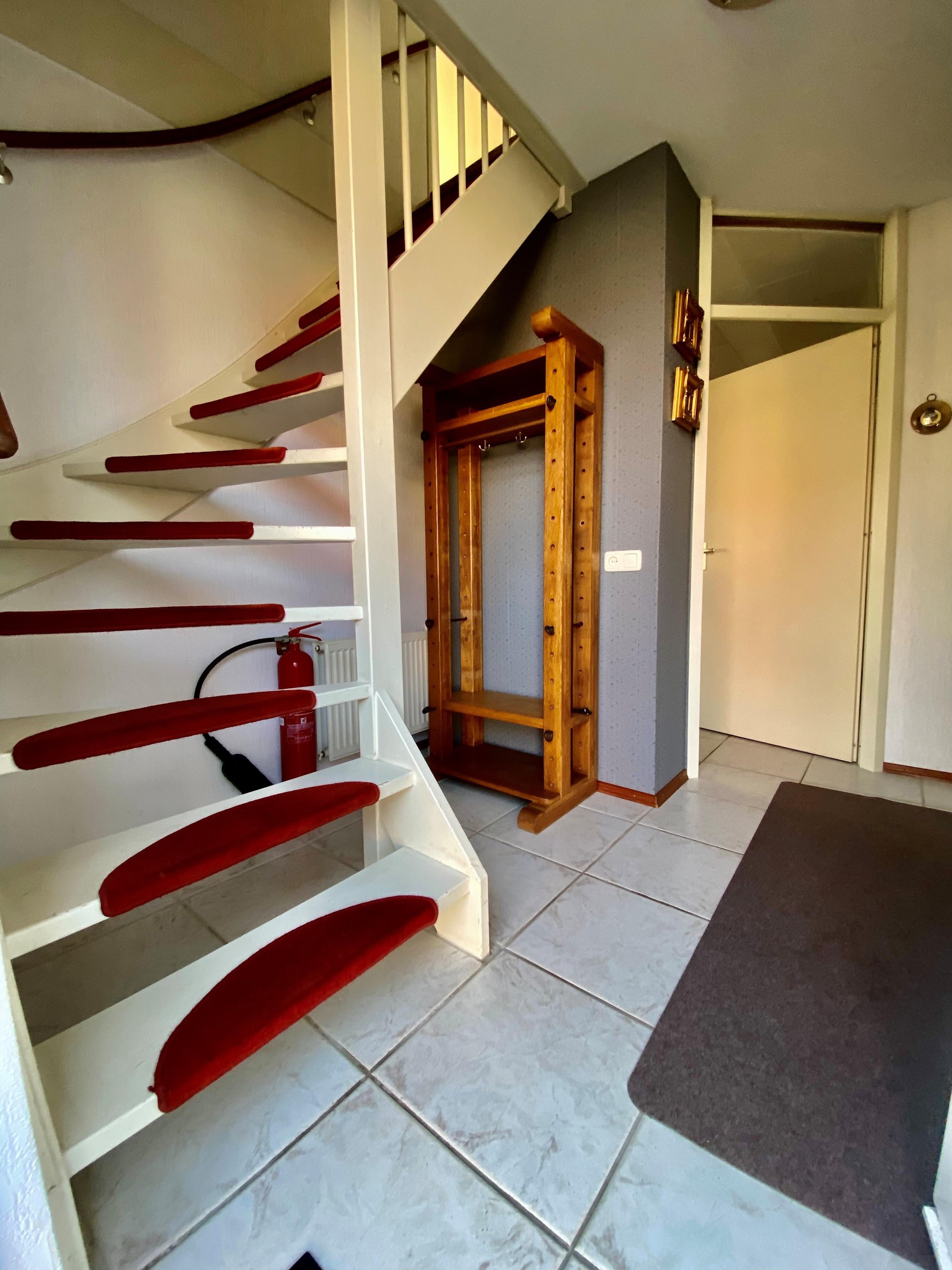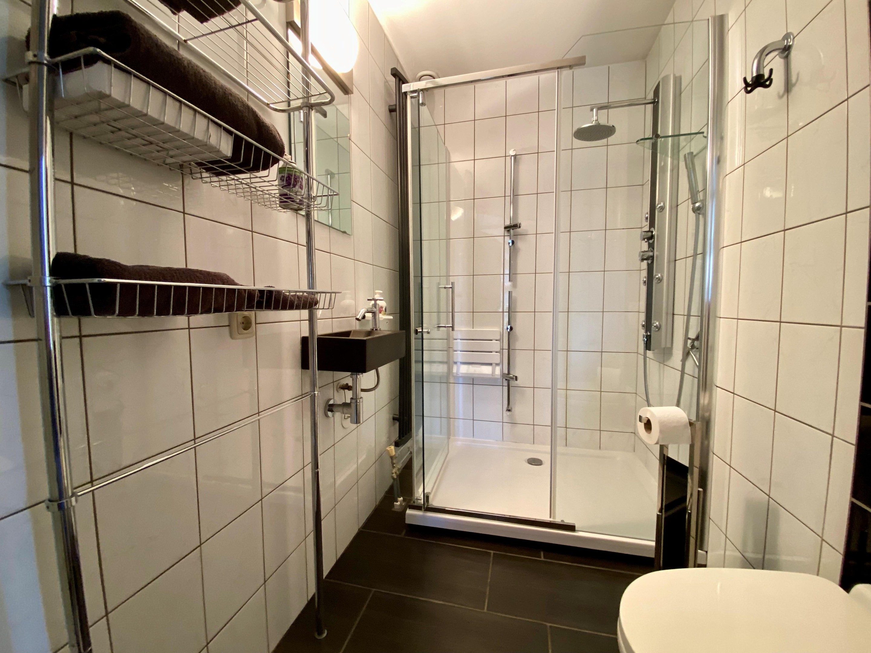 Vanuit de hal is tevens de badkamer op de begane grond toegankelijk, voorzien van een ruime douchecabine, toilet en wastafel, evenals de trap naar de eerste verdieping.