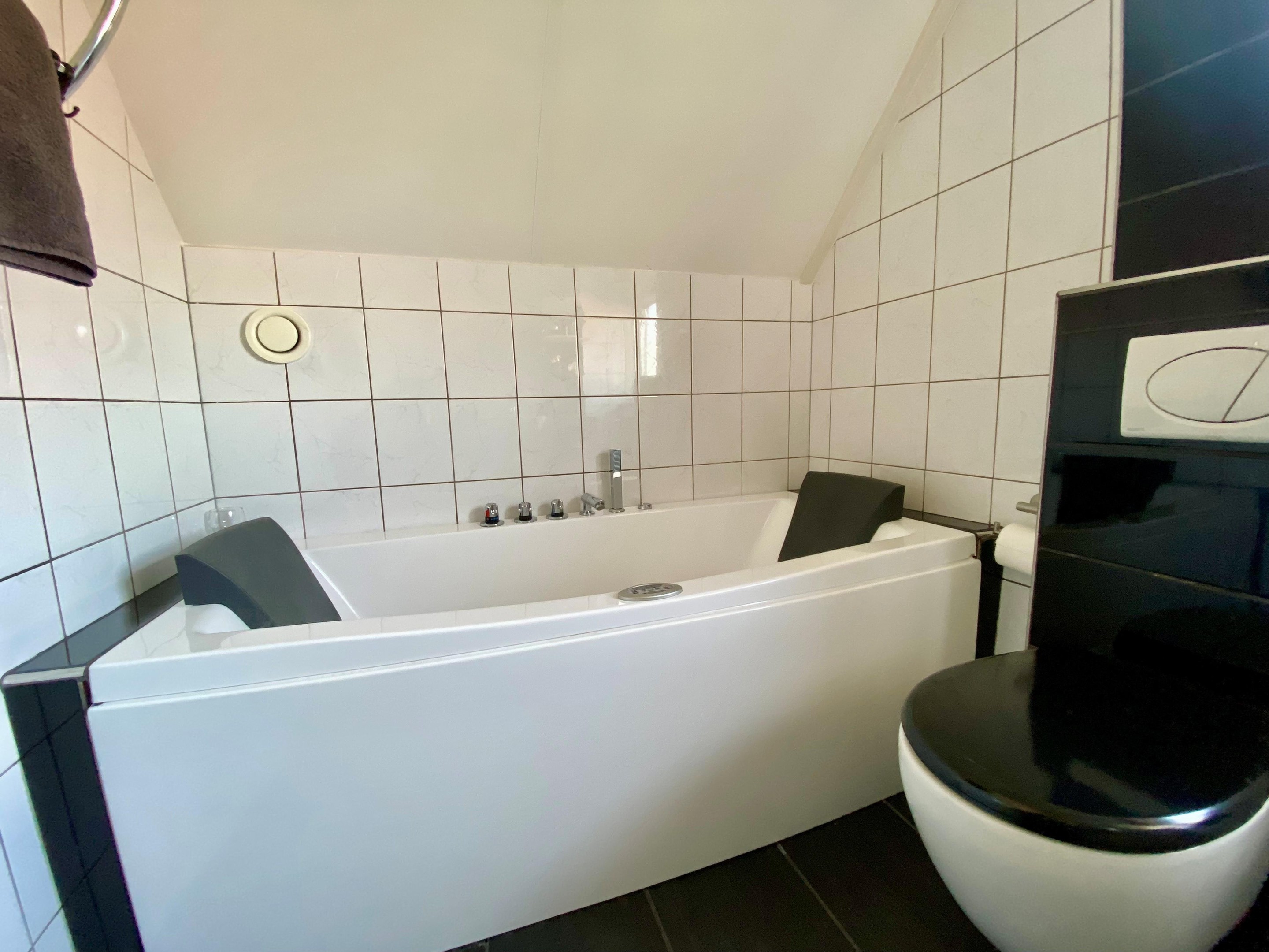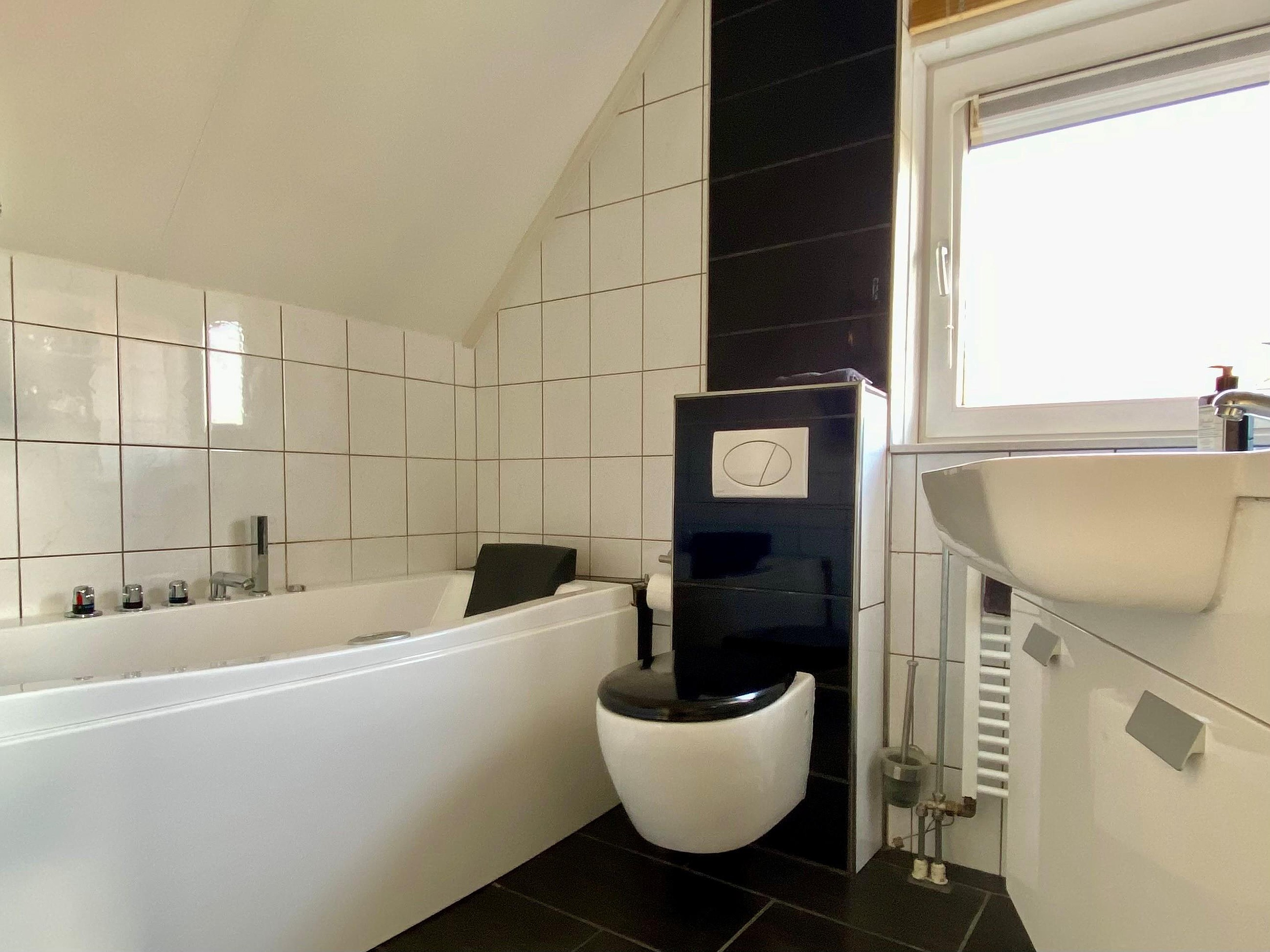 De moderne, volledig betegelde badkamer is uitgerust met een bubbelbad, toilet en wastafelmeubel.