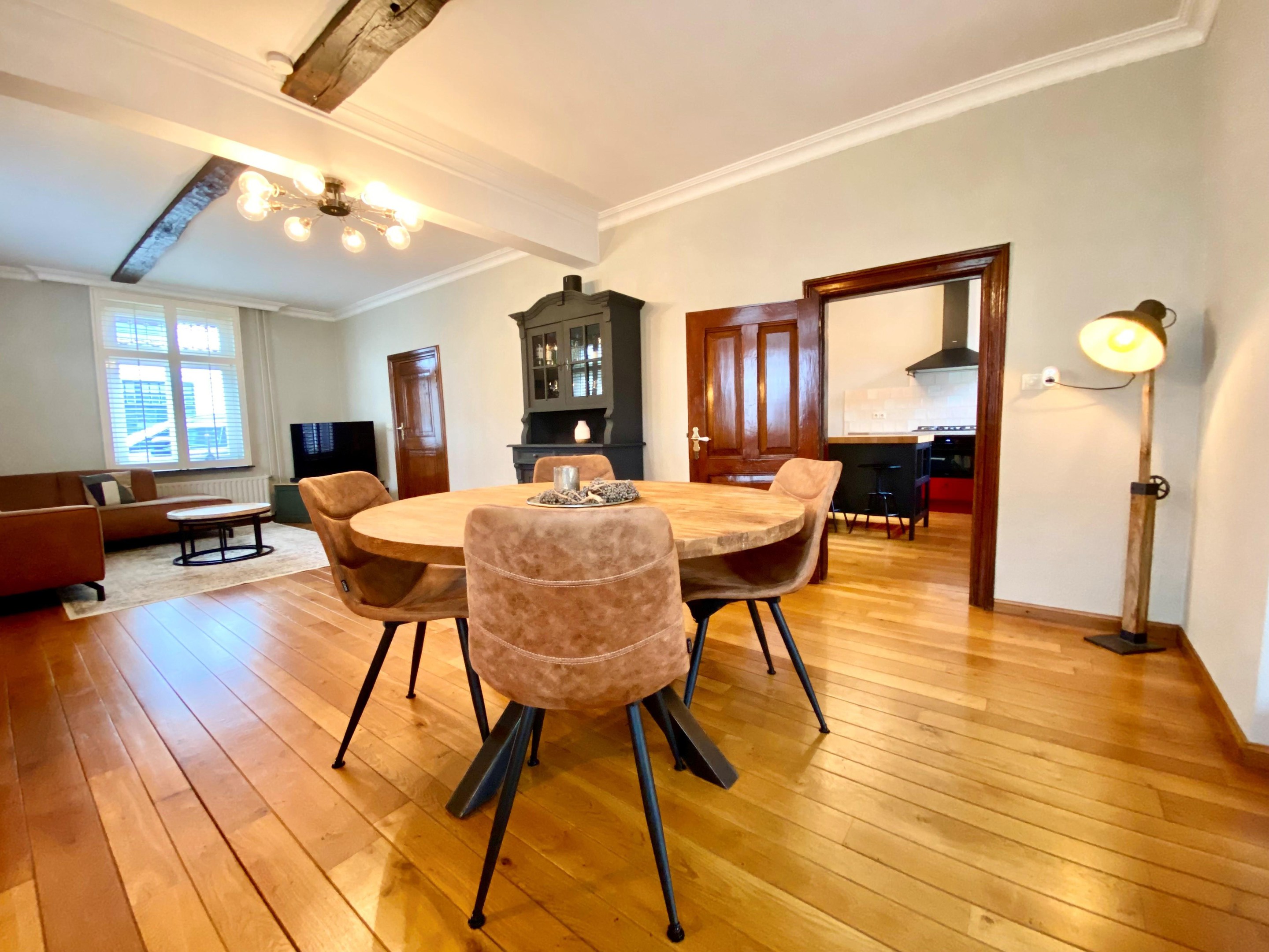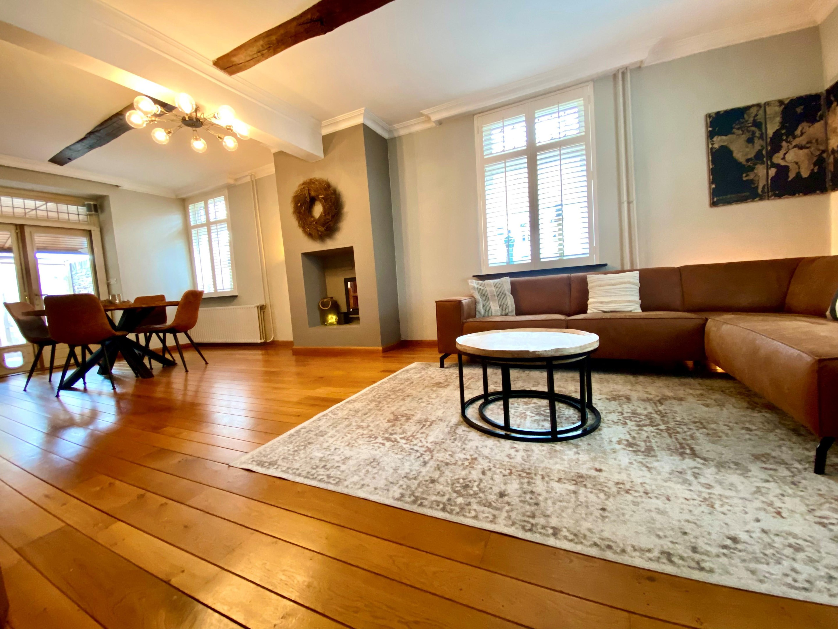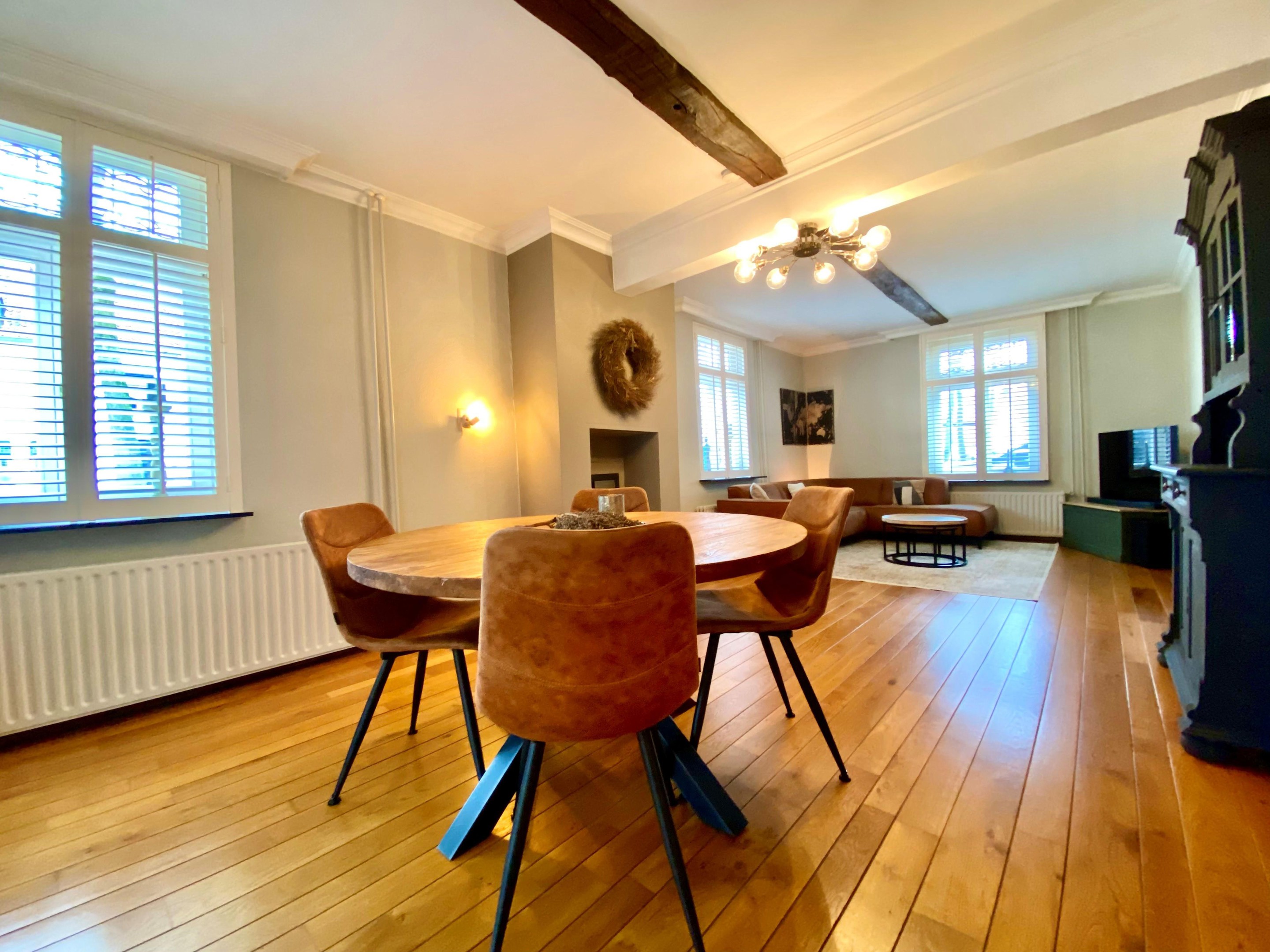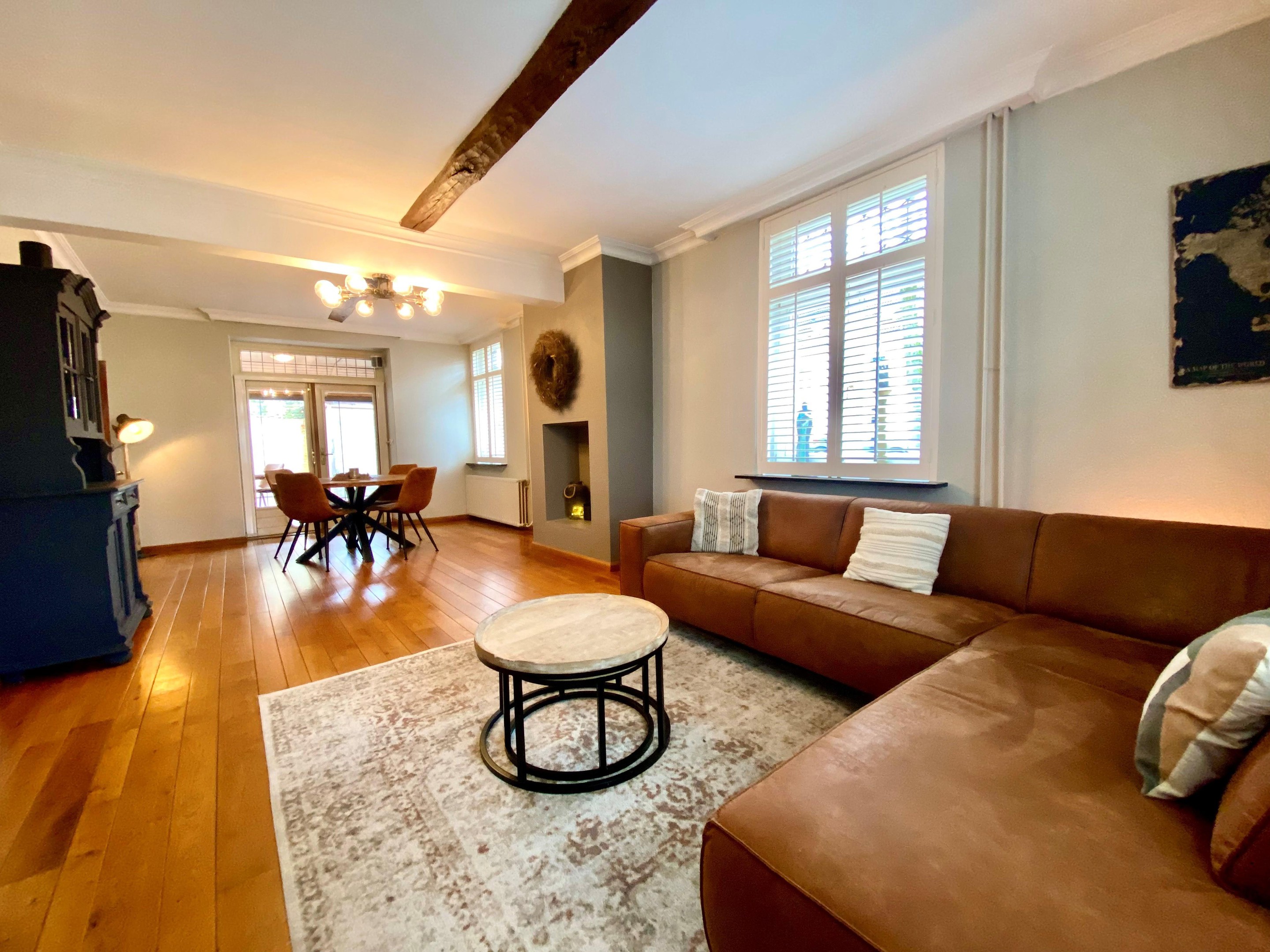 De woonkamer is warm en knus, met een doorlopende houten vloer en charmante raampartijen voorzien van glas-in-lood en shutters. Het licht speelt hier prachtig naar binnen en zorgt op ieder moment van de dag voor een fijne sfeer. Dit is een plek waar je ’s avonds met een glas wijn neerstrijkt, waar gesprekken vanzelf langer duren en waar elk seizoen zijn eigen charme heeft.