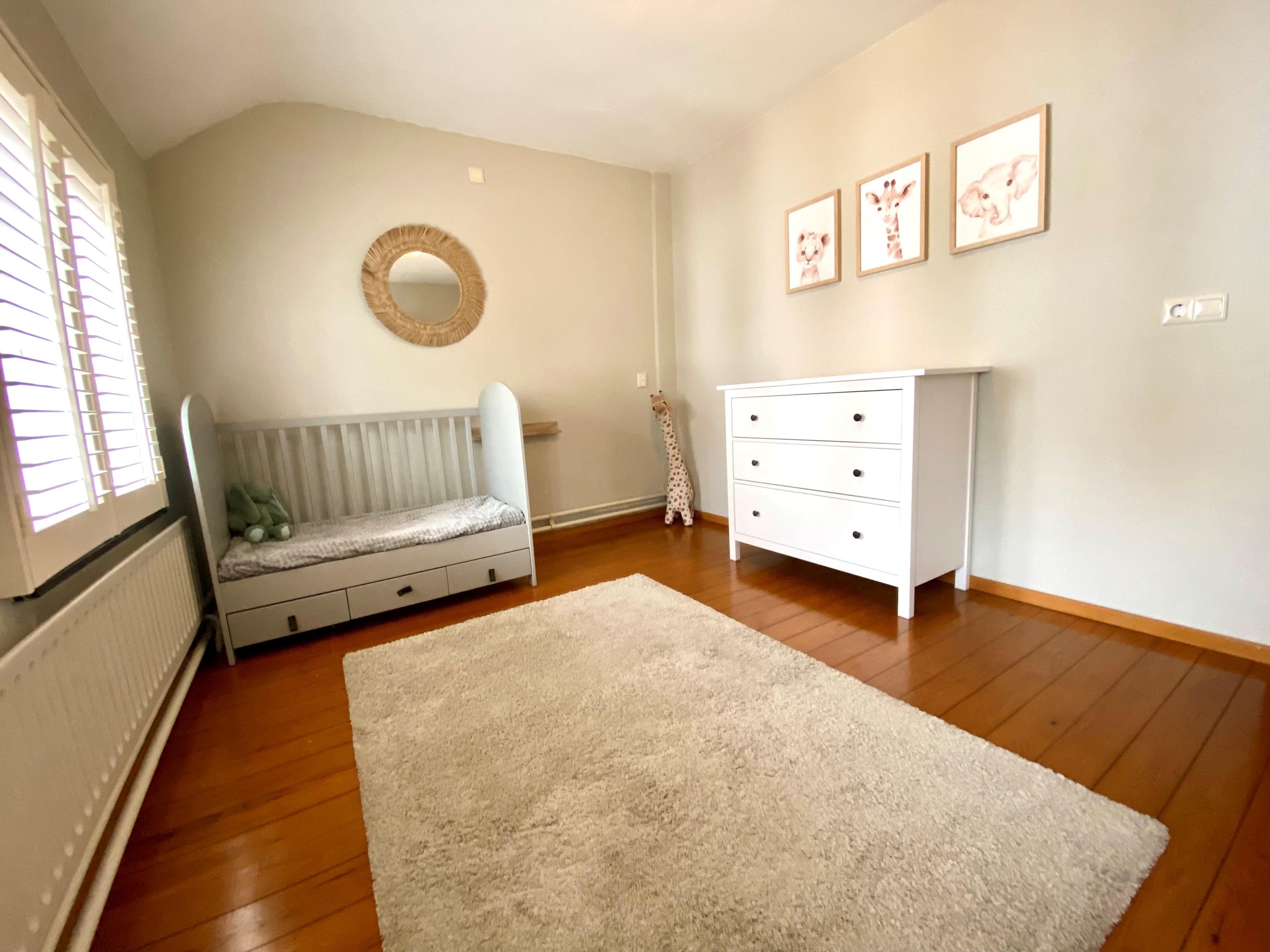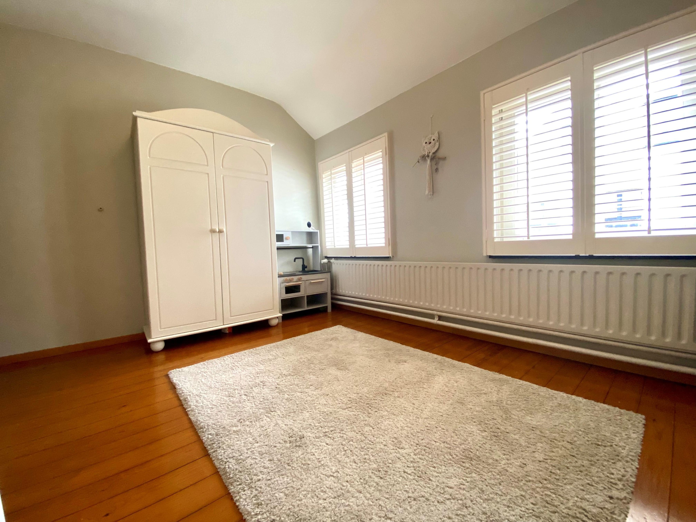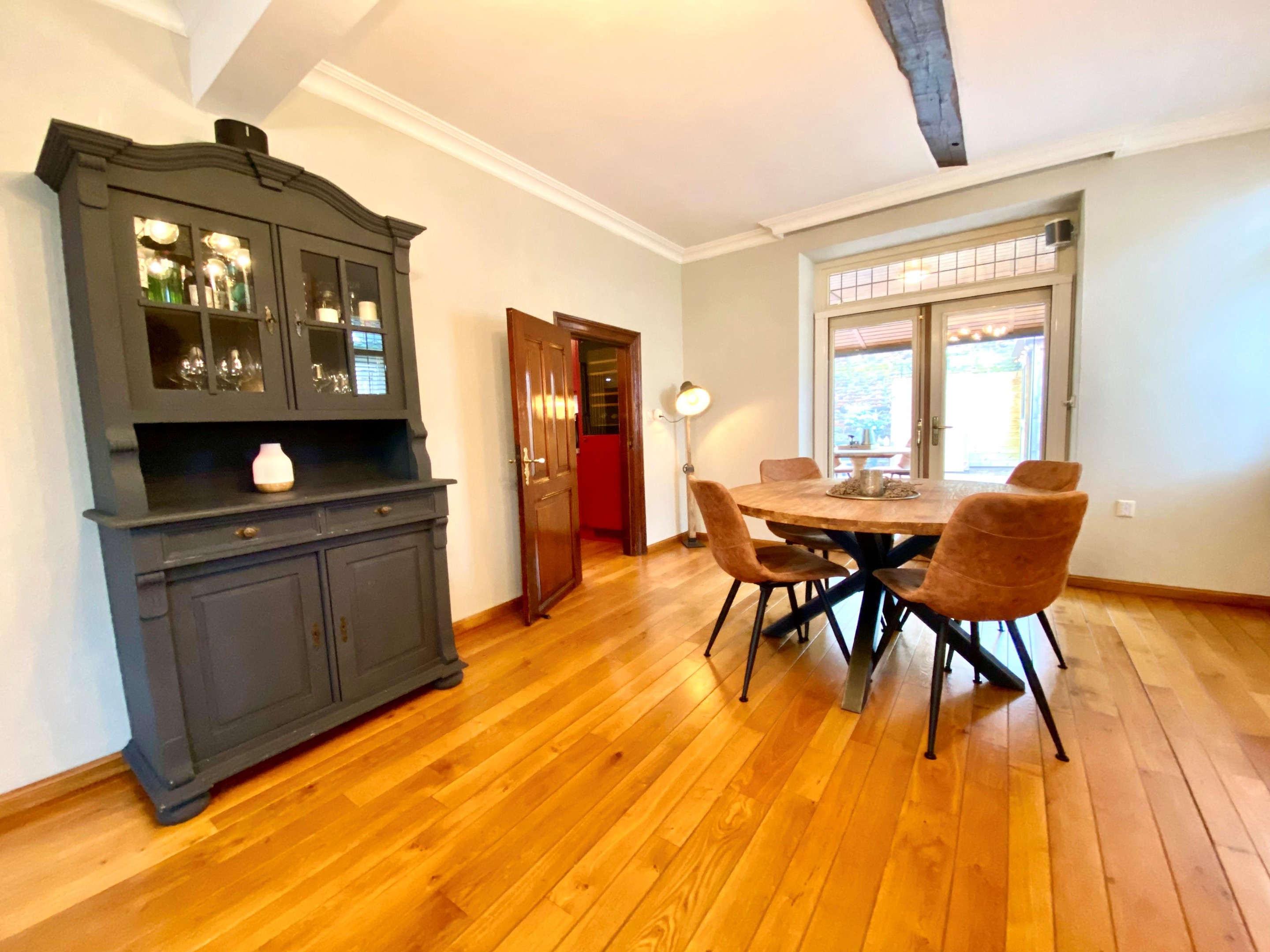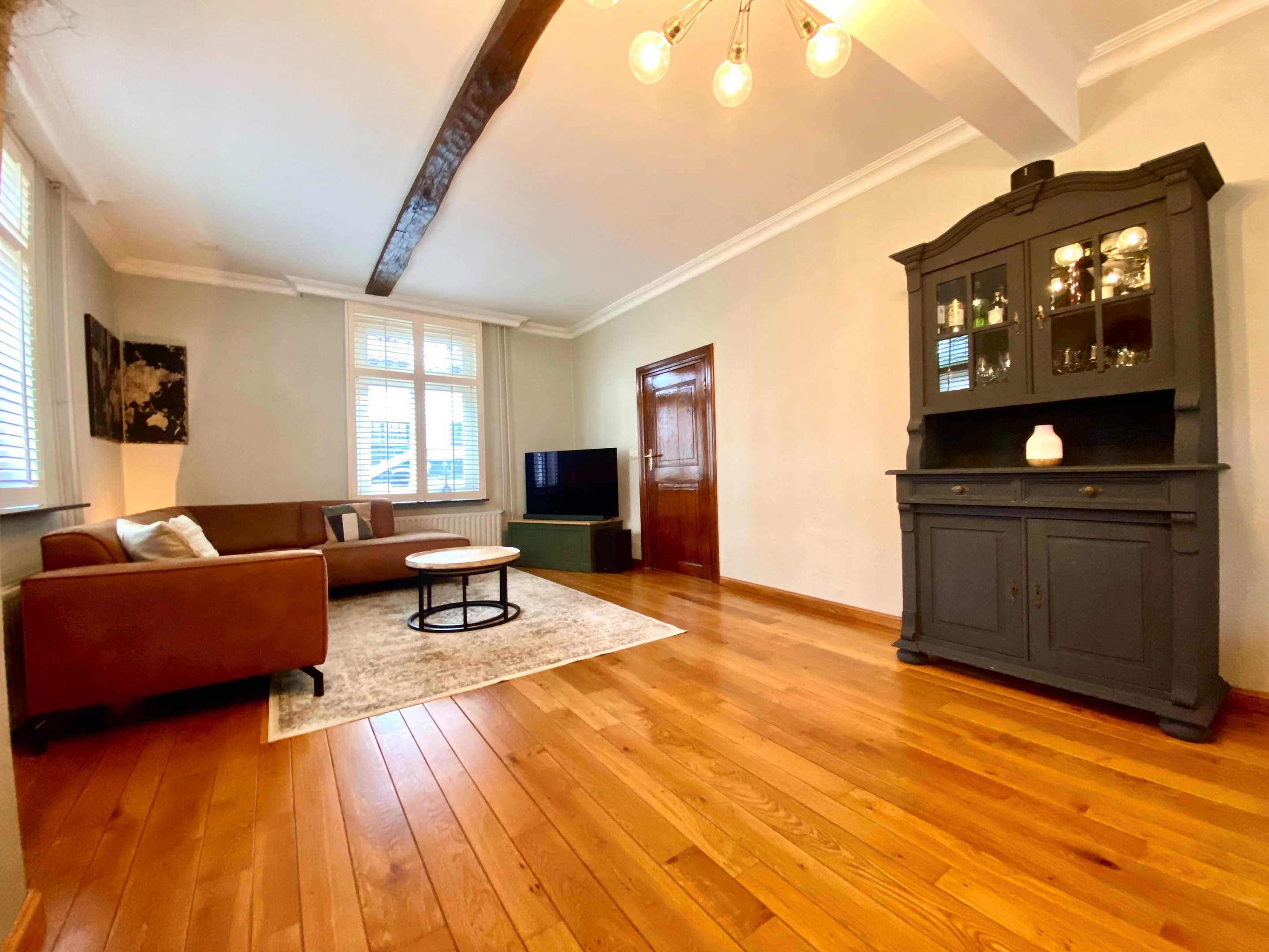 De woonkamer is warm en knus, met een doorlopende houten vloer en charmante raampartijen voorzien van glas-in-lood en shutters. Het licht speelt hier prachtig naar binnen en zorgt op ieder moment van de dag voor een fijne sfeer. Dit is een plek waar je ’s avonds met een glas wijn neerstrijkt, waar gesprekken vanzelf langer duren en waar elk seizoen zijn eigen charme heeft.
