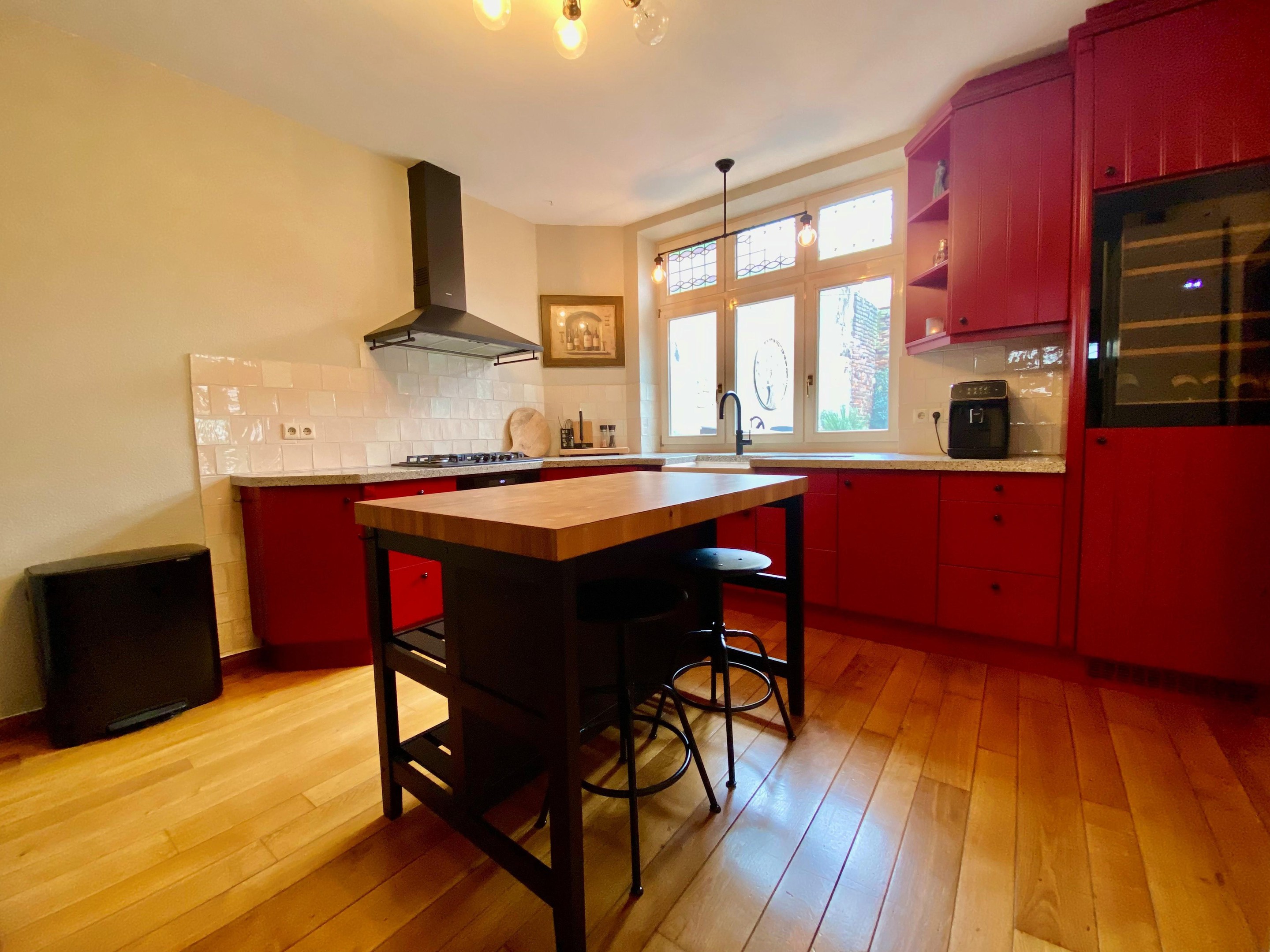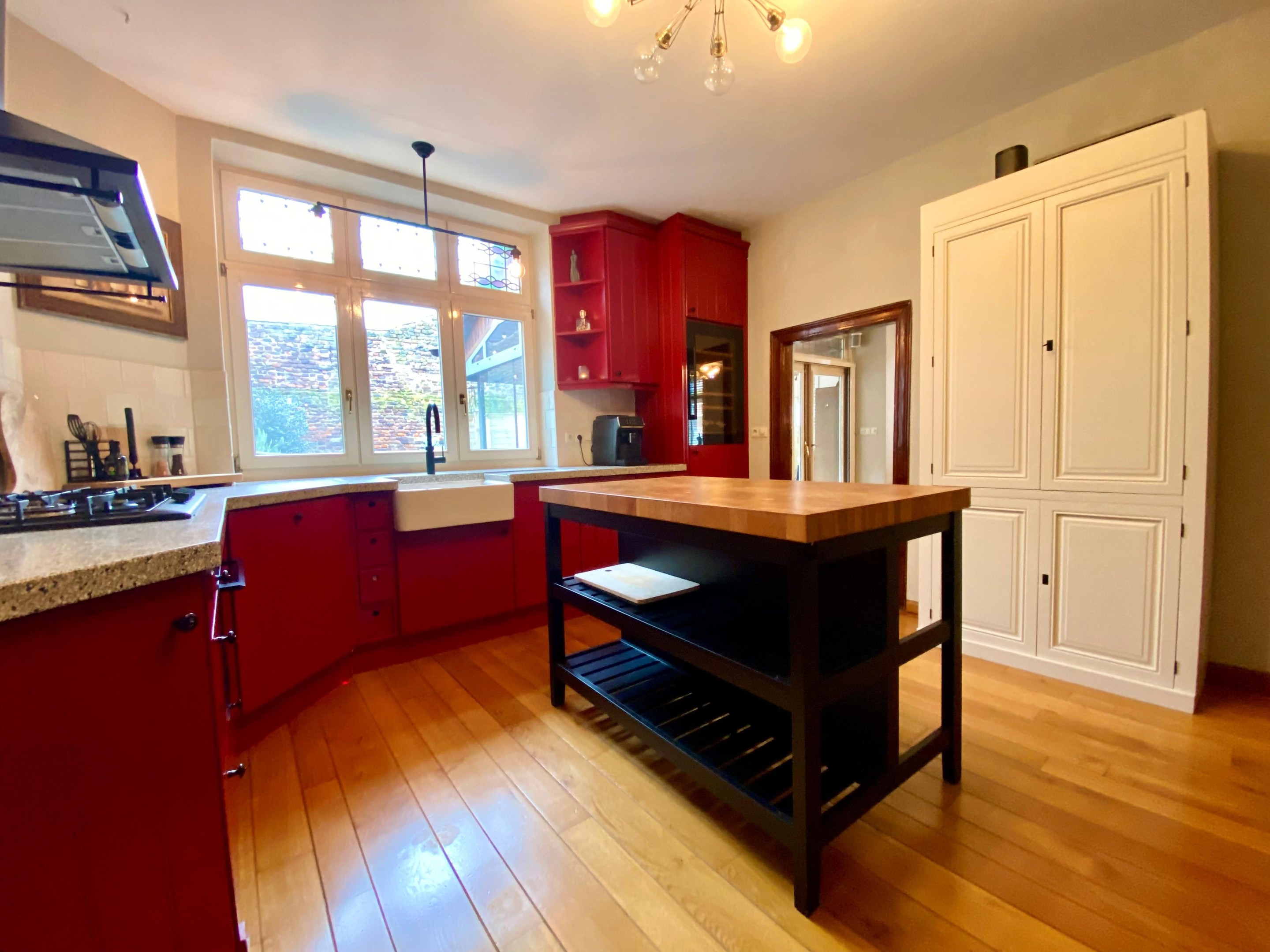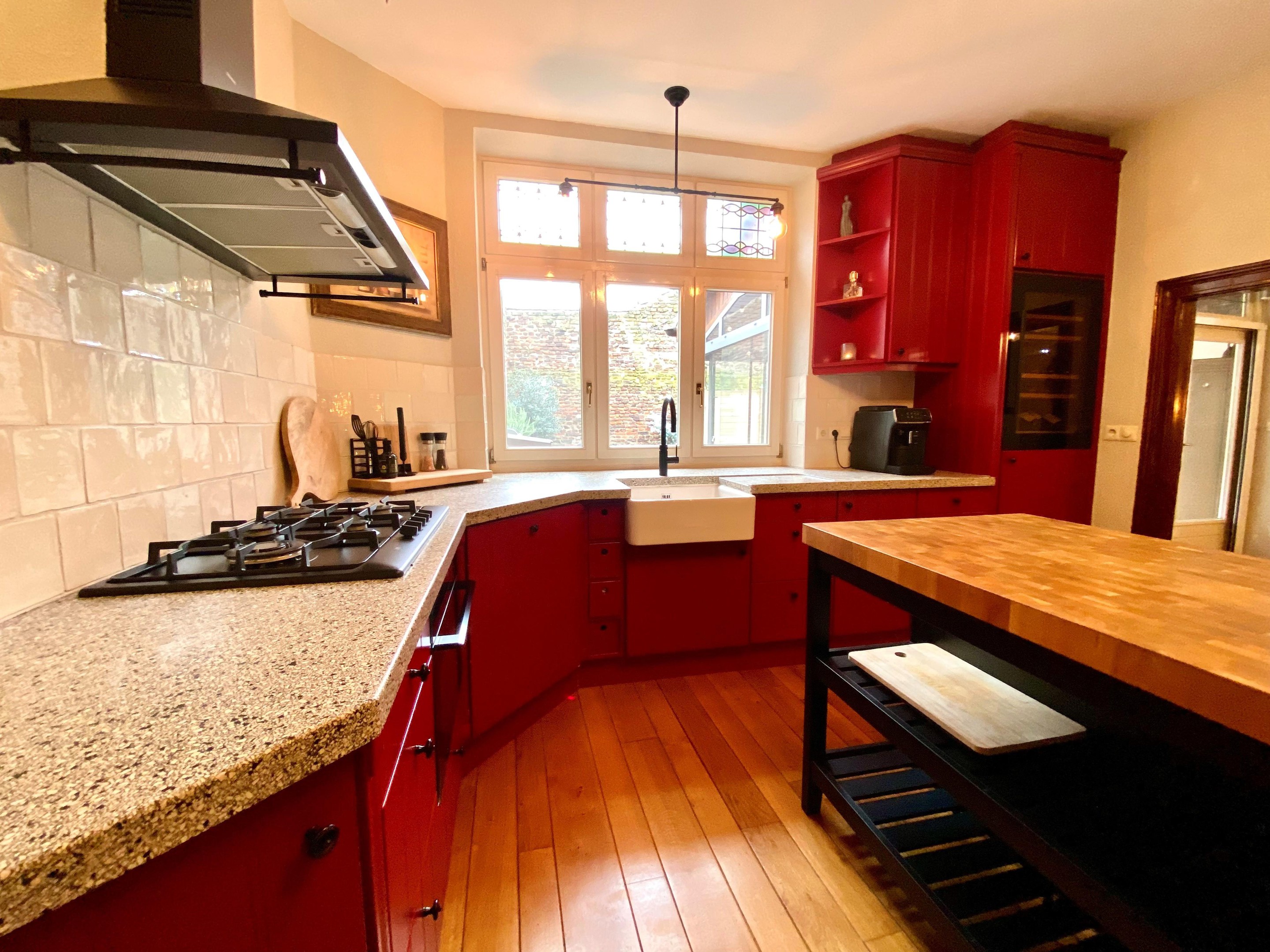 Voorzien van een gaskookplaat met aparte wokbrander, afzuigschouw, vaatwasser, koelkast, wijnkoelkast, Quooker- flex en een prachtig authentiek stenen werkblad, combineert deze keuken sfeer met functionaliteit.