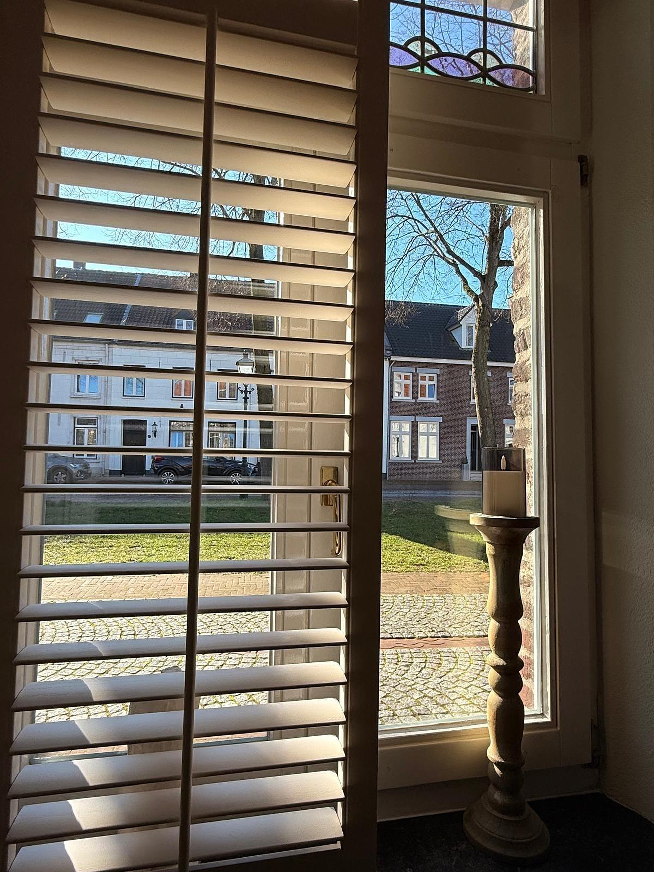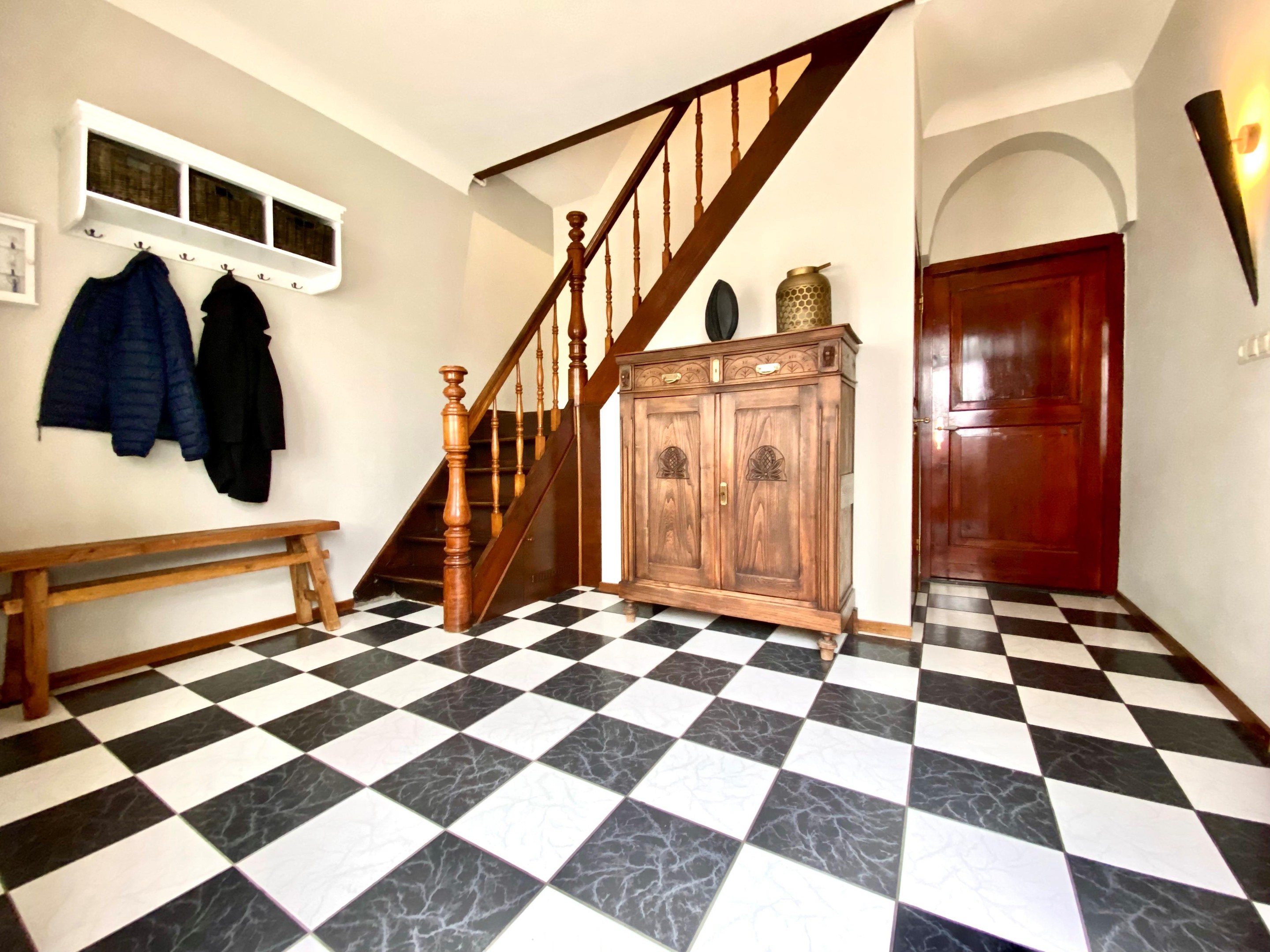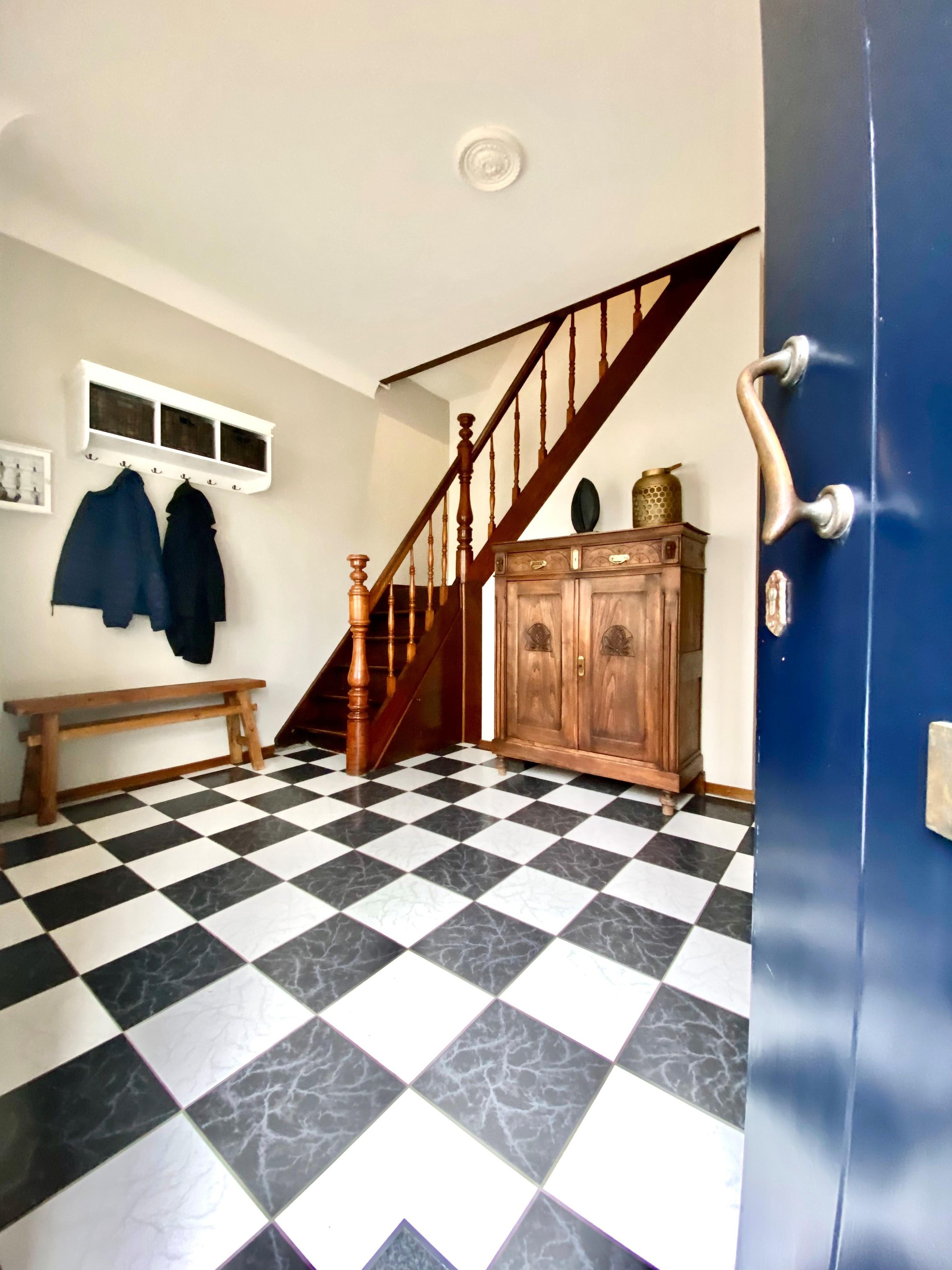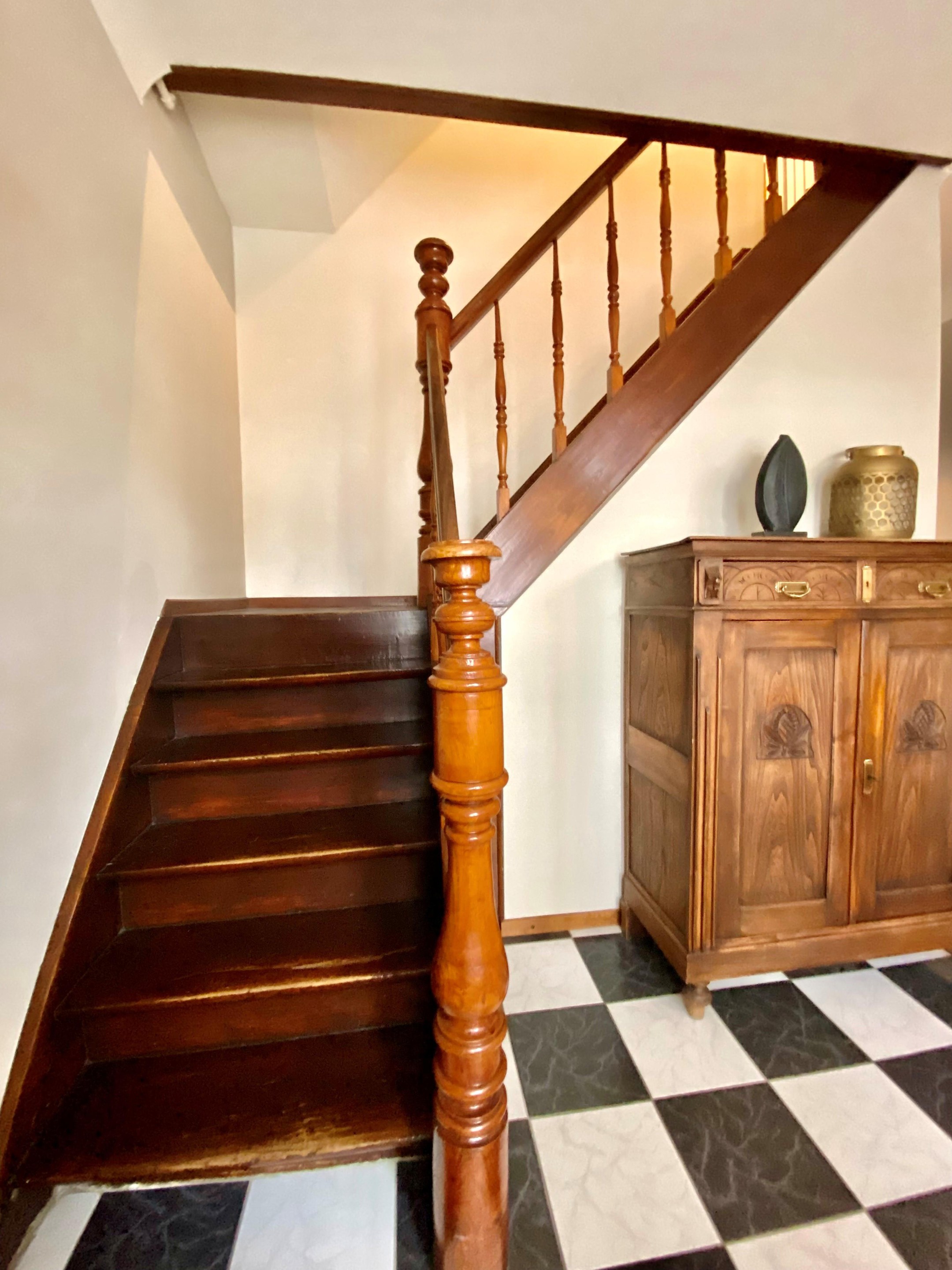 Je wordt verwelkomd in een sfeervolle entreehal met prachtige glas-in-loodramen en een authentieke trapopgang die direct de toon zet. Hier voel je meteen: dit huis heeft karakter.