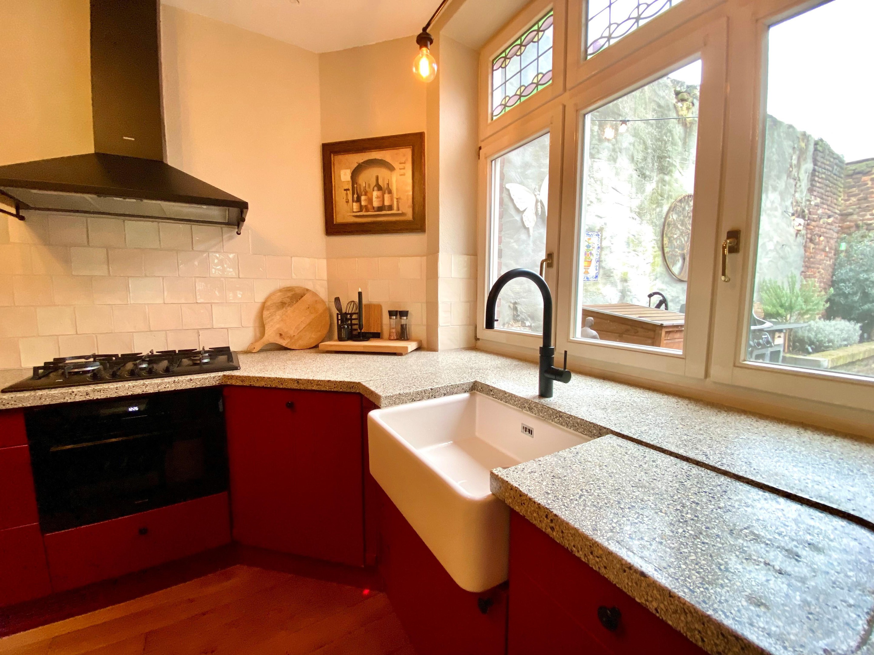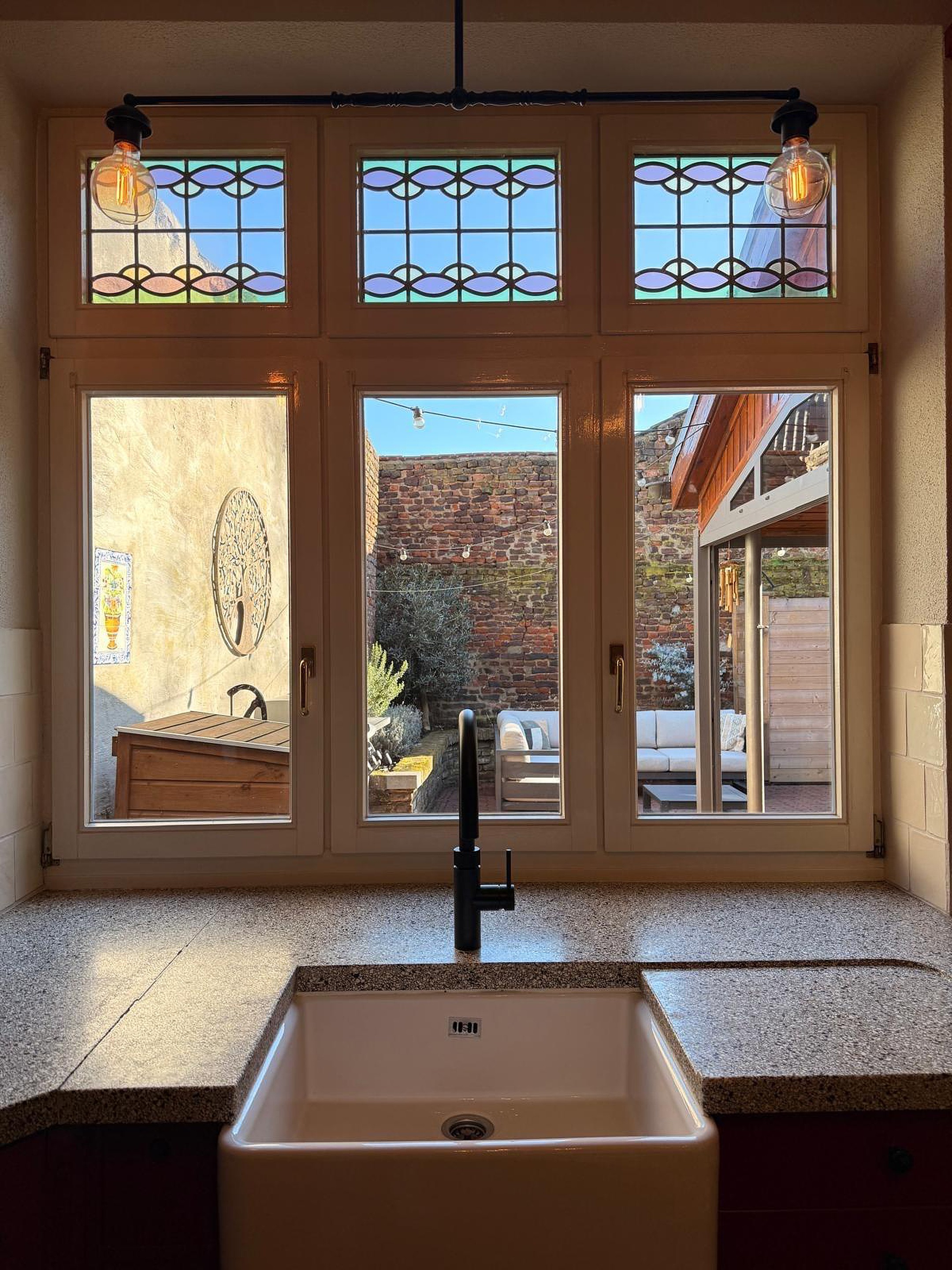 Terwijl je kookt, kijk je uit op de gezellige binnenplaats — ideaal om in contact te blijven met gezin of gasten.