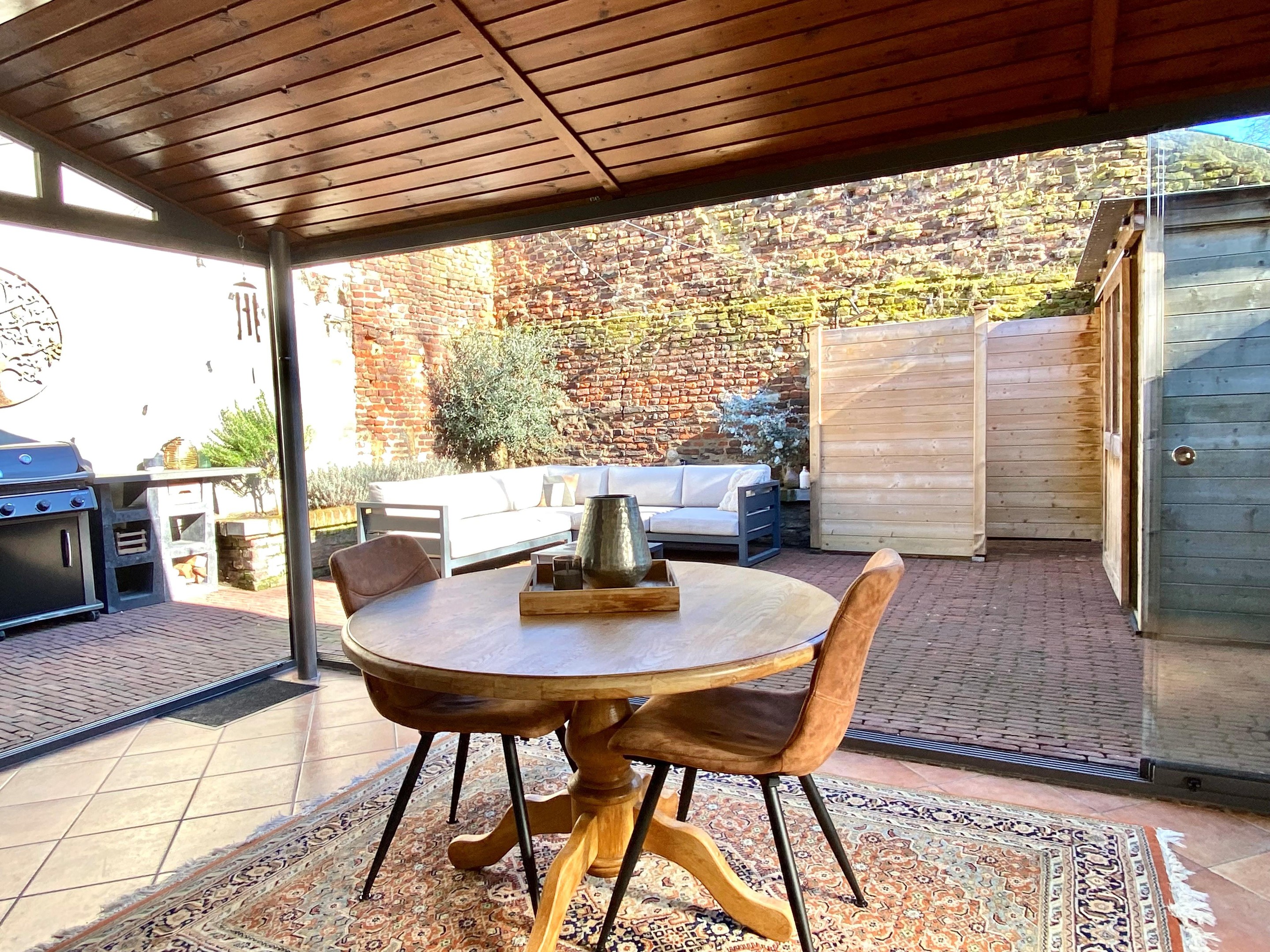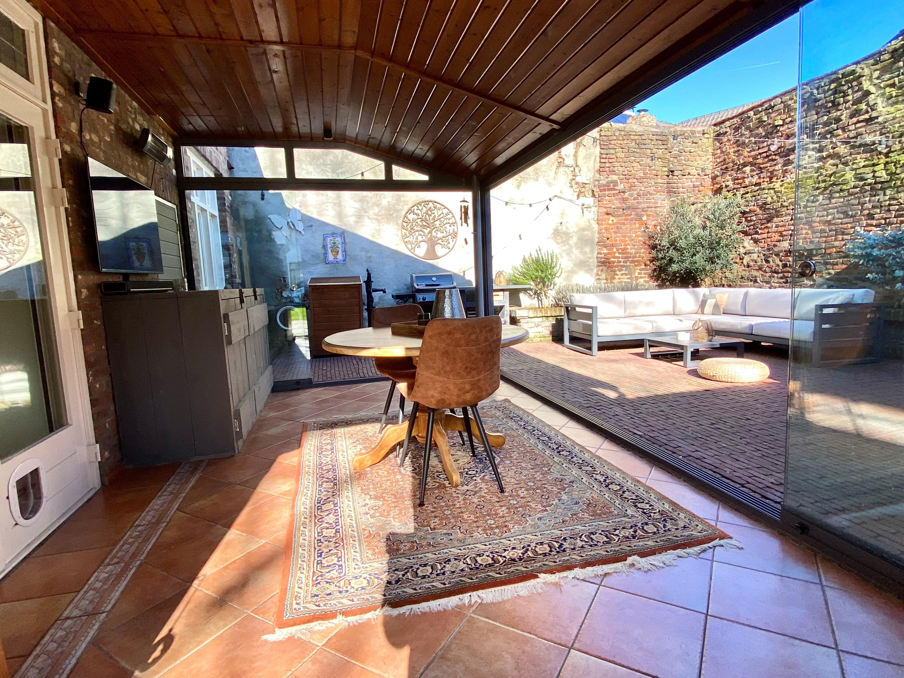 Via de openslaande houten tuindeuren bereik je de lichte tuinkamer. Hier stroomt het daglicht rijkelijk binnen en loopt binnen moeiteloos over in buiten. Een heerlijke plek voor een lange ontbijtochtend of een zomerse avond met de deuren open.