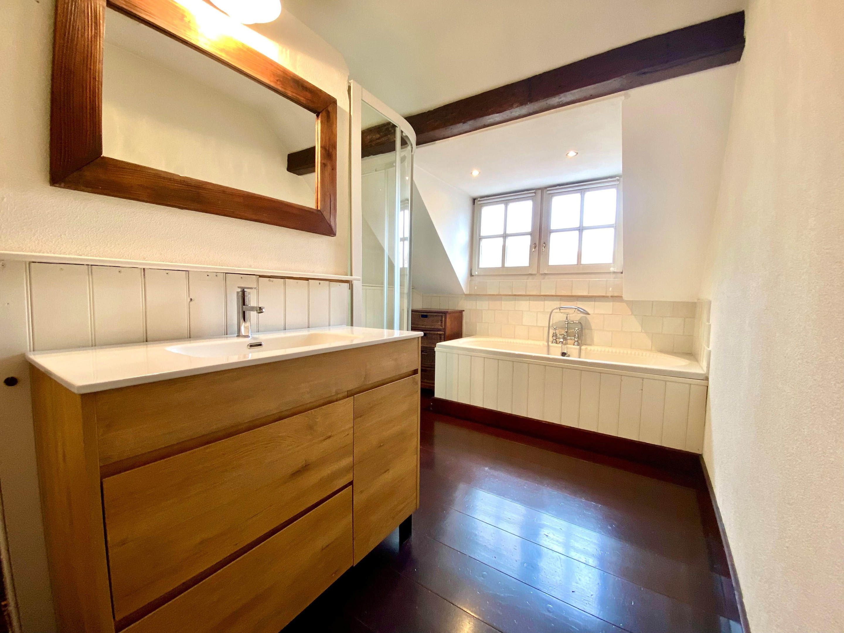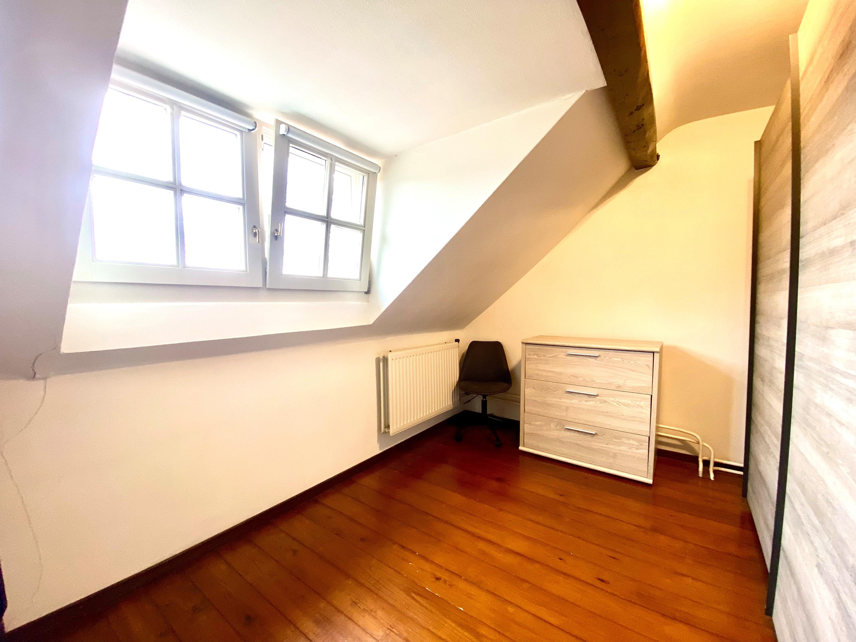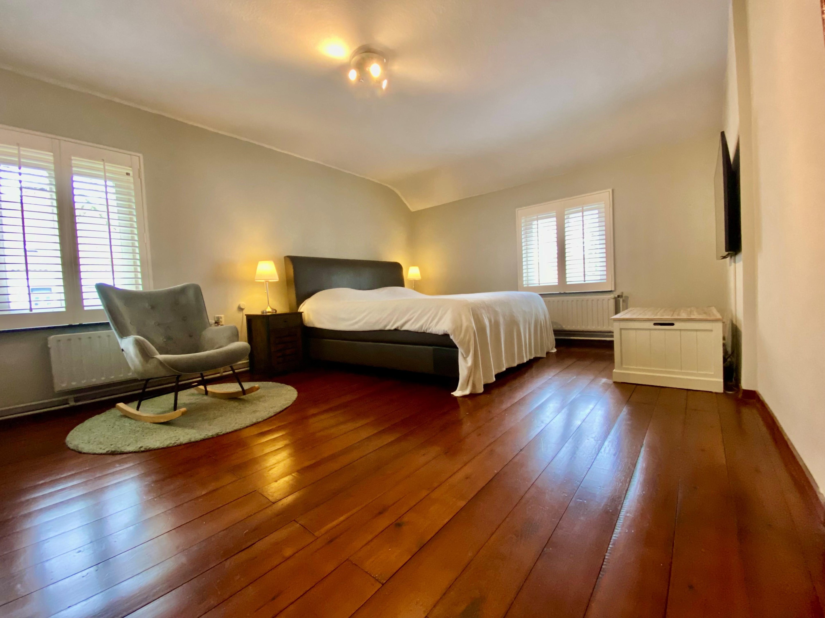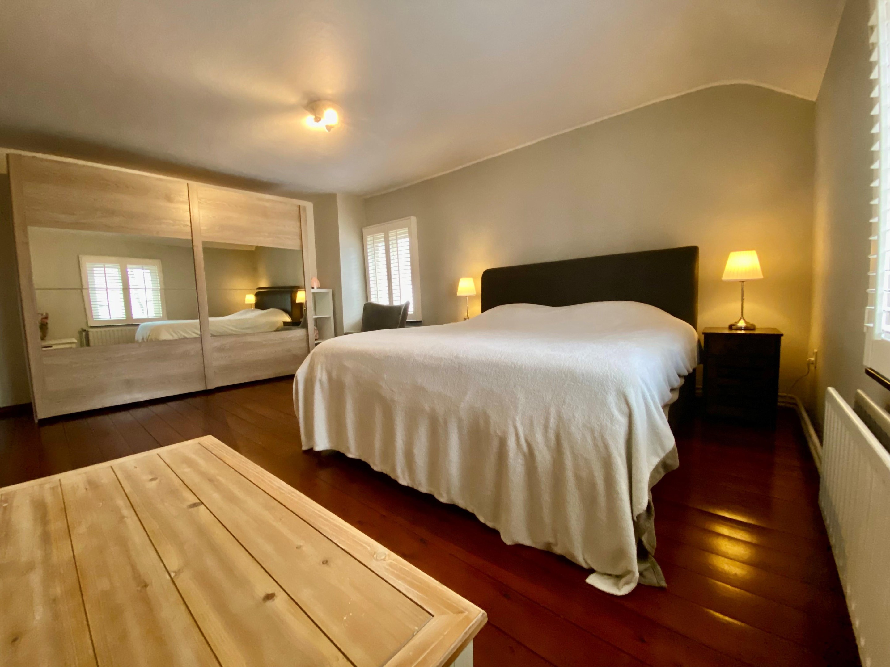 De verdieping beschikt over drie sfeervolle slaapkamers met karakteristieke houten balken. De authentieke houten vloer over de gehele etage versterkt het warme gevoel. Elke kamer ademt rust en charme.