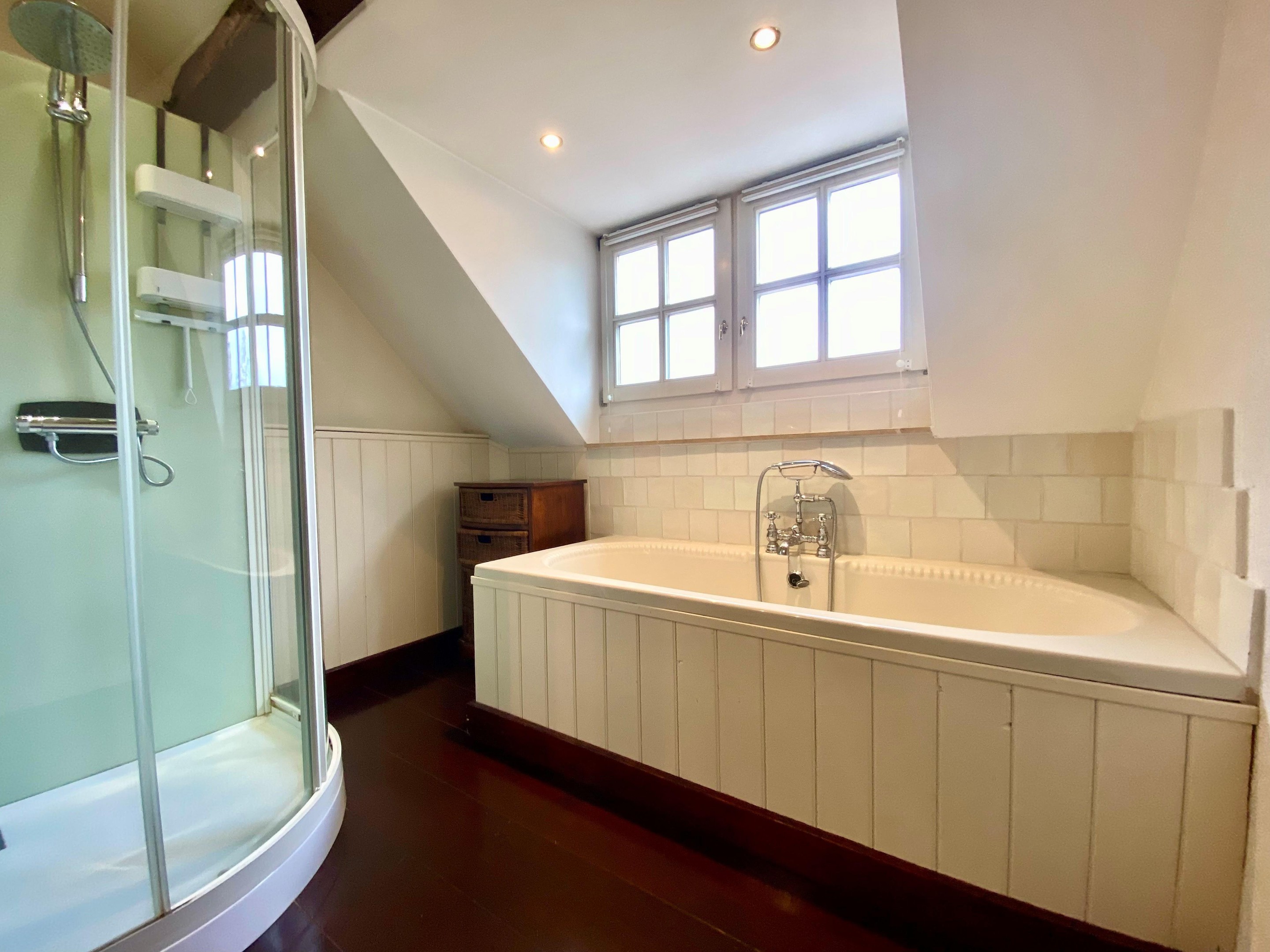 De ruime badkamer is compleet uitgerust met een ligbad, douchecabine, wastafelmeubel en toilet — een fijne plek om de dag ontspannen te beginnen of af te sluiten.