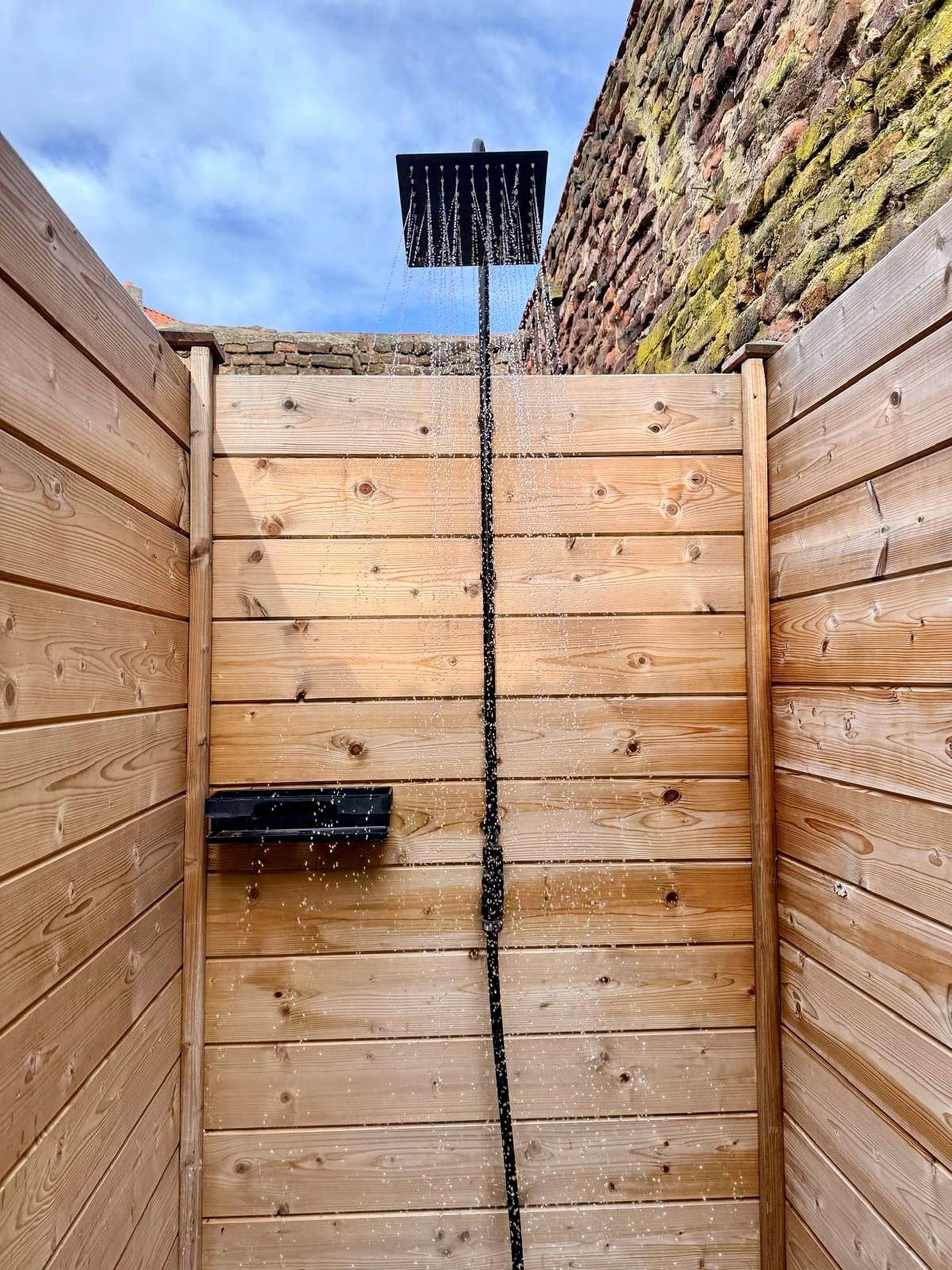 De buitendouche met warm en koud water geeft een extra vleugje luxe — perfect na een warme zomerdag. Daarnaast is er een praktische berging voor fietsen en tuinspullen.