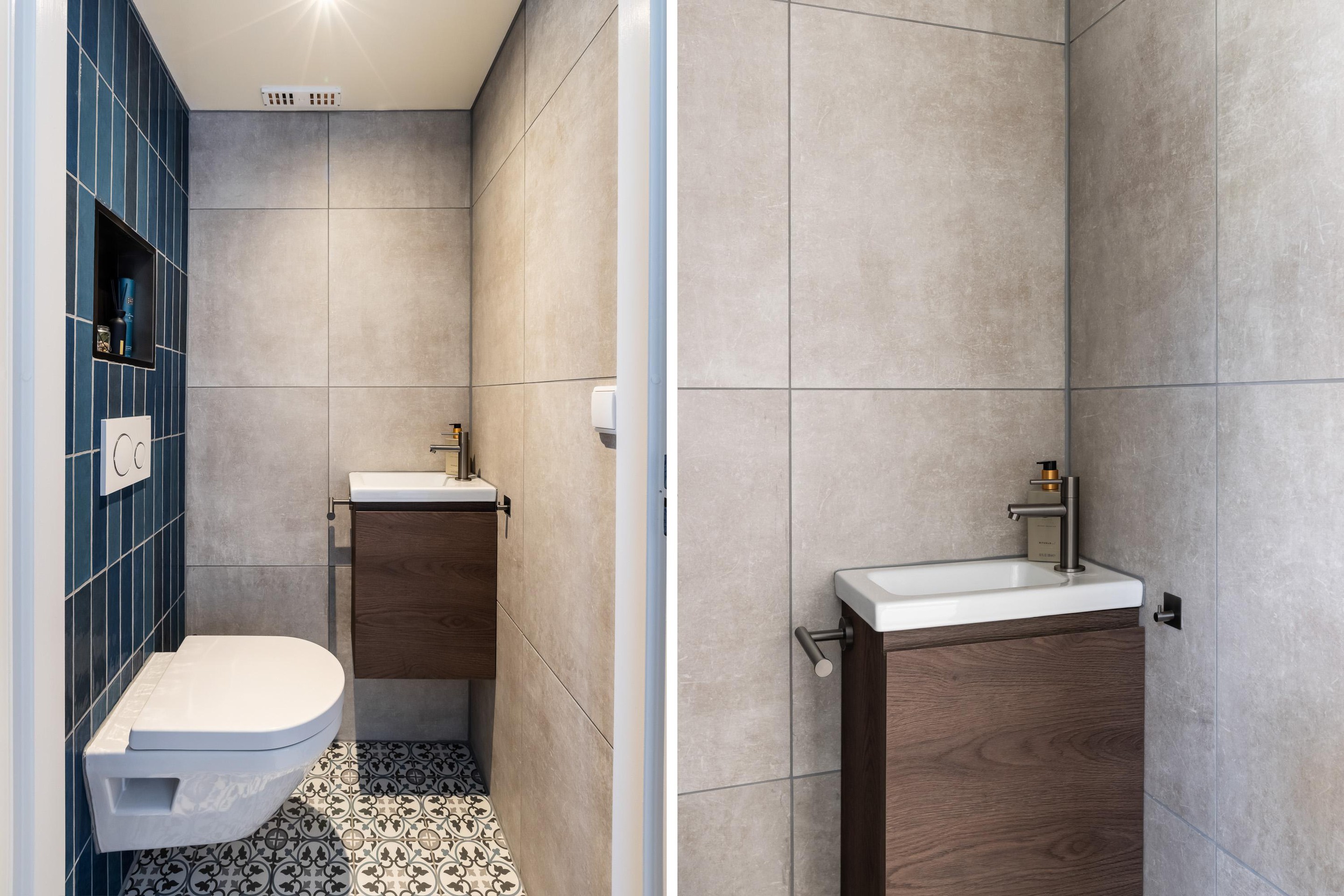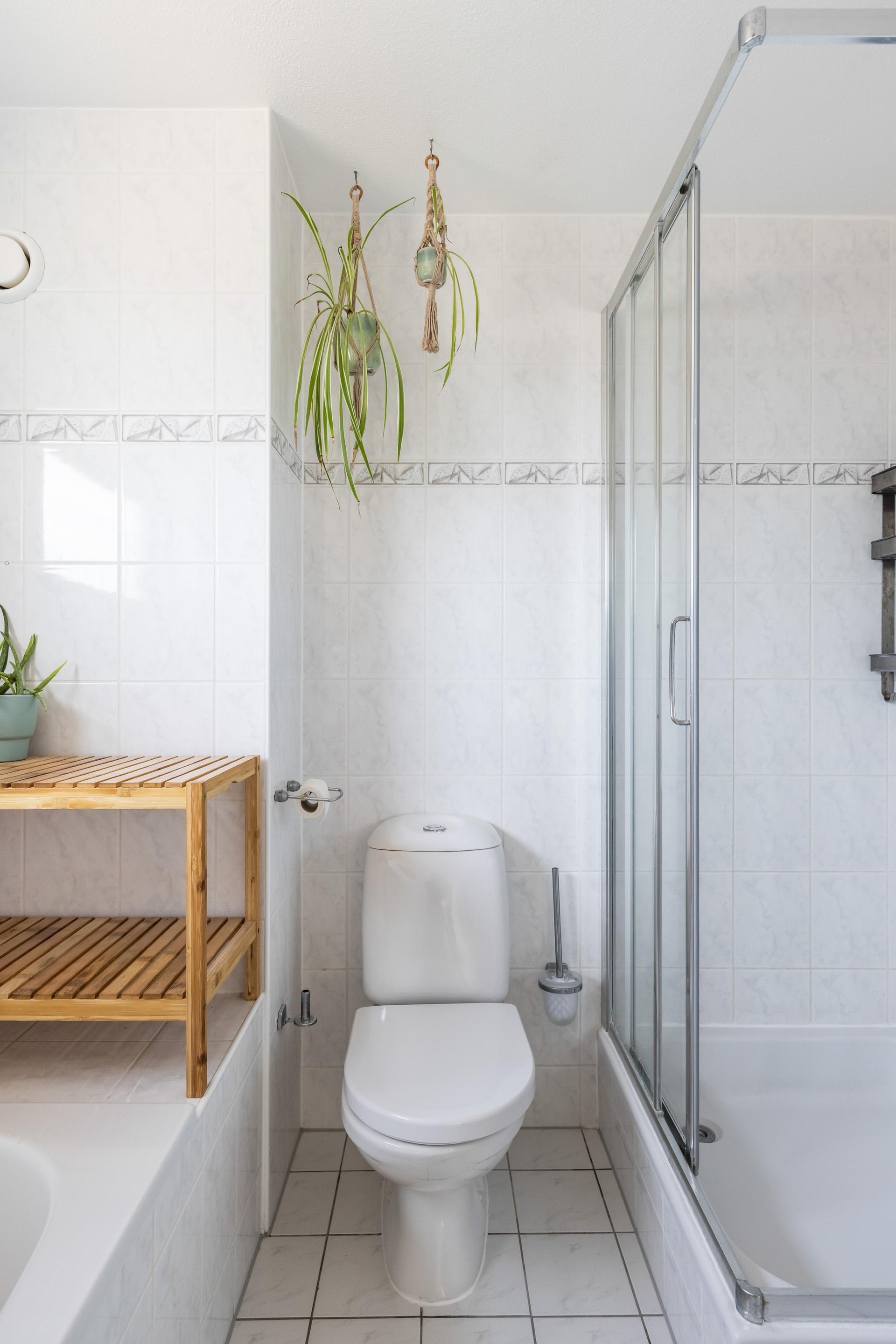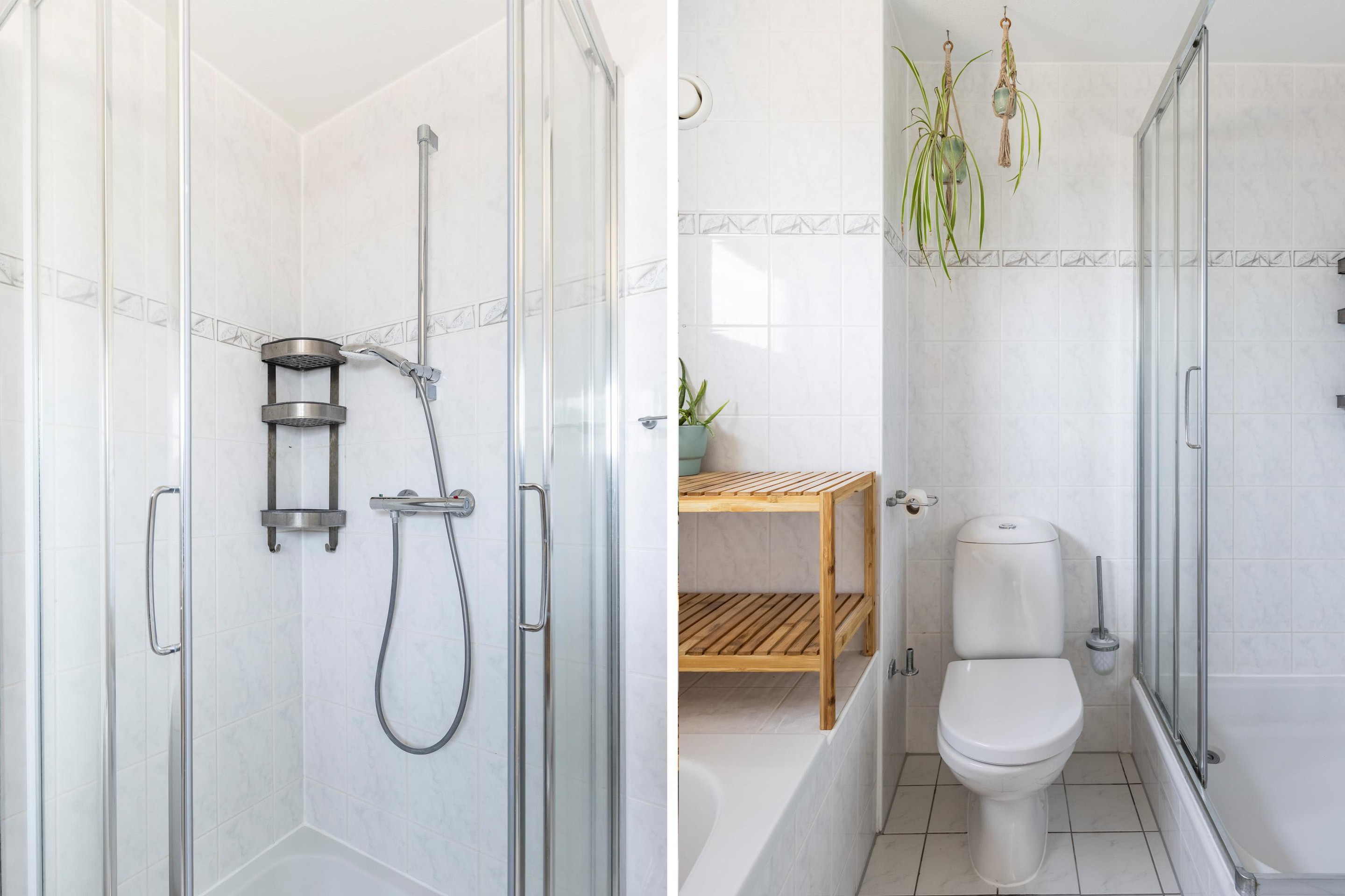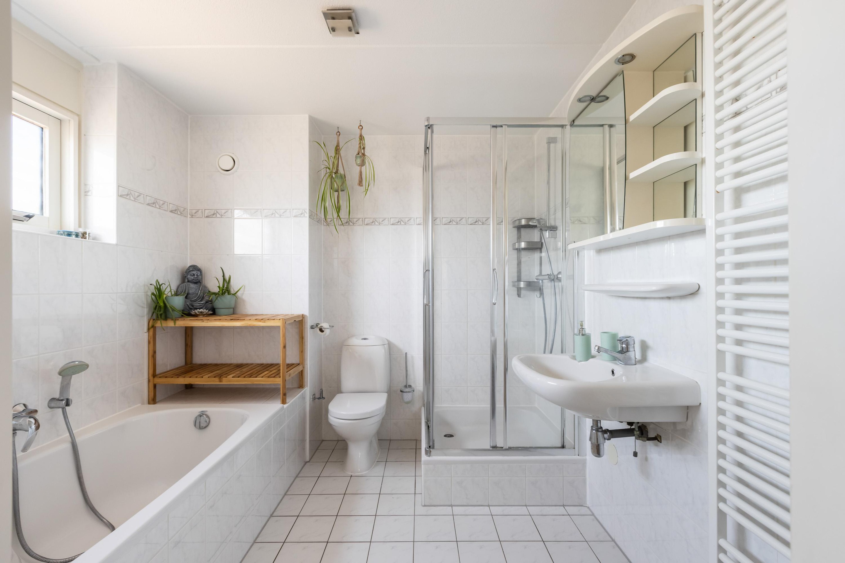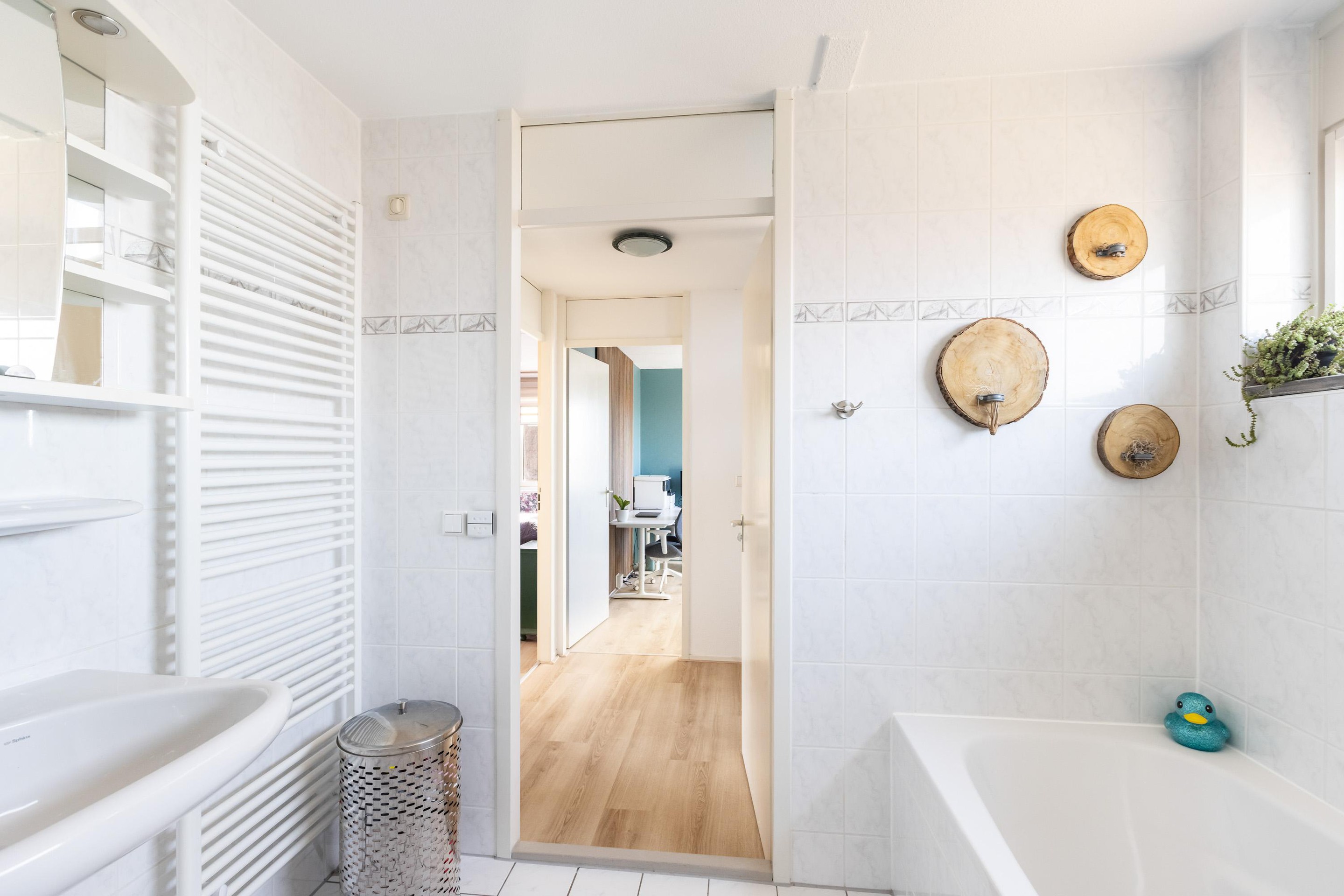 De badkamer is volledig betegeld en compleet ingericht met een ligbad, douchecabine, wastafel, toilet en designradiator. Een openslaand raam zorgt voor natuurlijke ventilatie en daglicht.
