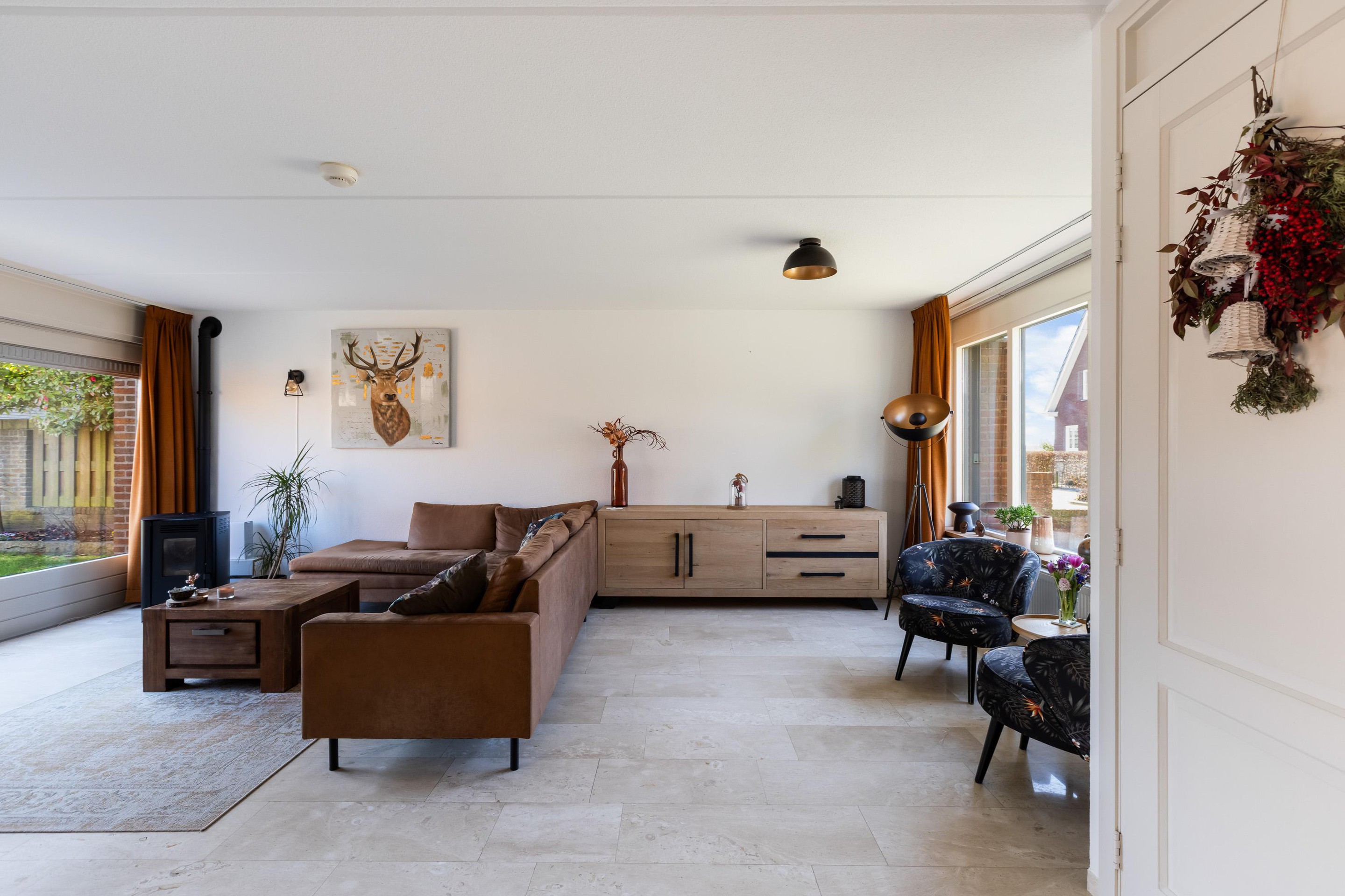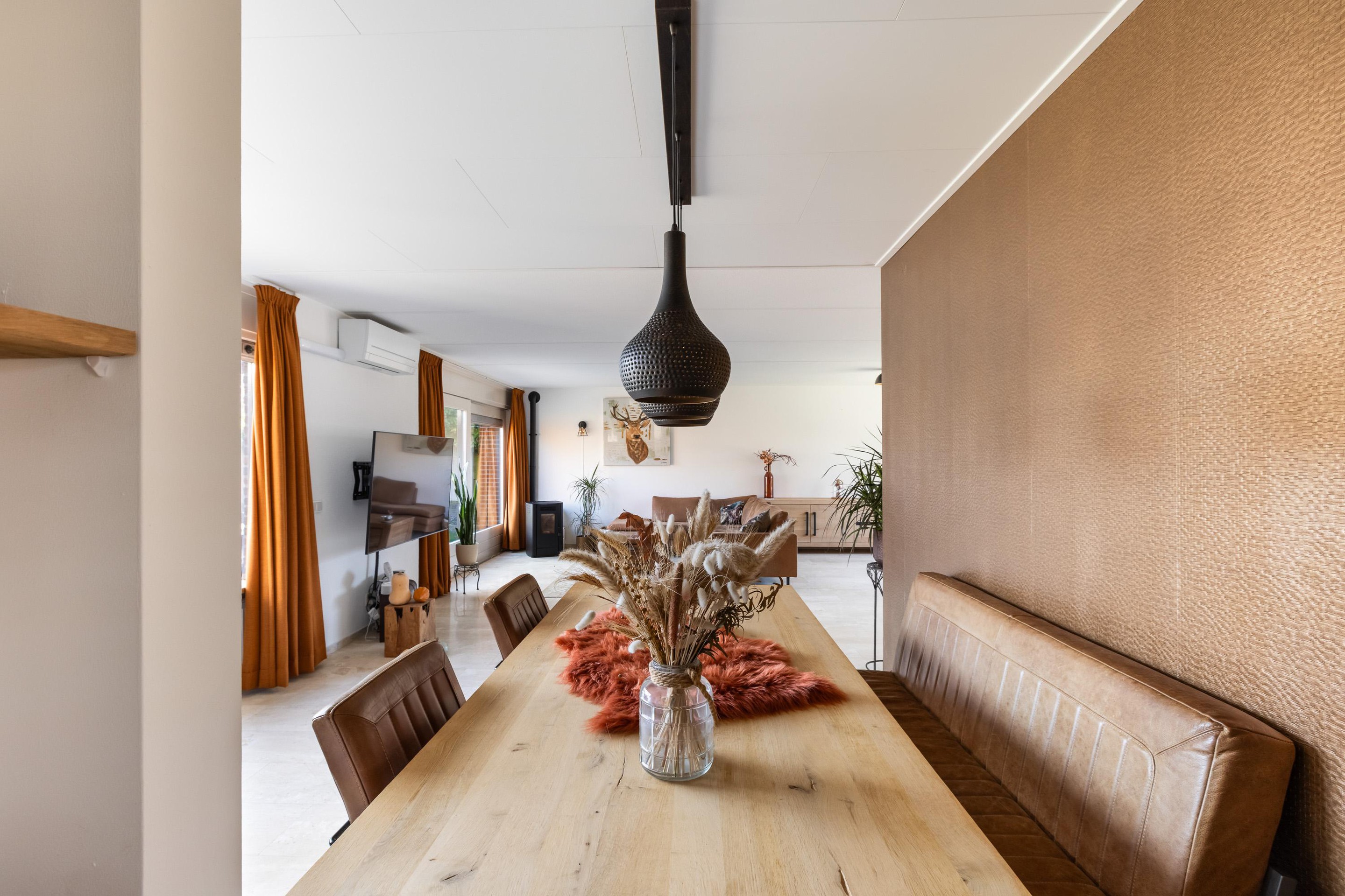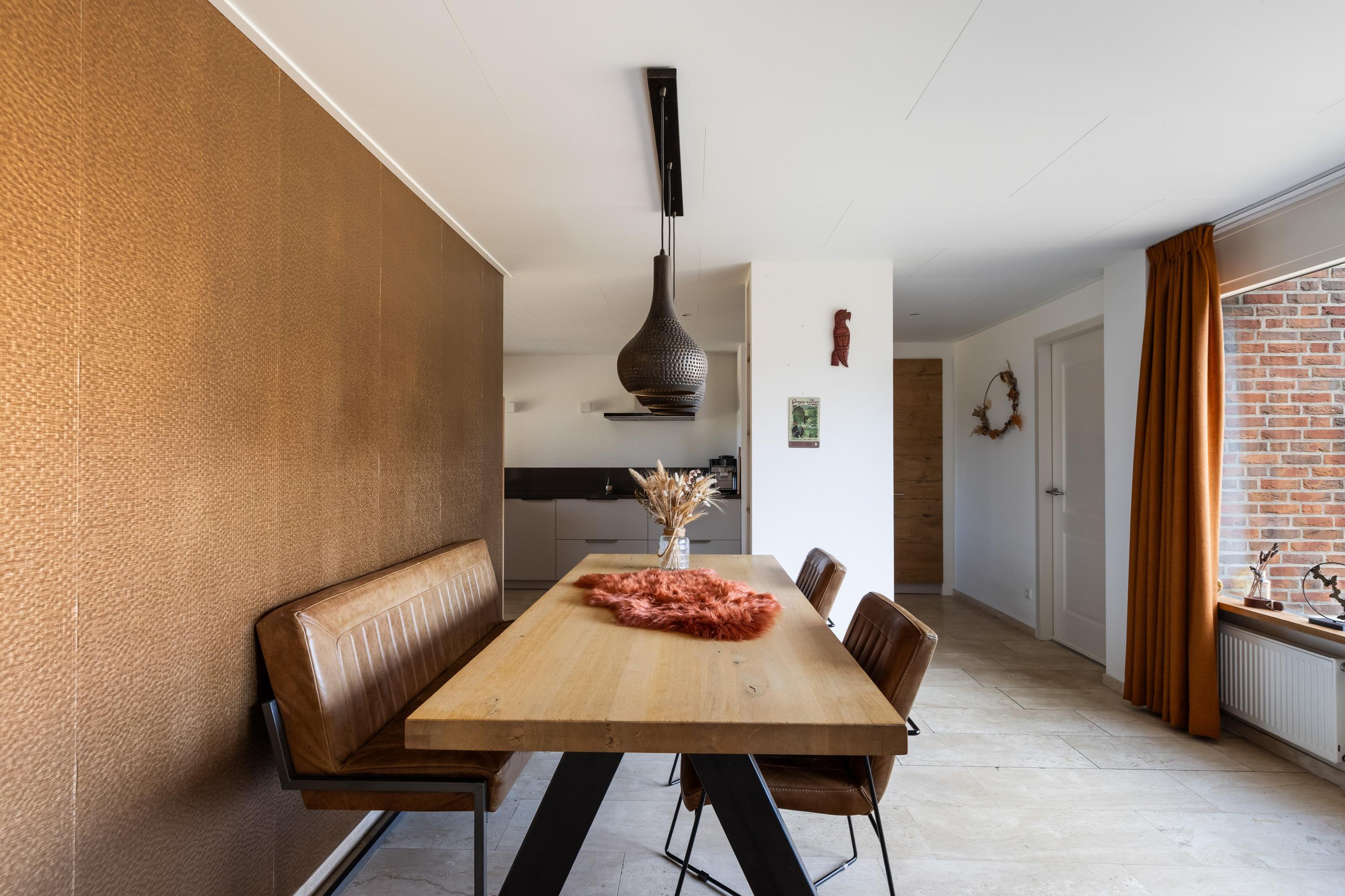 De woonkamer is royaal opgezet en profiteert van veel lichtinval. De ruimte voelt open en comfortabel aan en staat via een schuifpui in directe verbinding met de achtertuin. De natuurstenen vloer met vloerverwarming zorgt voor een warme uitstraling en aangenaam wooncomfort. De pelletkachel vormt een sfeervol middelpunt in de woonkamer en zorgt in de wintermaanden voor extra warmte. Voor verkoeling in de zomer is er een airco aanwezig, wat bijdraagt aan een prettig binnenklimaat gedurende het hele jaar.