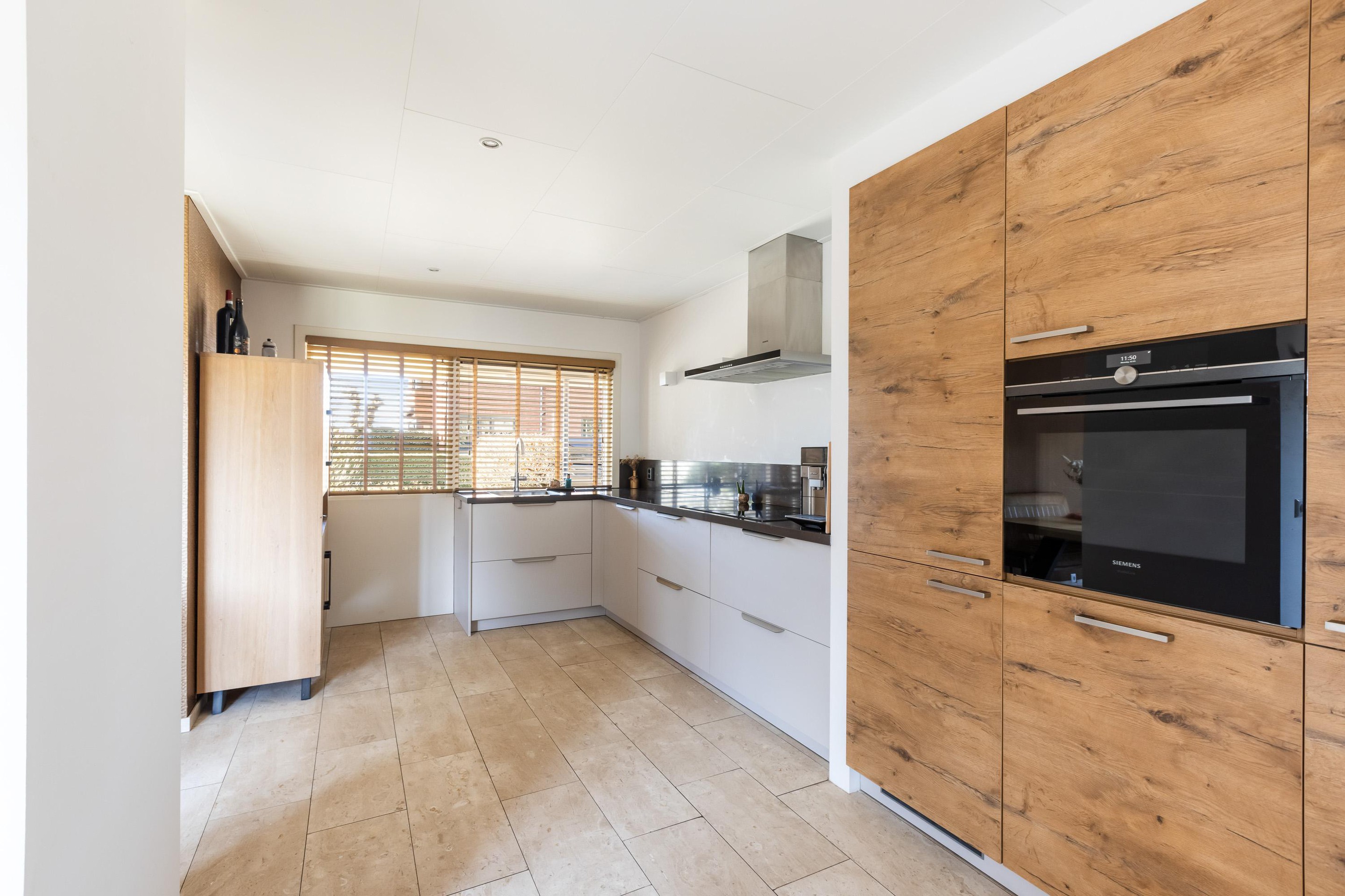 De open keuken bevindt zich aan de linkerzijde van de woning en is modern uitgevoerd. De keuken beschikt over een stijlvol composiet werkblad en diverse hoogwaardige inbouwapparatuur, waaronder een inductiekookplaat, oven, koelkast, vriezer en een kokendwaterkraan. Dankzij de praktische indeling en het ruime werkblad is dit een fijne plek om te koken, terwijl je tegelijkertijd contact houdt met de woonkamer en de tuin.