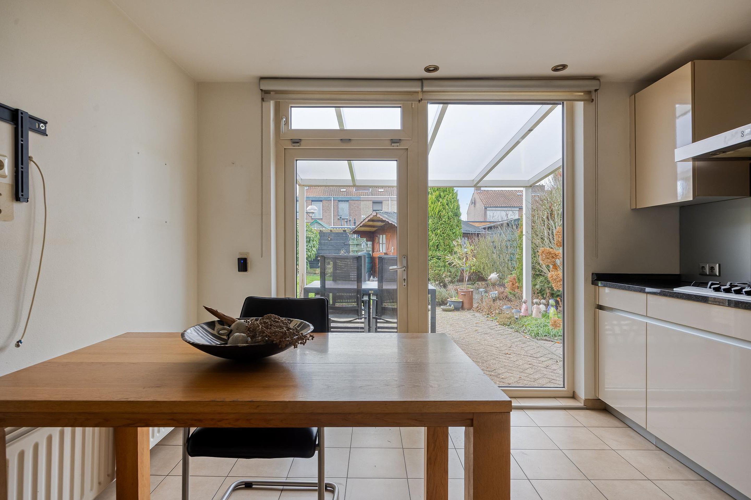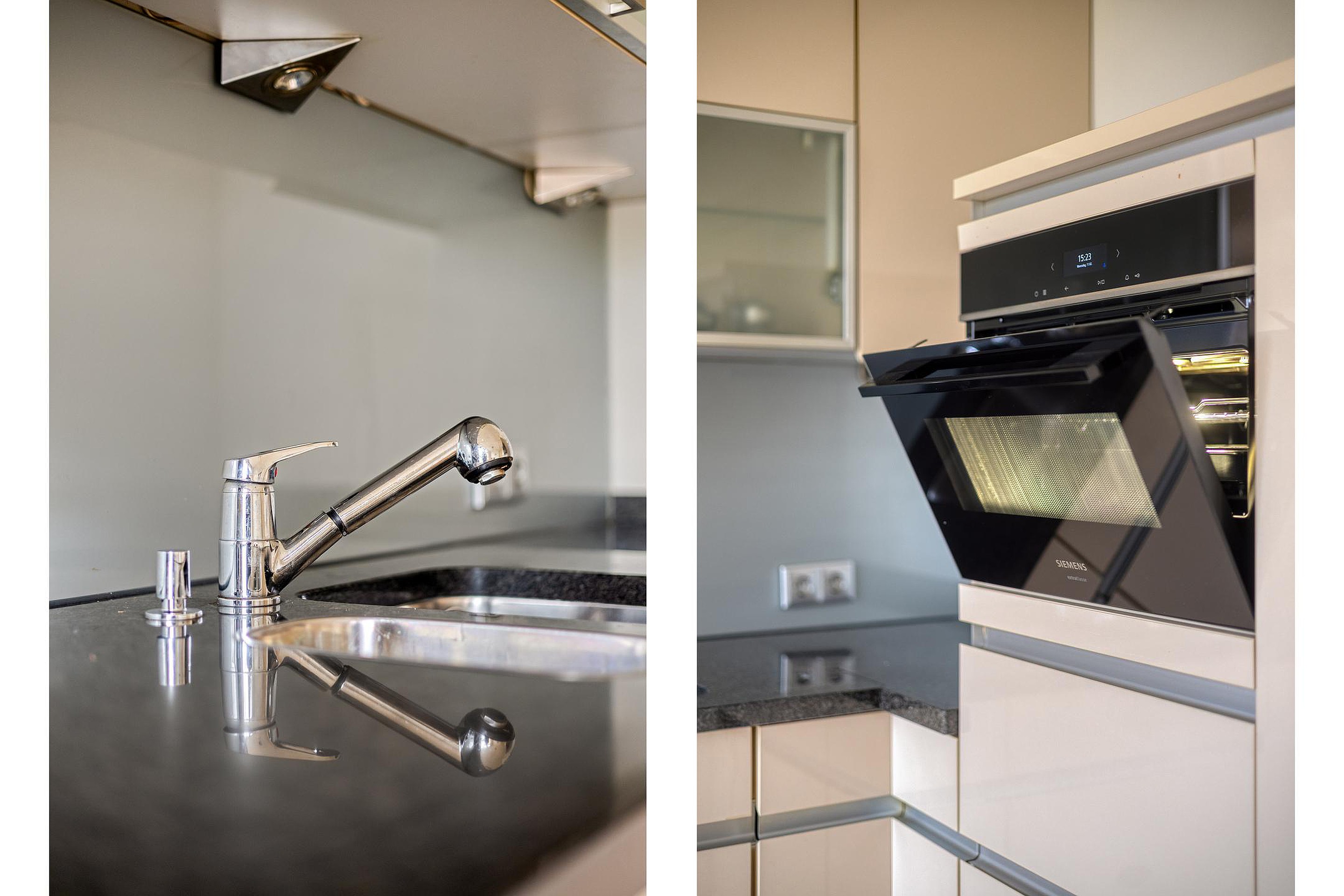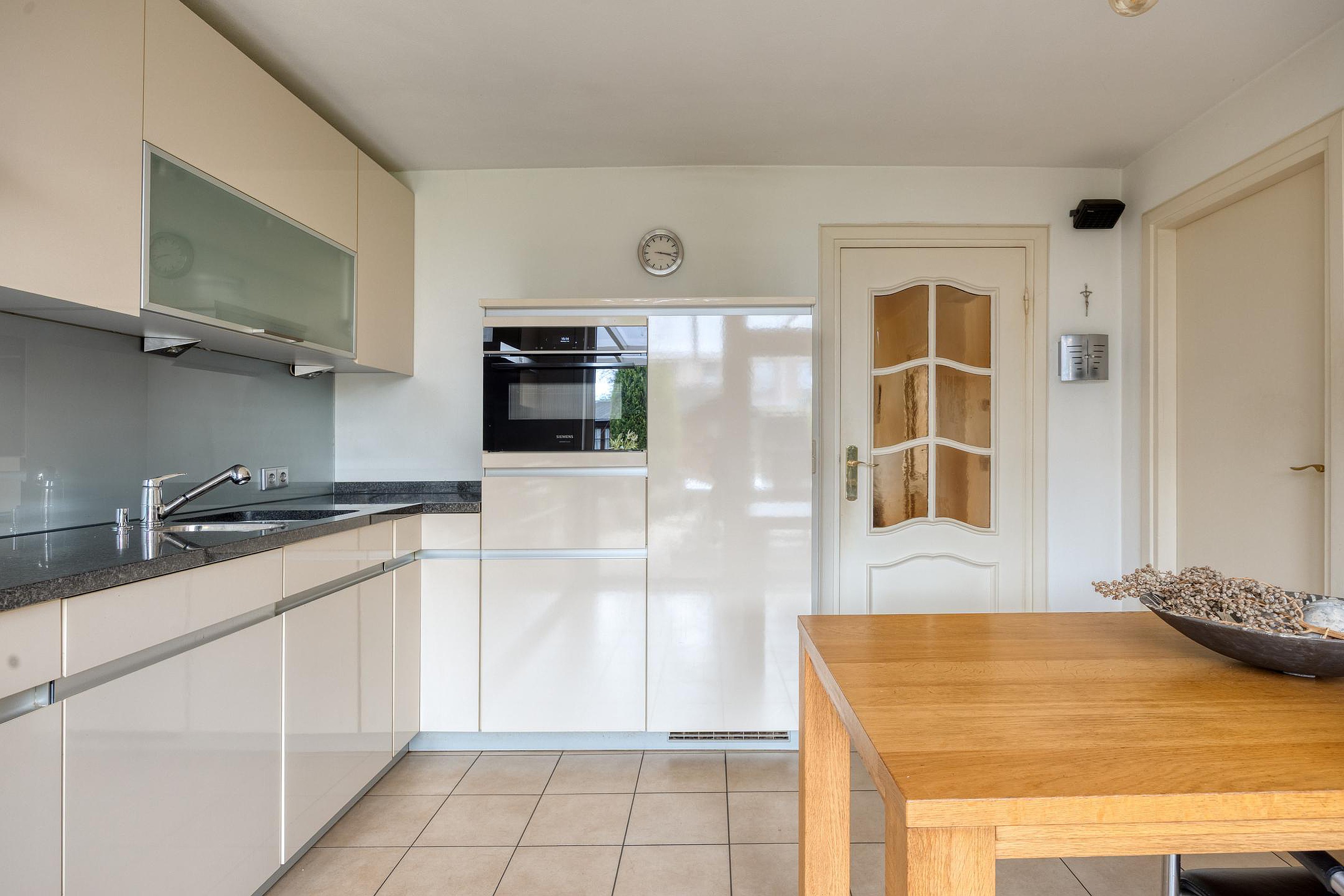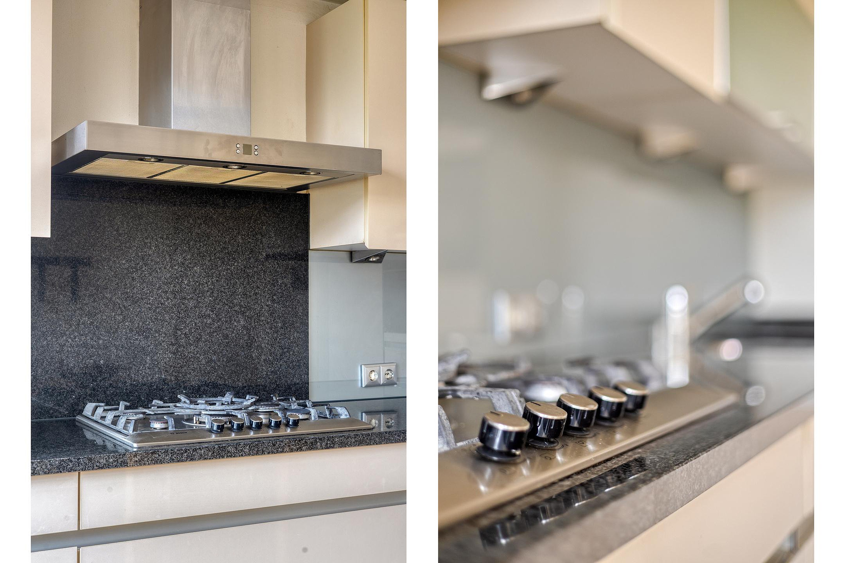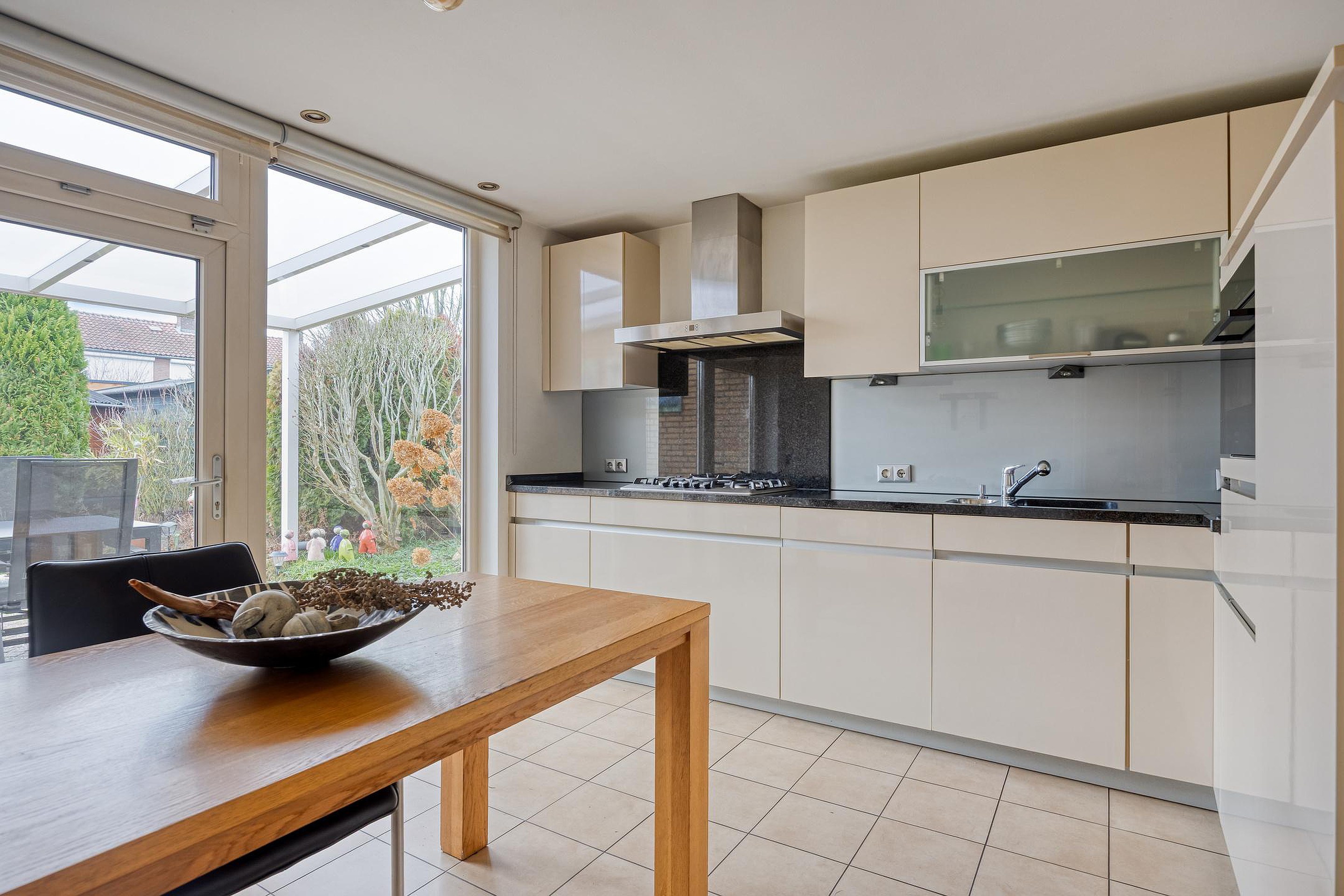 De ruime woonkeuken is praktisch en compleet ingericht met een aanbouwkeuken in wandopstelling, voorzien van een kookplaat met wok brander, afzuigkap, koelkast, vaatwasser en combi-oven. Het granieten werkblad en de royale kast- en ladeopslag maken deze keuken tot een echte leefkeuken.