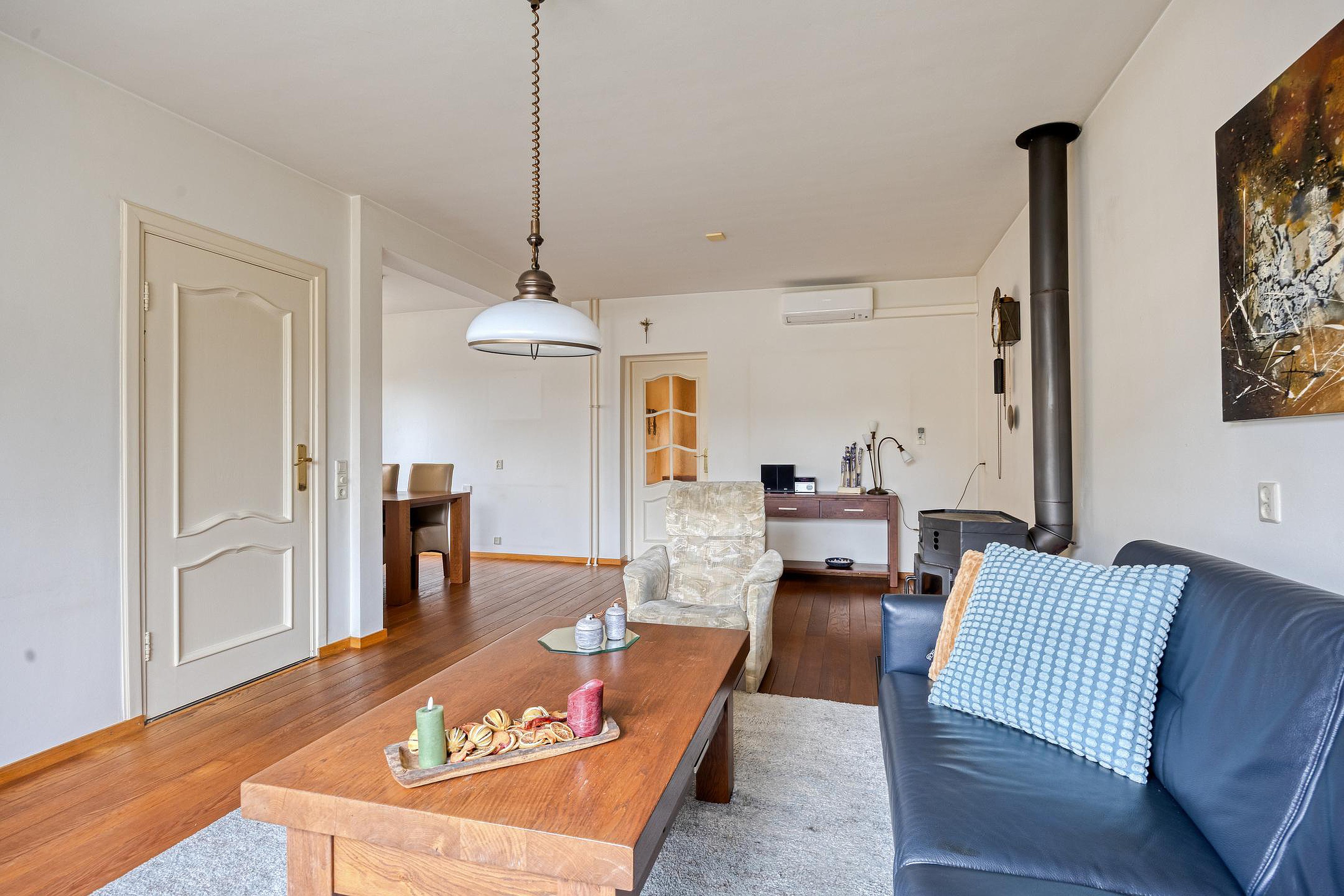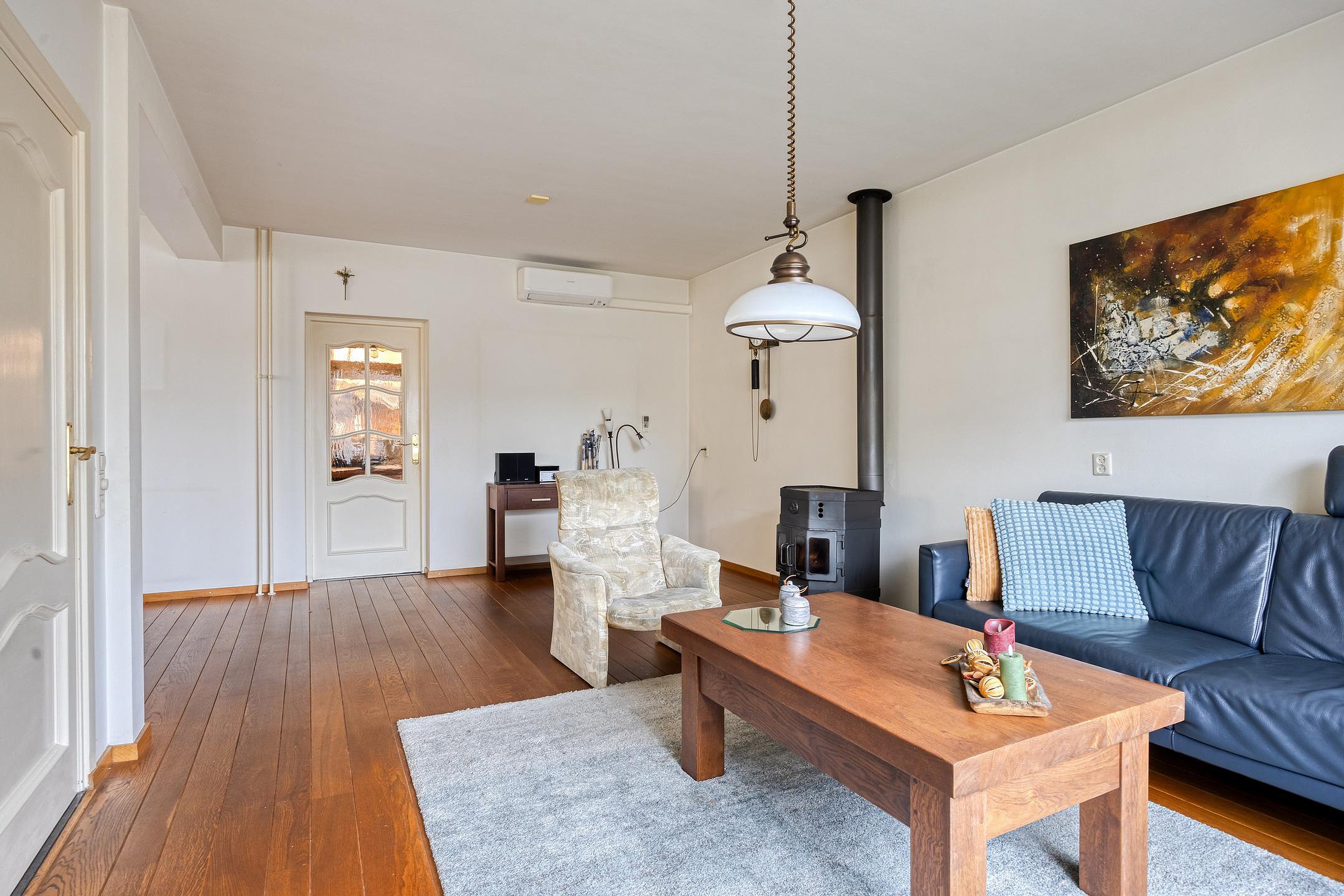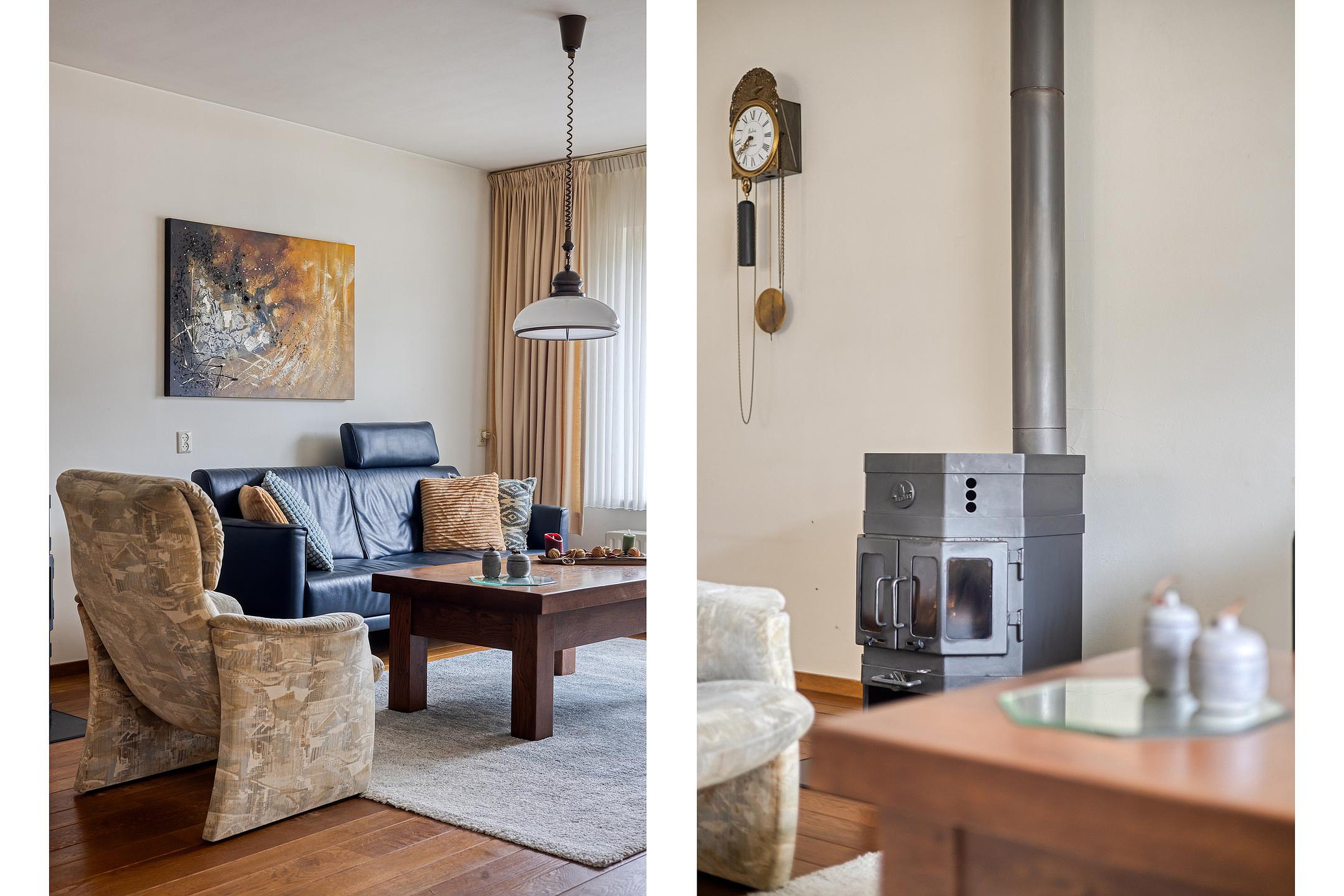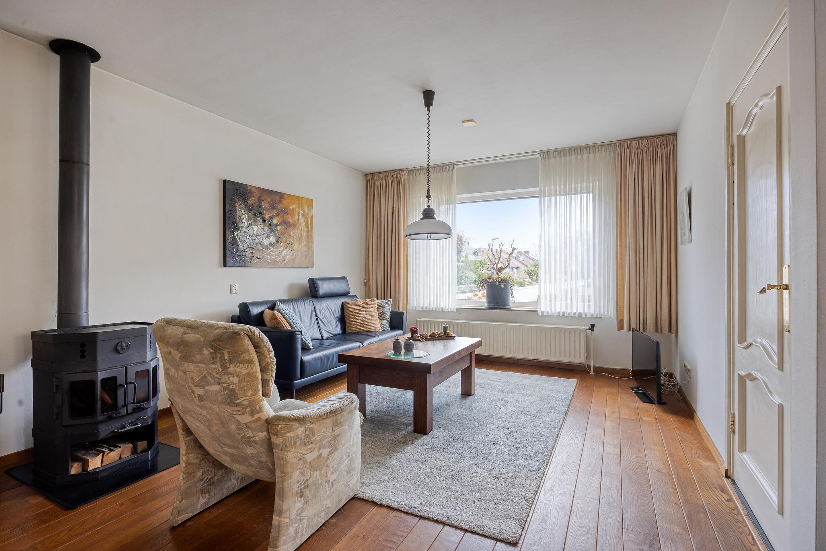 De sfeervolle en lichte L-vormige woonkamer met fraaie parketvloer vormt het hart van de woning. Dankzij de prettige lichtinval en de aanwezige kachel is dit een heerlijke leefruimte voor elk seizoen.