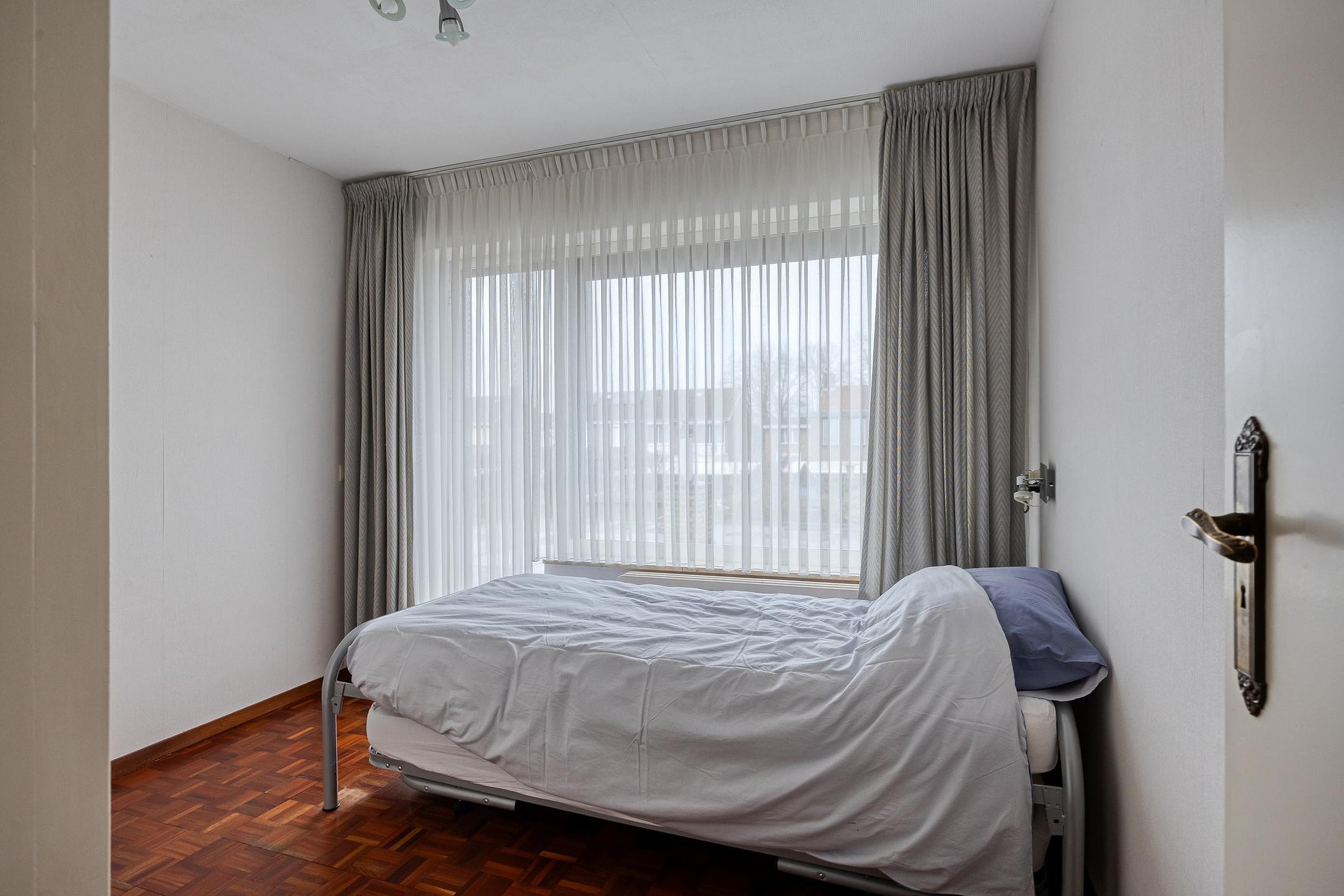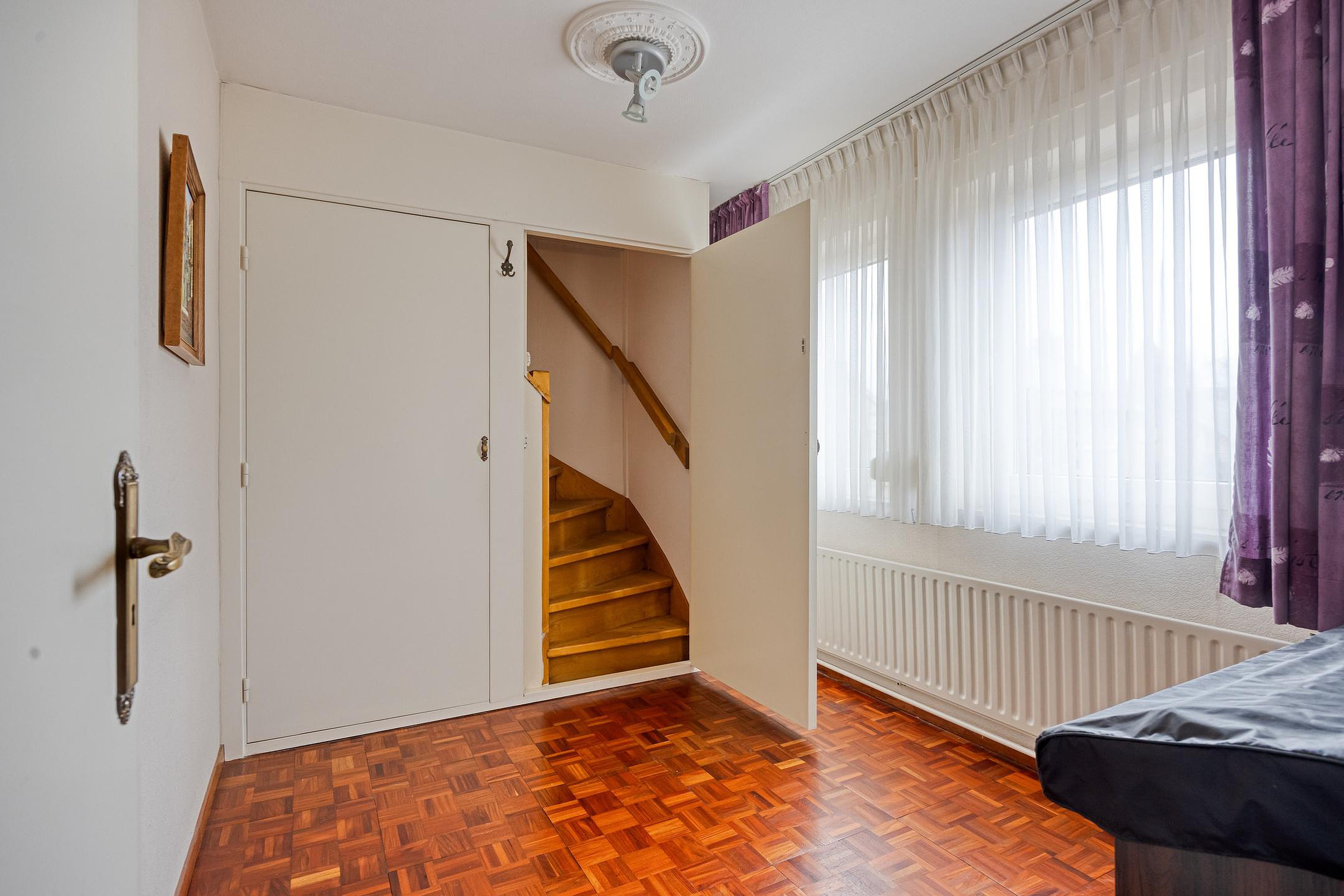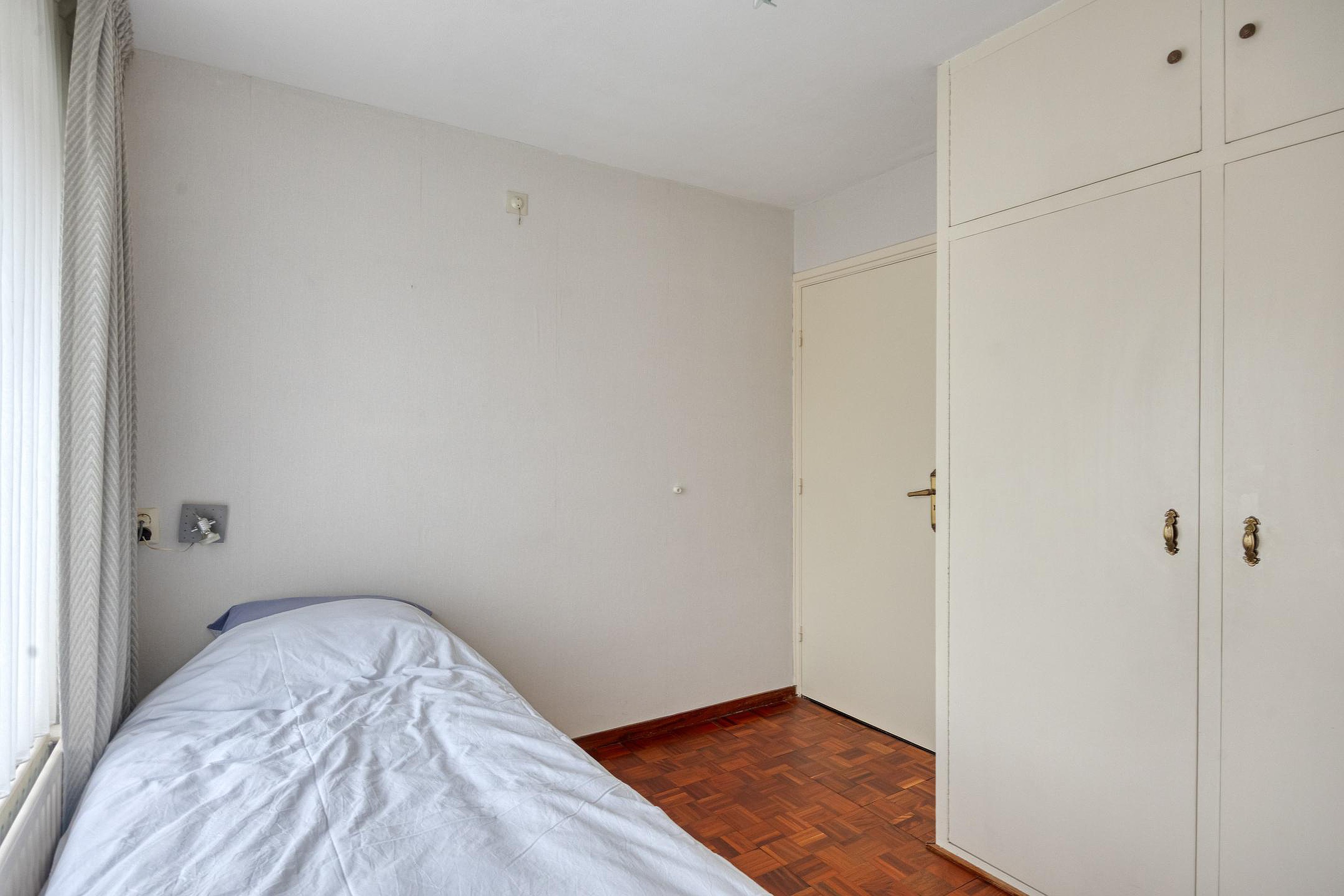 De overloop met parketvloer geeft toegang tot drie verzorgde en lichte slaapkamers, afgewerkt met parket- of laminaatvloeren. Twee slaapkamers beschikken over handige inbouwkasten.