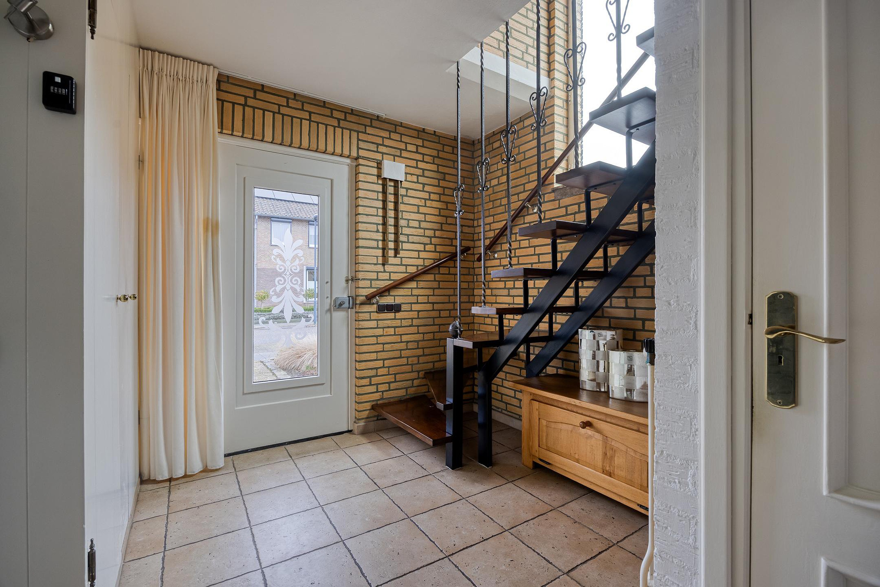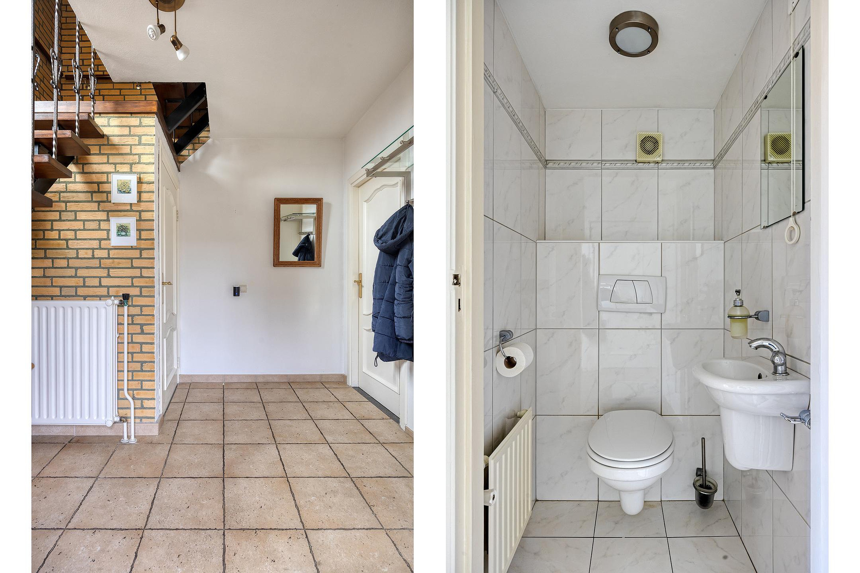 U komt binnen in de nette entreehal met tegelvloer, meterkast en toilet met fonteintje.