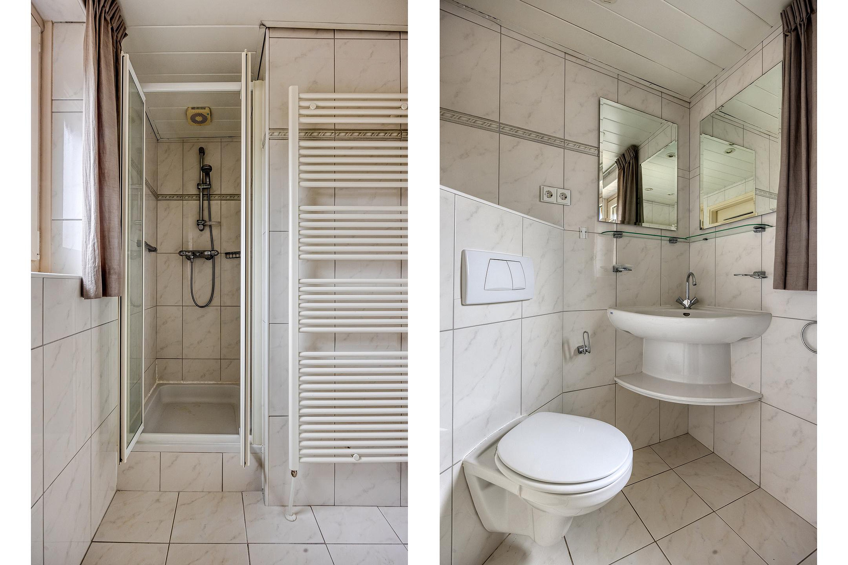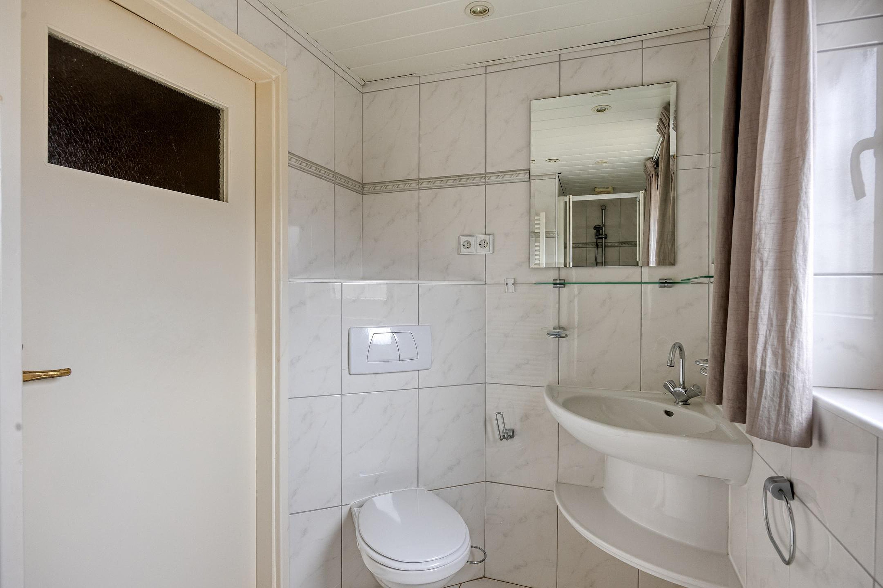 De badkamer is functioneel ingericht met een douche, toilet en wastafel.