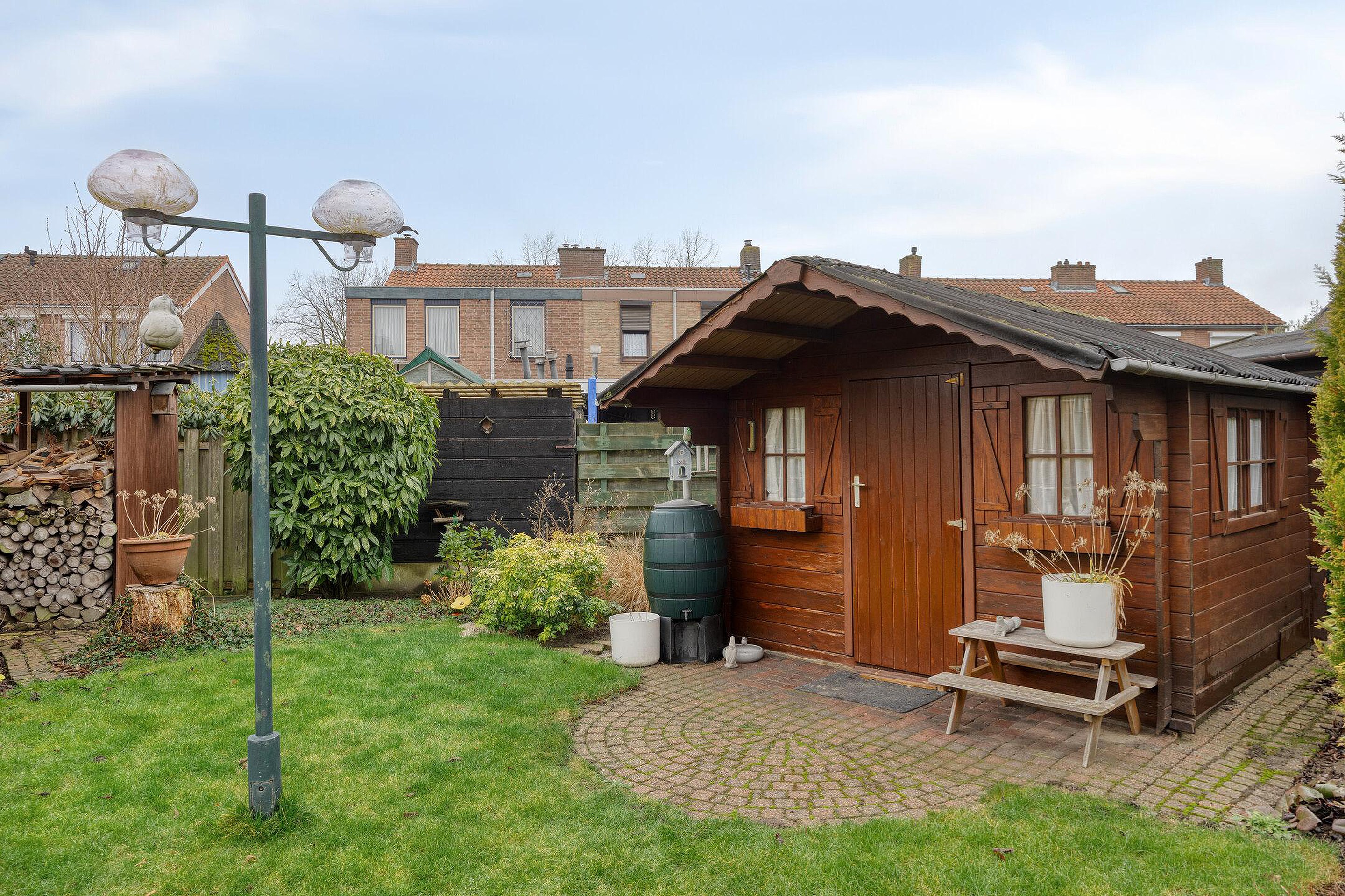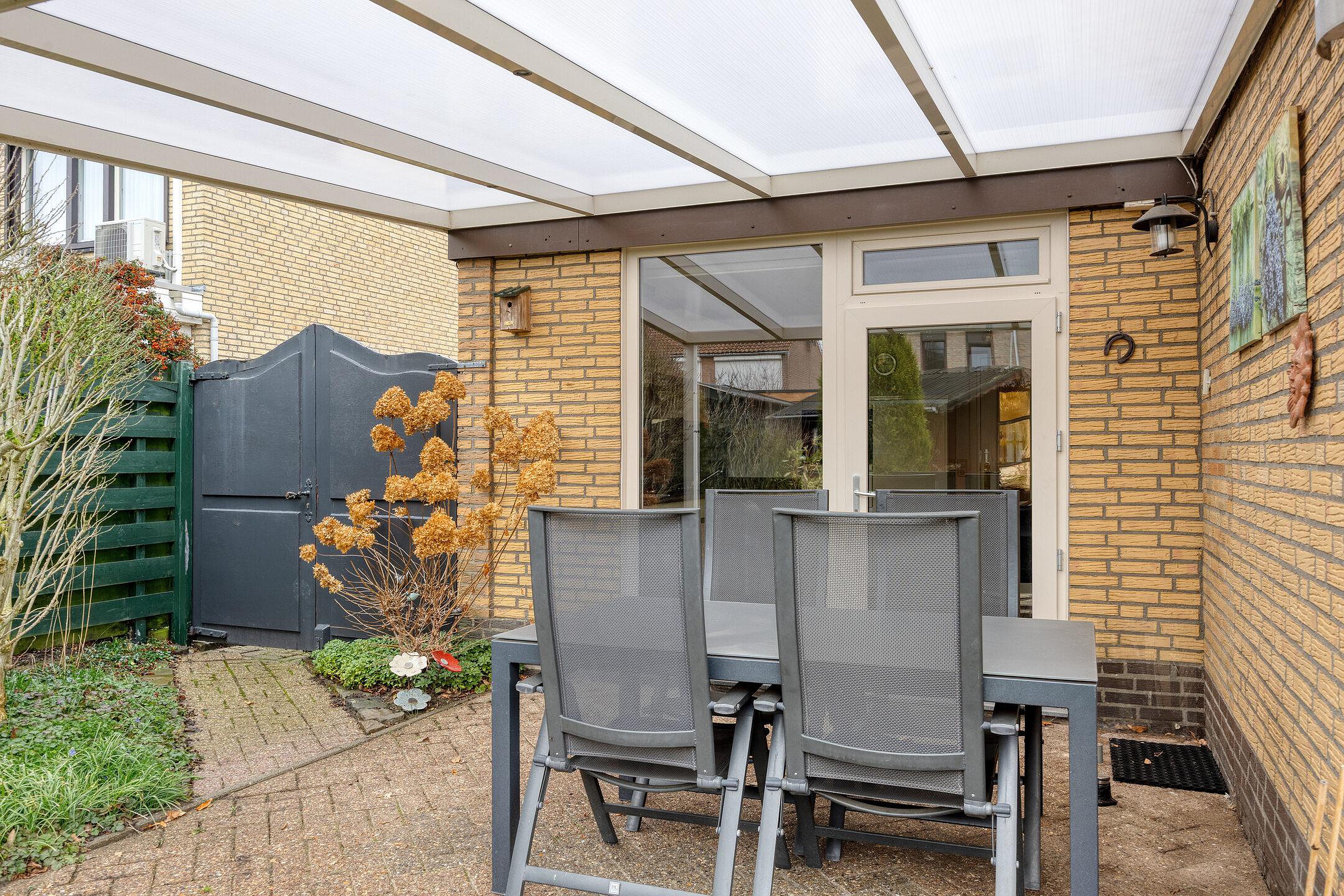 De zonnige achtertuin op het zuidwesten beschikt over een groot, deels overdekt terras en een sfeervol tuinhuis met tweede terras achter in de tuin. Hier geniet u in alle rust van optimale privacy en veel zonuren.