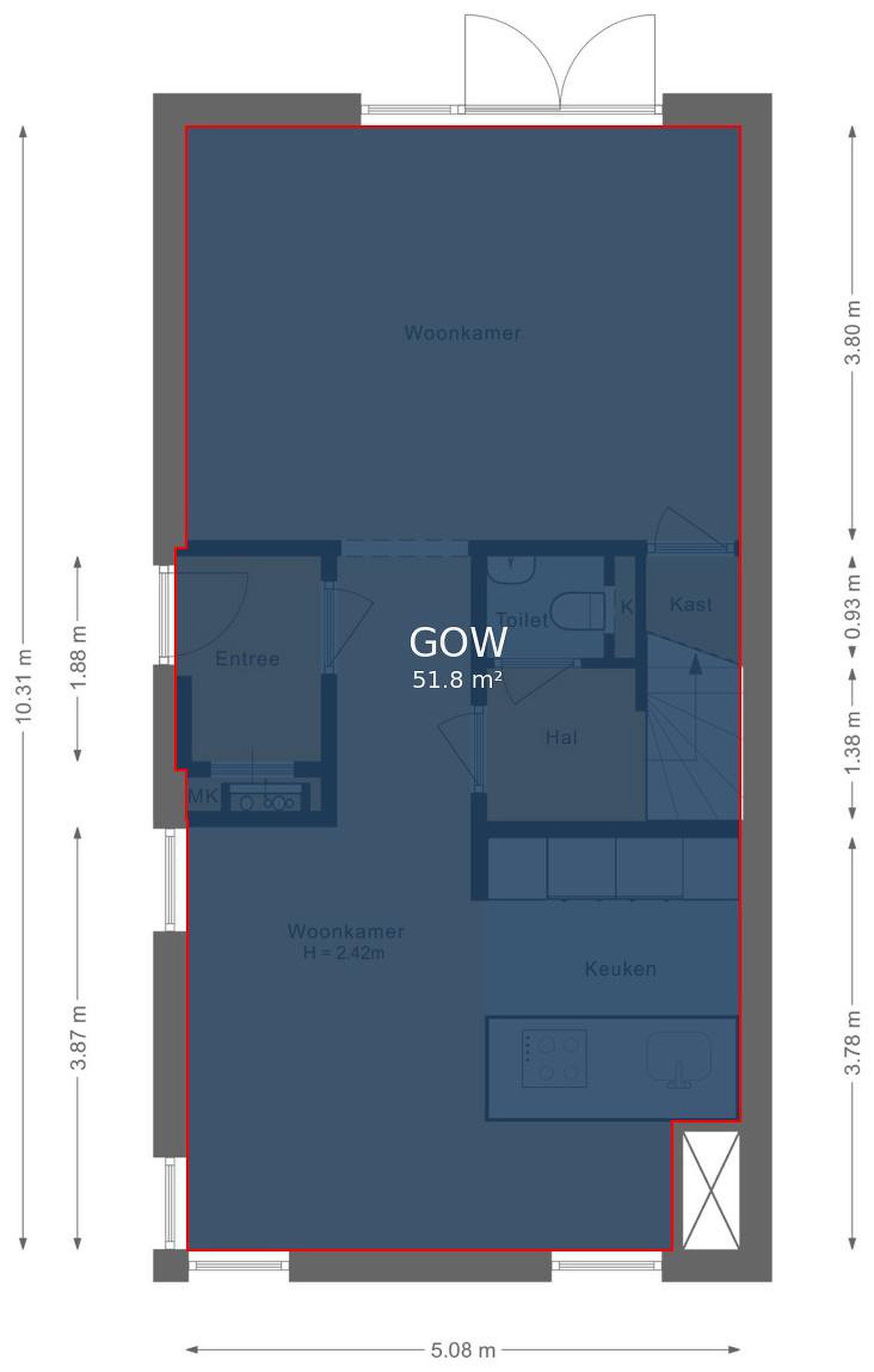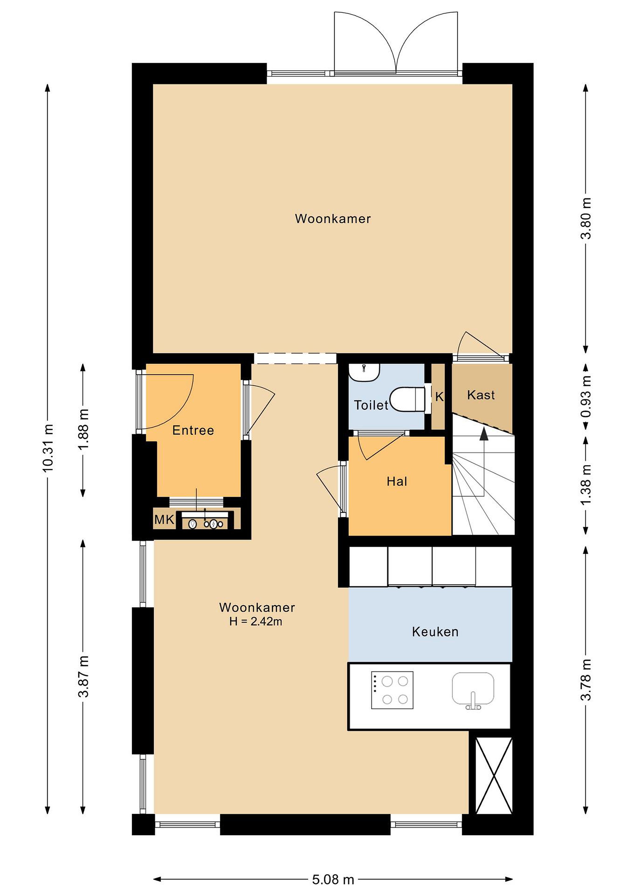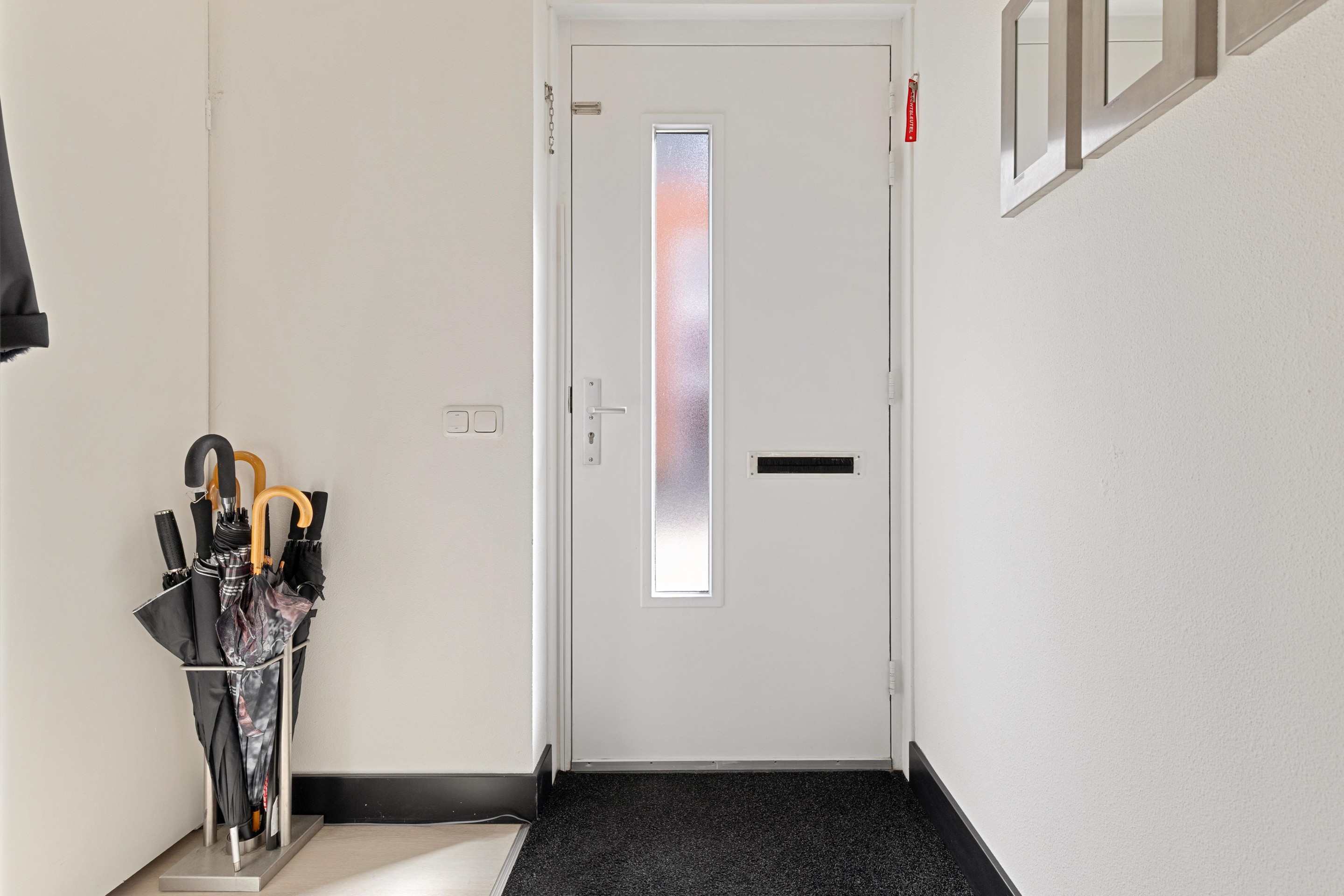 De entree aan de zijkant leidt naar een verzorgde hal met garderobe en meterkast. Een loopdeur geeft toegang tot de woonkamer en keuken.