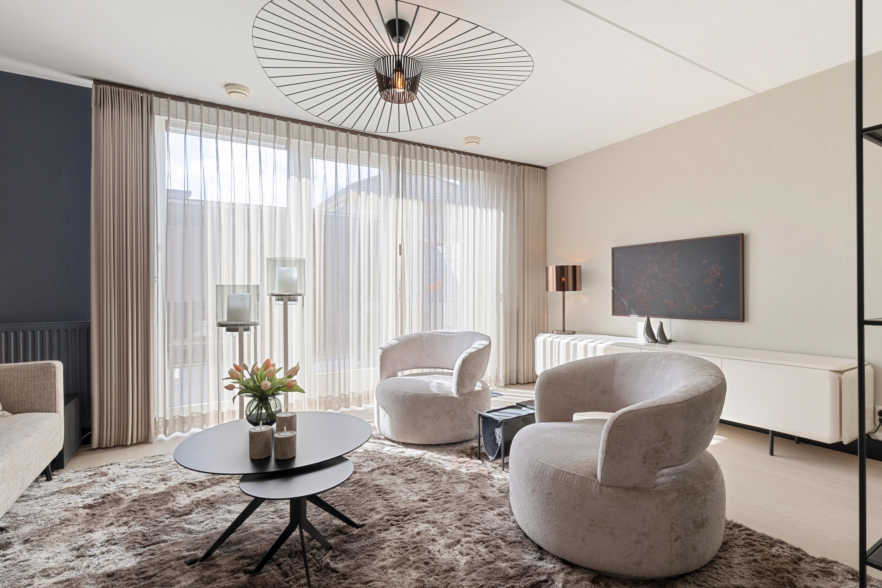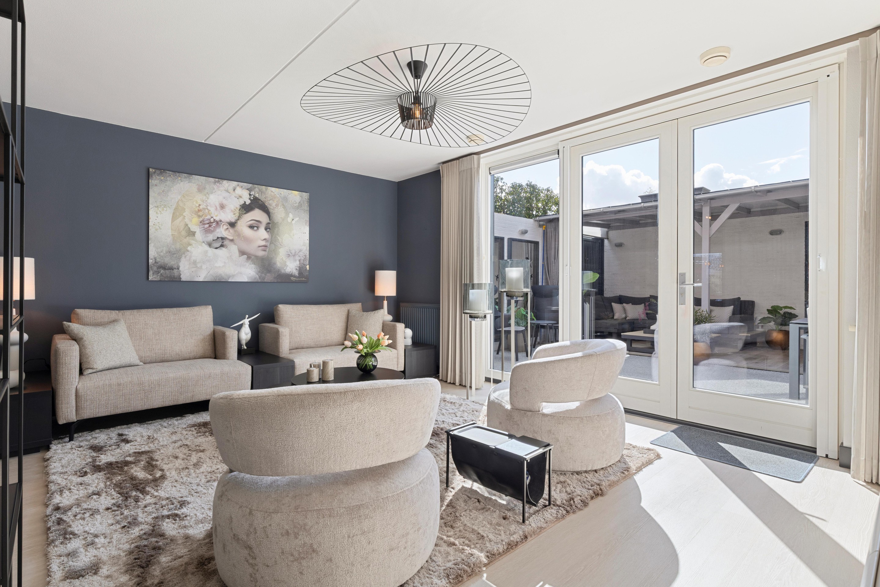 De woonkamer (ca.22m2), gelegen aan de tuinzijde, heeft veel lichtinval. Grote raampartijen en een vierluik met dubbele openslaande deuren creëren een naadloze verbinding tussen binnen en buiten, dit versterkt het gevoel van ruimte.