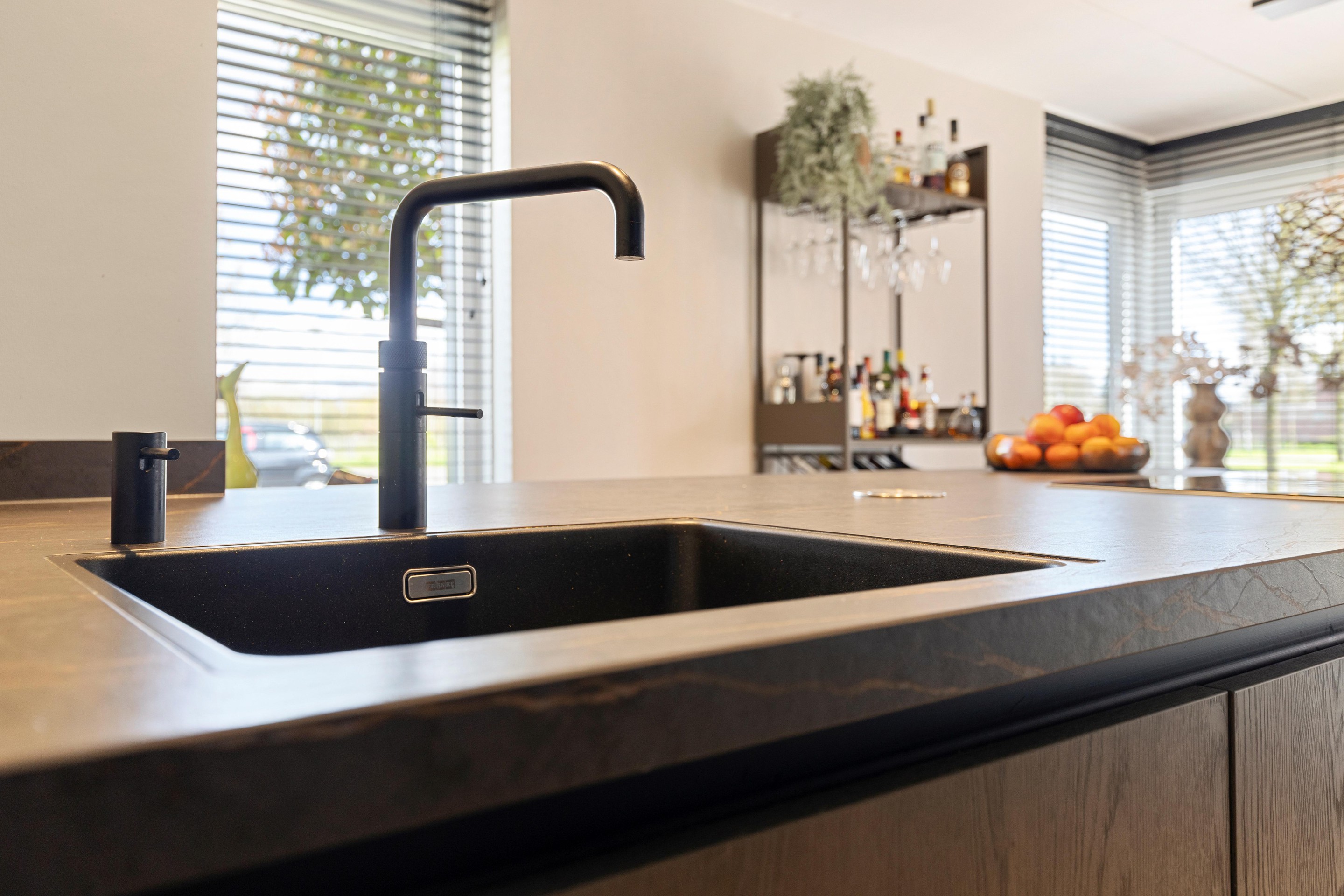 Aan de voorzijde bevindt zich de exclusieve leefkeuken (ca.19,5m2), die in semi-open verbinding staat met de woonkamer. Het royale kookeiland met keramisch werkblad in marmerlook vormt het hart van de ruimte en is uitgerust met hoogwaardige apparatuur, waaronder een zone-instelbare inductiekookplaat met geïntegreerde afzuiging, een Quooker, vaatwasser en wijnklimaatkast.