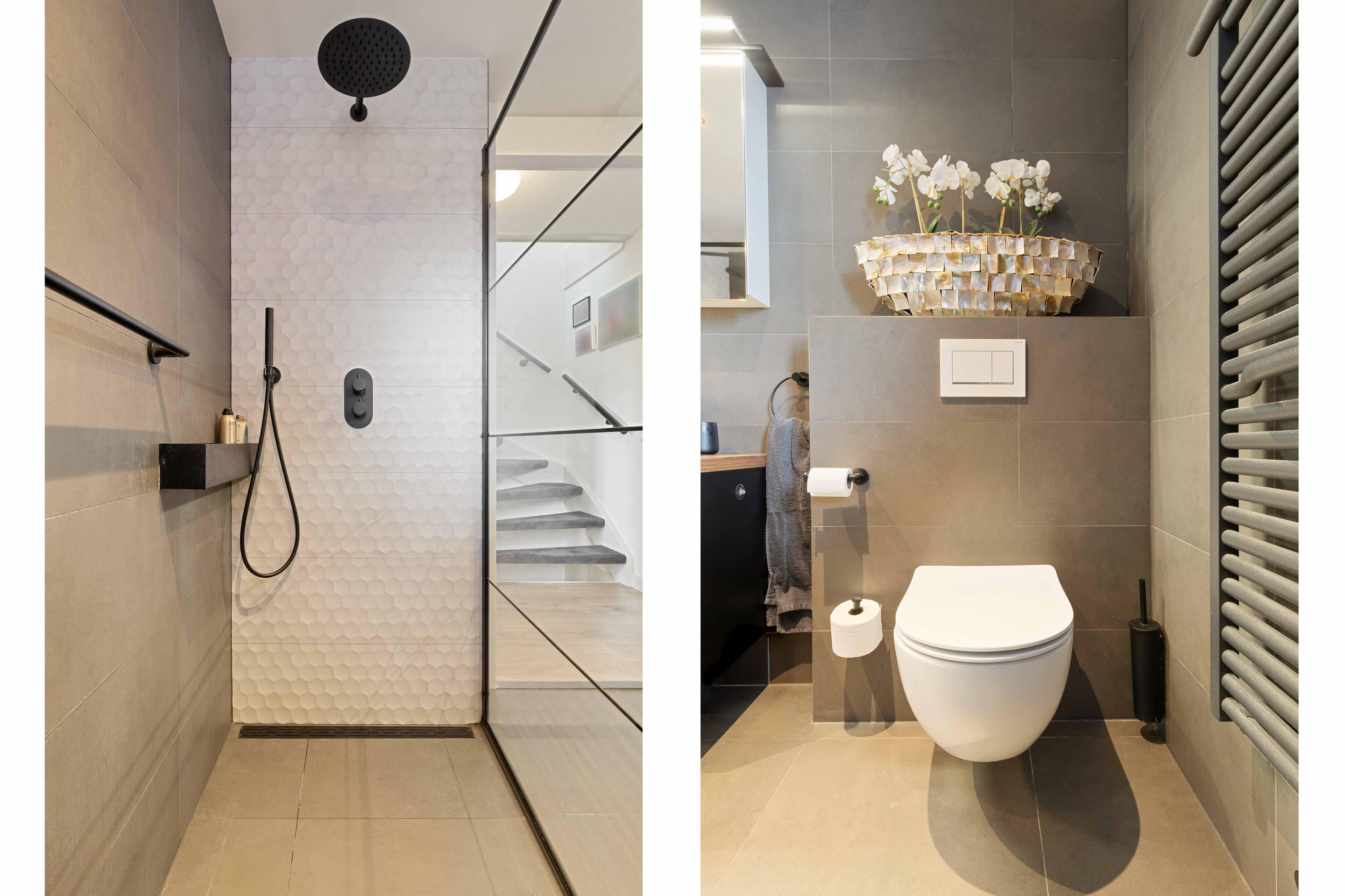 De luxe stijlvolle badkamer (ca.6,5m2) is in 2022 volledig vernieuwd en uitgevoerd met hoogwaardige materialen. De badkamer beschikt een wastafel met lades en dubbele waskommen, een bijpassende spiegelkastenwand, een ruime inloopdouche met inbouwkranen, een zwevend toilet, designradiator en verfijnde details zoals inbouwverlichting en maatwerk shutters. De badkamer is voorzien van een ventilatievenster en mechanische afzuiging.