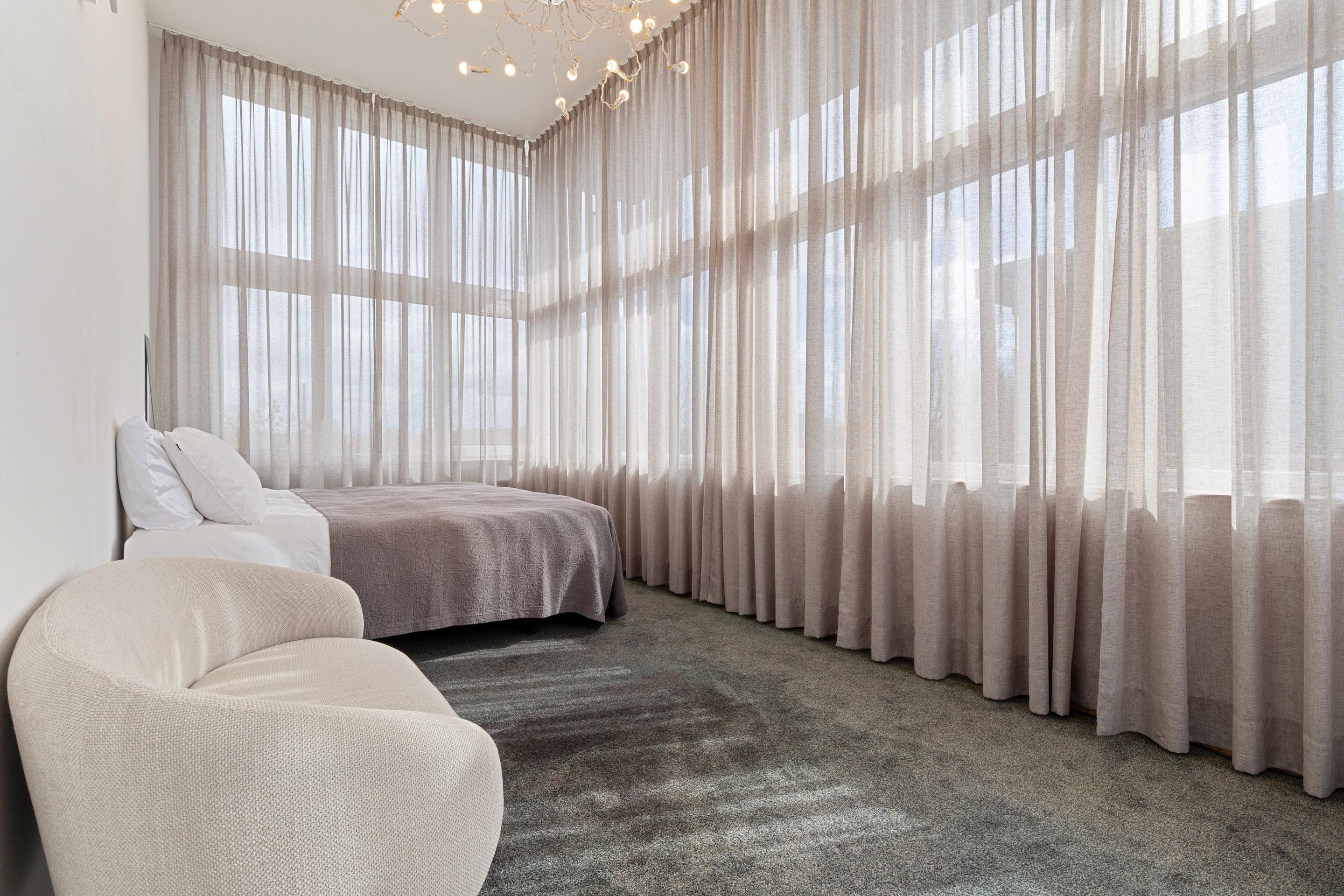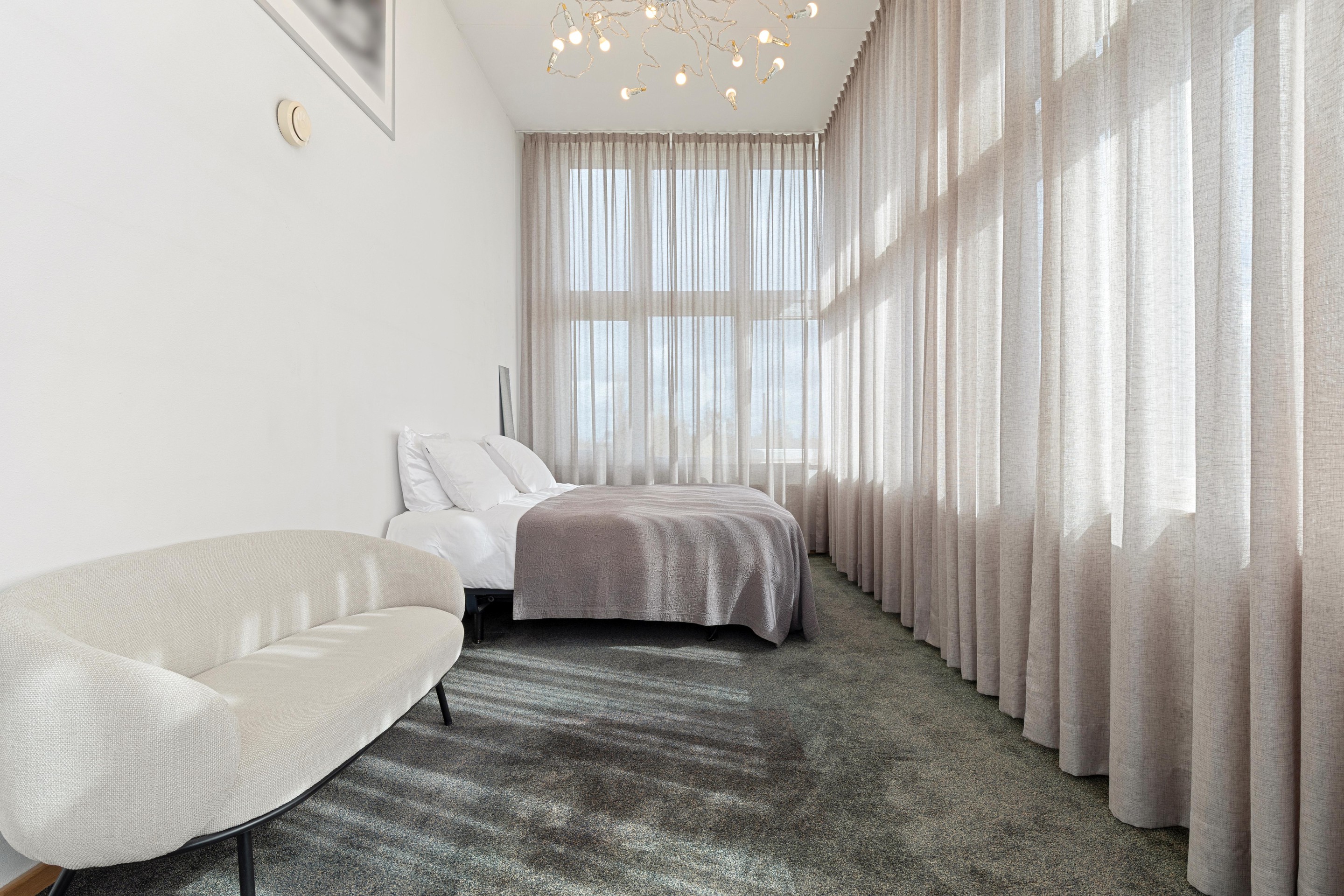 Hier bevindt zich de spectaculaire loftkamer in de toren: een lichte, open ruimte met hoge plafonds en glaswanden. Perfect als slaapkamer/ werkruimte of atelier (ca.18m2)