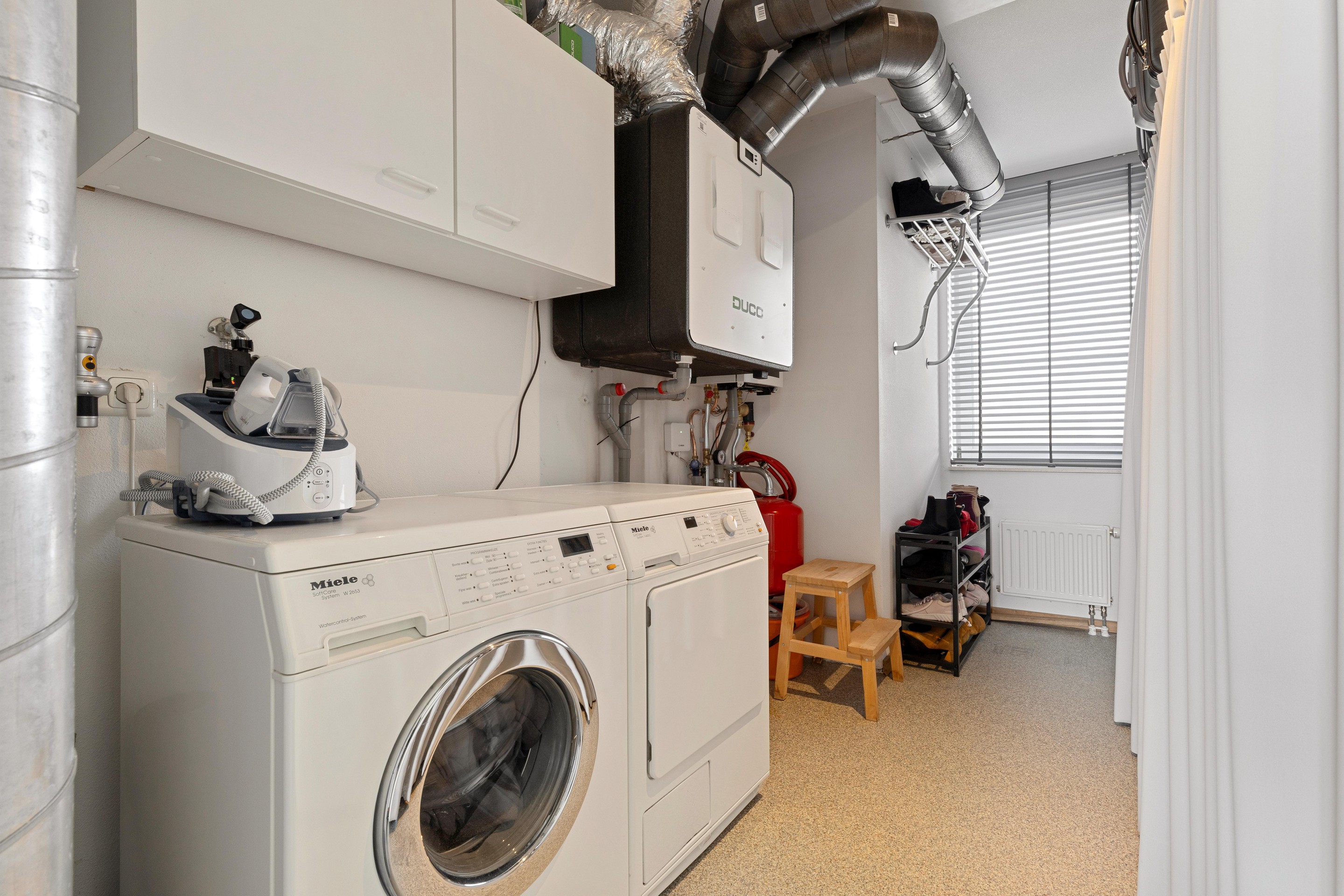 De ruimte is voorzien van airconditioning (koelen en verwarmen).Daarnaast is er een aparte was-/CV-ruimte (ca.9m2) met aansluitingen voor de wasmachine en droger. WTW-installatie en veel bergruimte. De wasruimte is voorzien van een groot ventilatievenster.