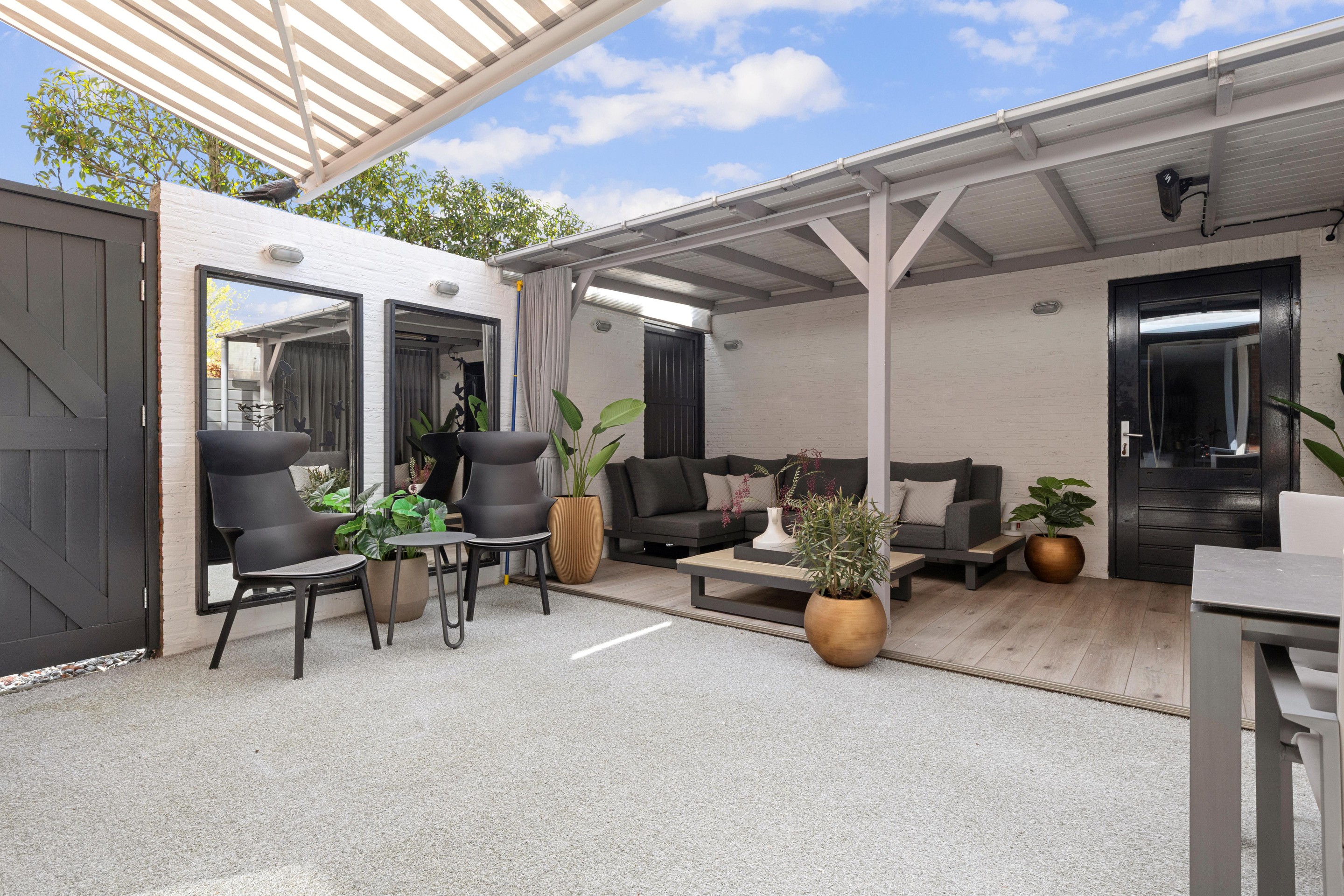 De buitenruimte is met dezelfde zorg en aandacht vormgegeven als het interieur. De zonnige patio-achtertuin, volledig vernieuwd in 2022, biedt een perfecte balans tussen comfort en onderhoudsgemak.