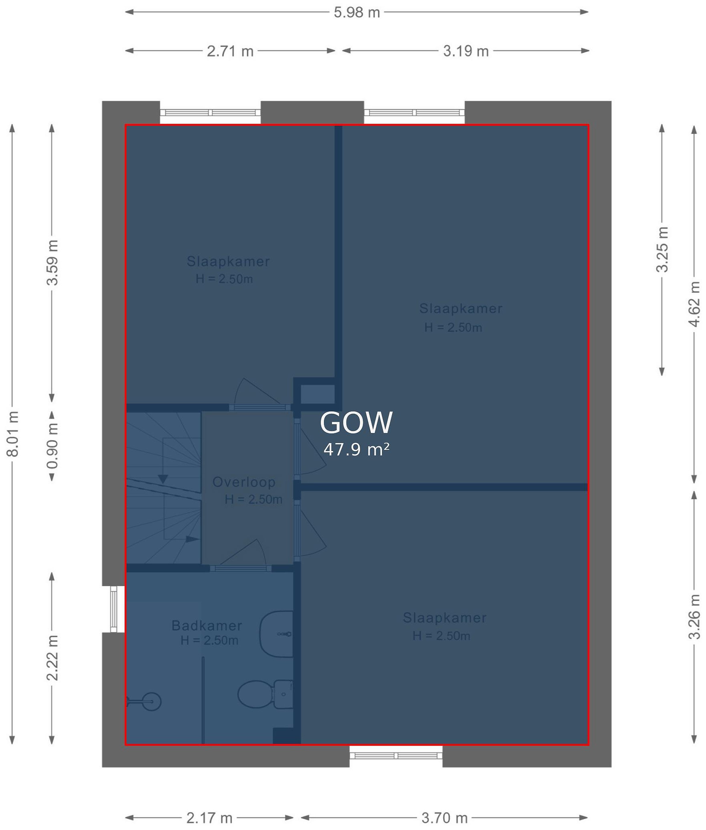 De overloop geeft toegang tot 3 slaapkamers (ca. 10, 12 en 15m2) en de badkamer.