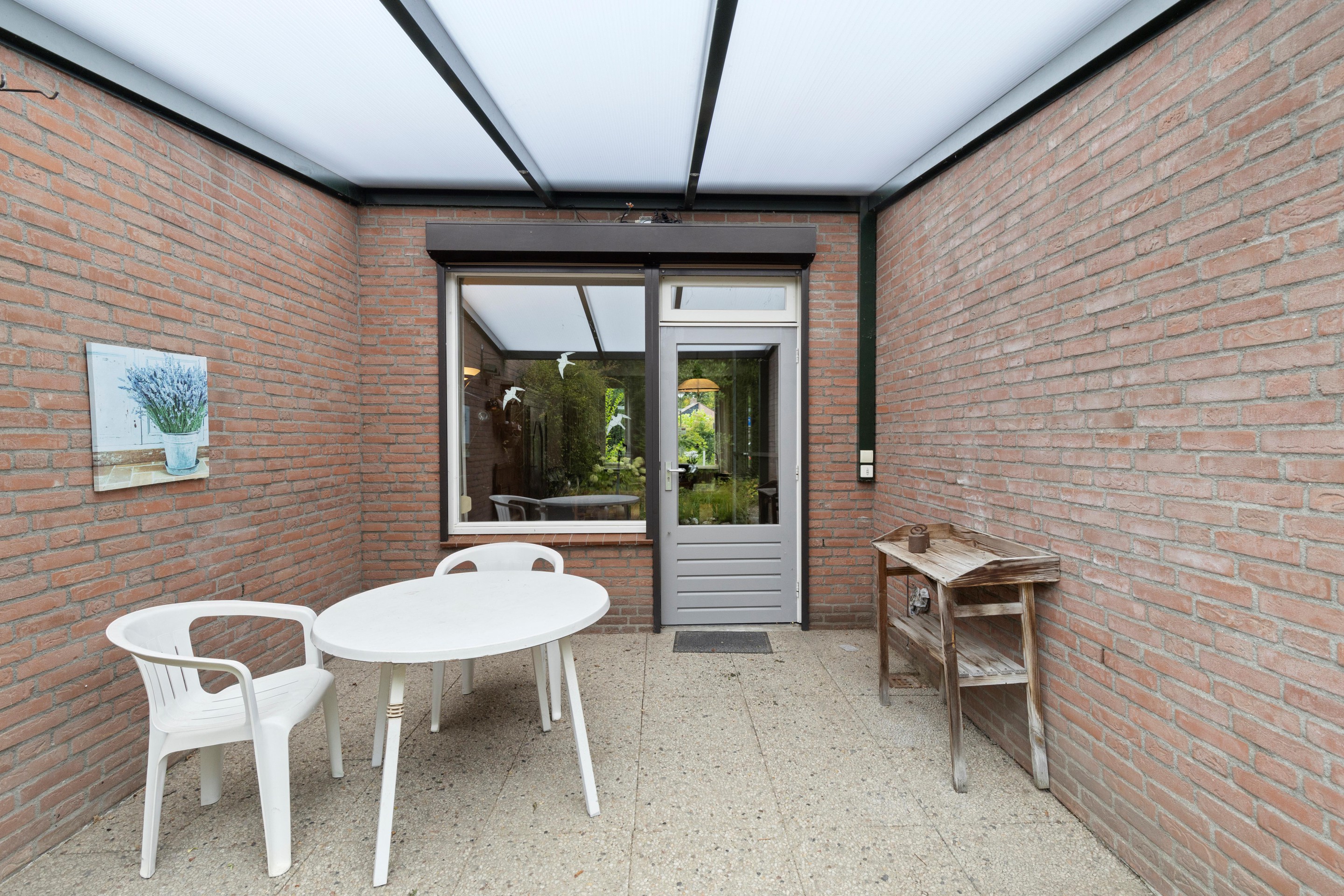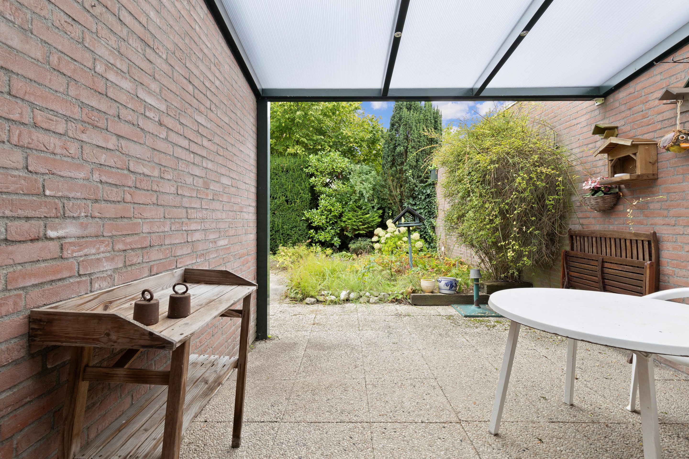 De achtertuin is gelegen op het zuidoosten en heeft een terras grenzend aan de woning. Aan de woonkamer is het terras overdekt met een recent vernieuwde overkapping met inbouwspots. Er hangt een zonnescherm aan de keuken. Verder heeft de tuin borders met beplanting, groene omheining een veel privacy.
