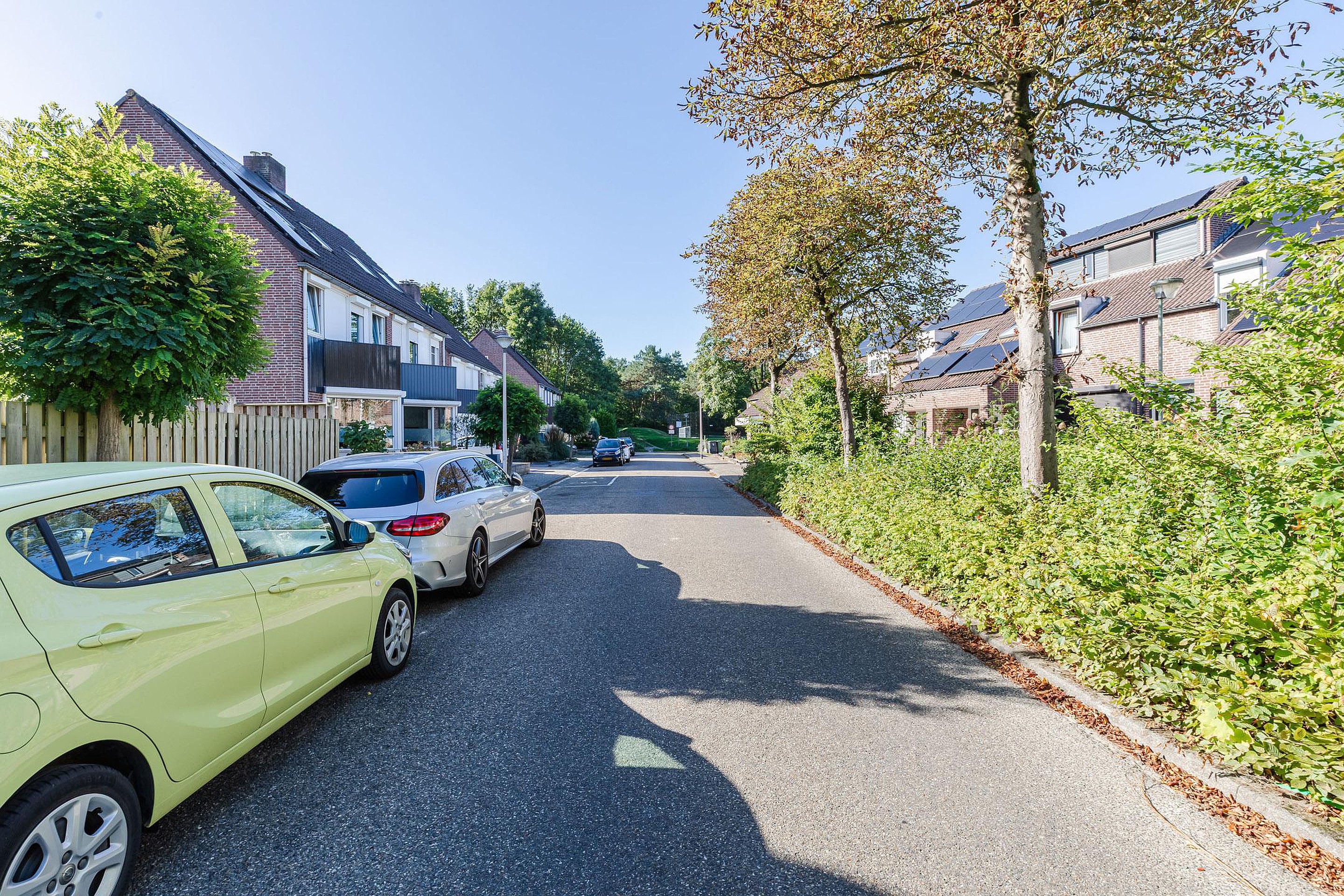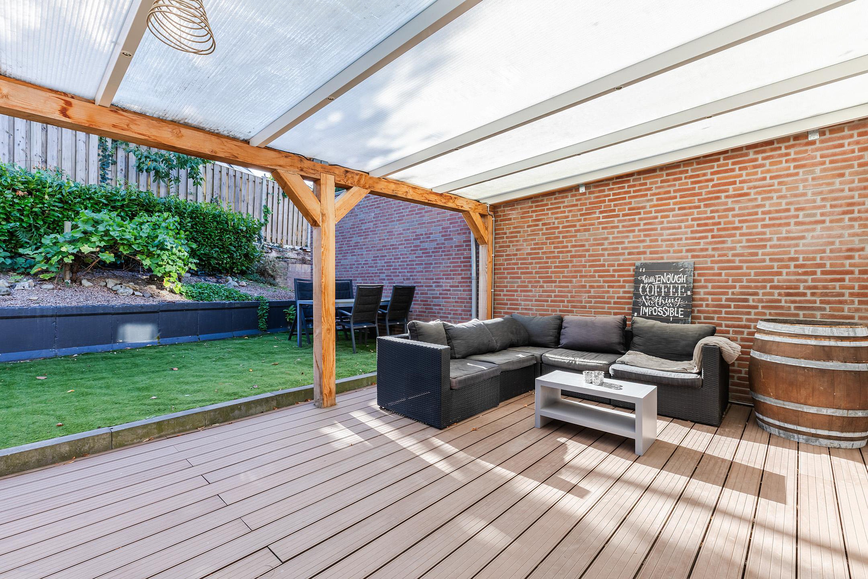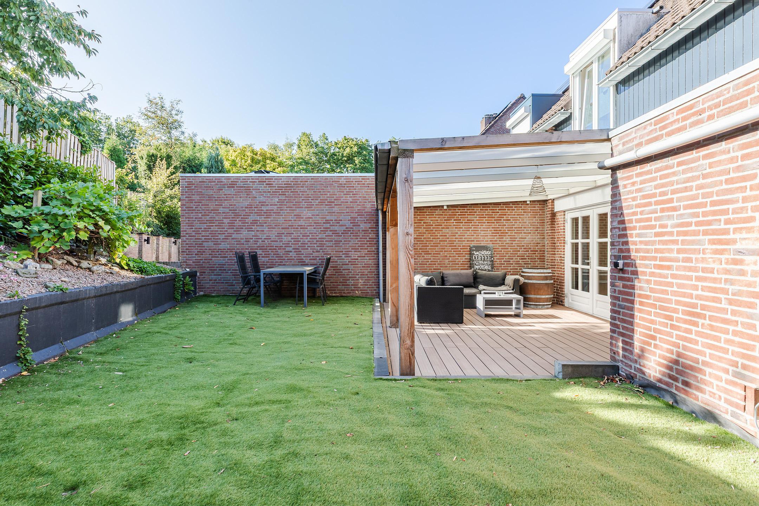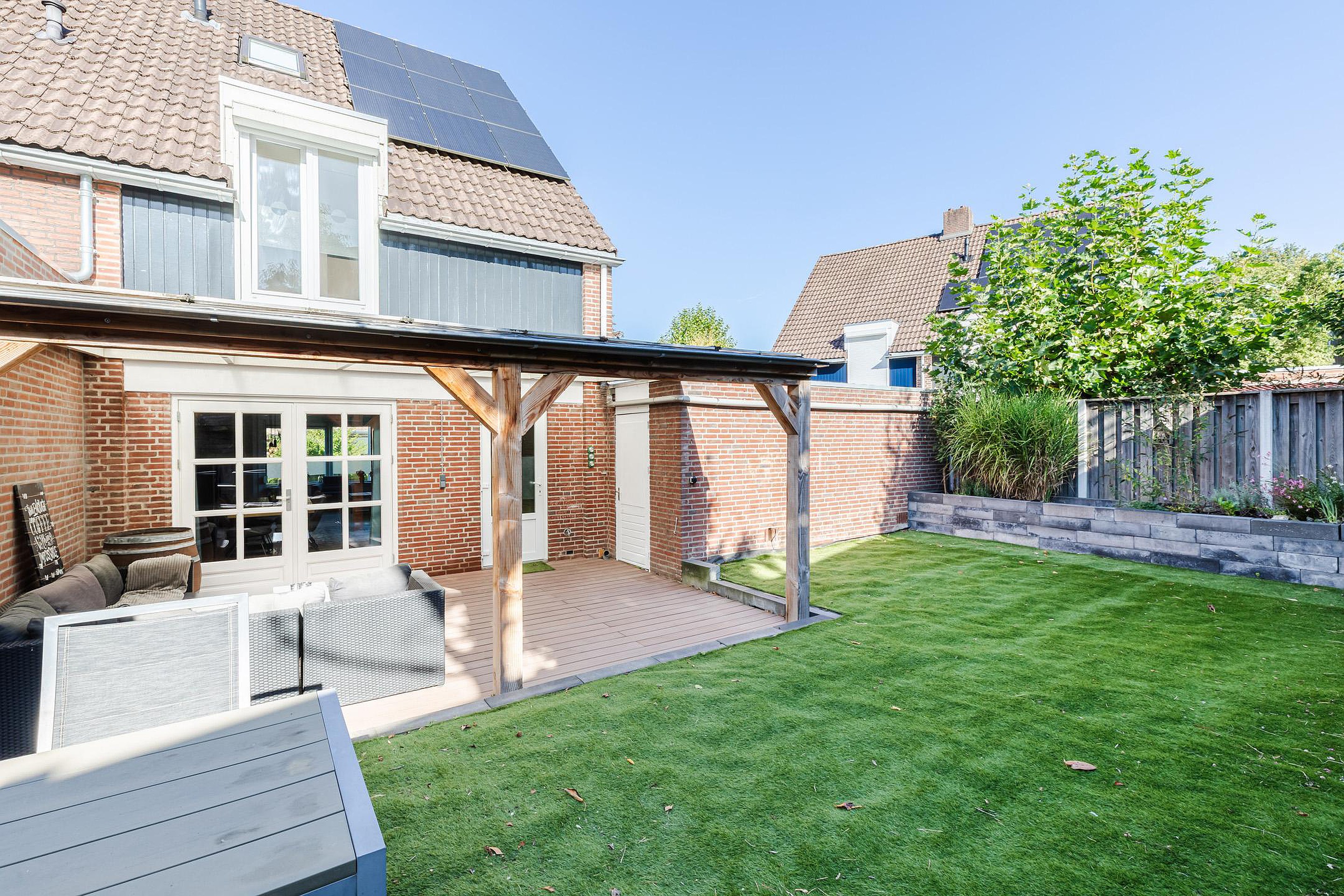 De onderhoudsvriendelijke achtertuin heeft een grote terrasoverkapping (ca. 22m2) aan de woning. Dit terras is voorzien van vlonderplanken. Vanuit dit terras is er toegang tot de garage. Verder is de tuin voorzien van een groot kunstgrasgazon en borders met beplanting. Aan de achterzijde is er geen bebouwing, dus de tuin biedt veel privacy. De tuin is gelegen op het zuidoosten.