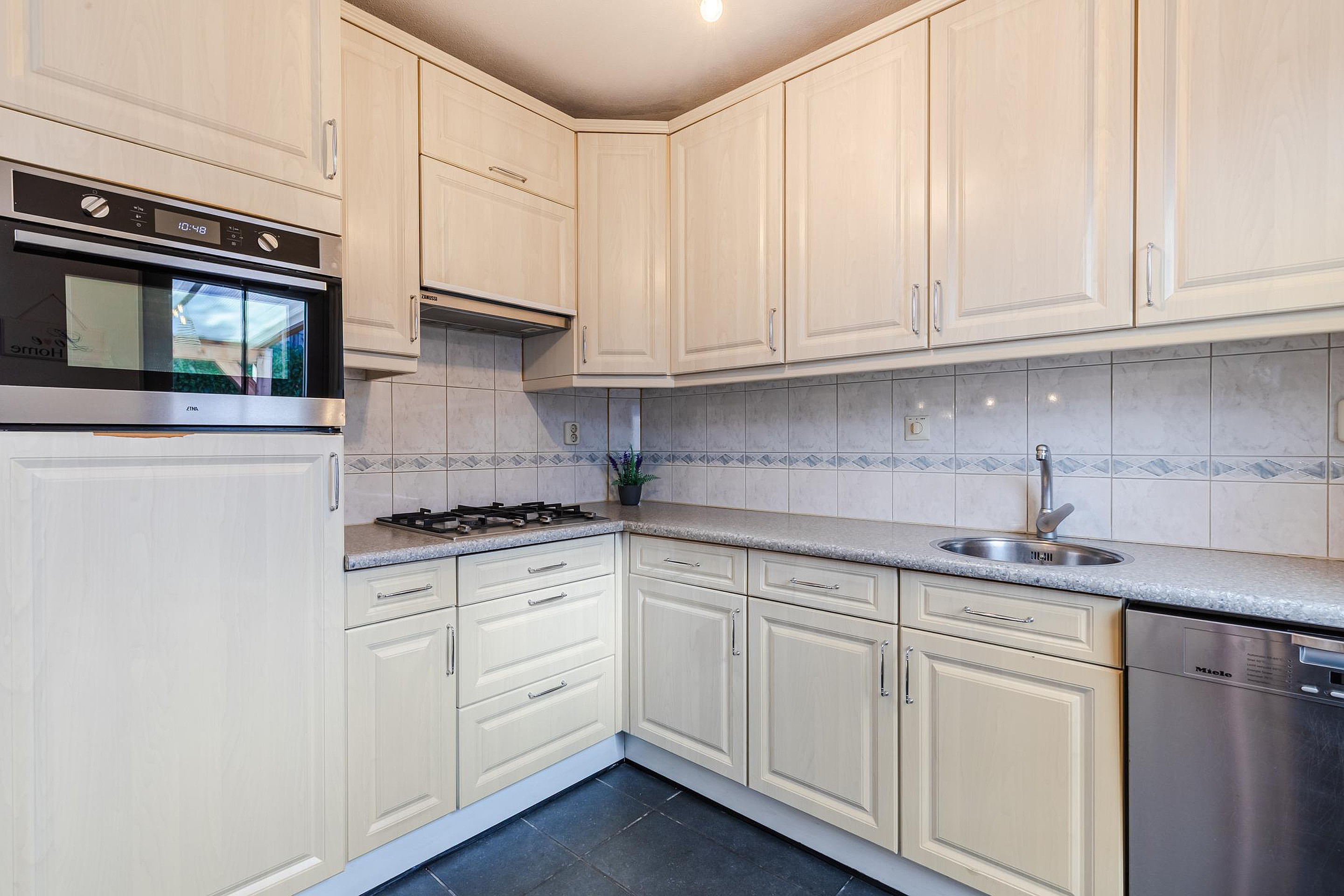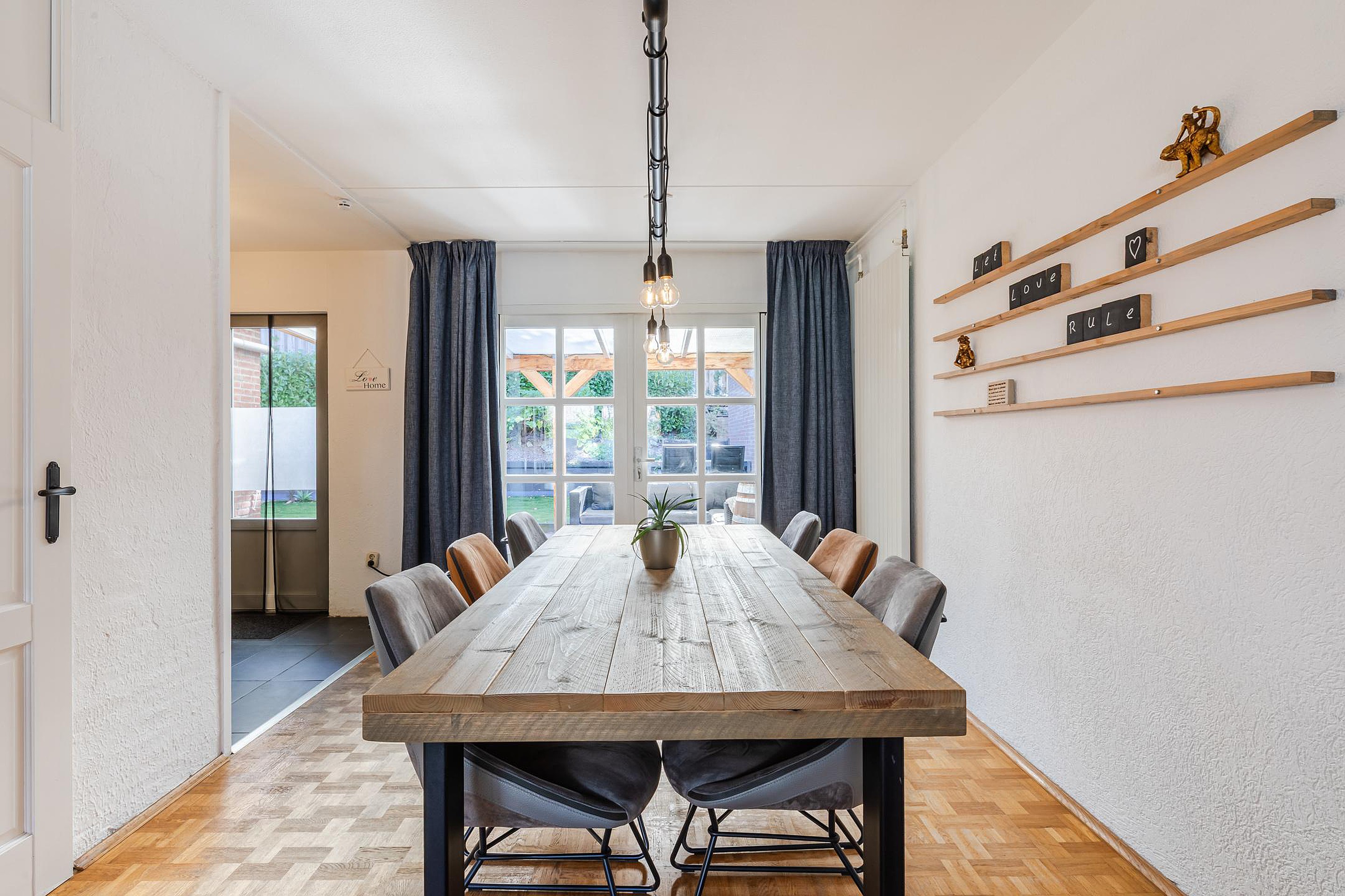 Vanuit de eigen oprit is er toegang tot de entree van de woning. De entree/ hal met garderobenis geeft toegang tot de trapopgang naar de 1e verdieping, de toiletruimte, de meterkast en de woonkamer. De deels betegelde toiletruimte is voorzien van een staand closet en fonteintje. De hal en de woonkamer zijn voorzien van blokjesparket. De woonkamer is ruim van opzet, ca. 36m2. Aan de voorzijde is er een moderne erker. Centraal in de woonkamer is er een trapkast. Aan de achterzijde zijn er openslaande tuindeuren. Door de grote raampartij is er een optimaal tuincontact. De semi-open keuken is ingericht met een 4-pitsgasfornuis, afzuigkap, combi-oven, koelkast en vaatwasser. De keuken is voorzien van een tegelvloer. Middels een loopdeur is er toegang tot het grote overdekte terras.