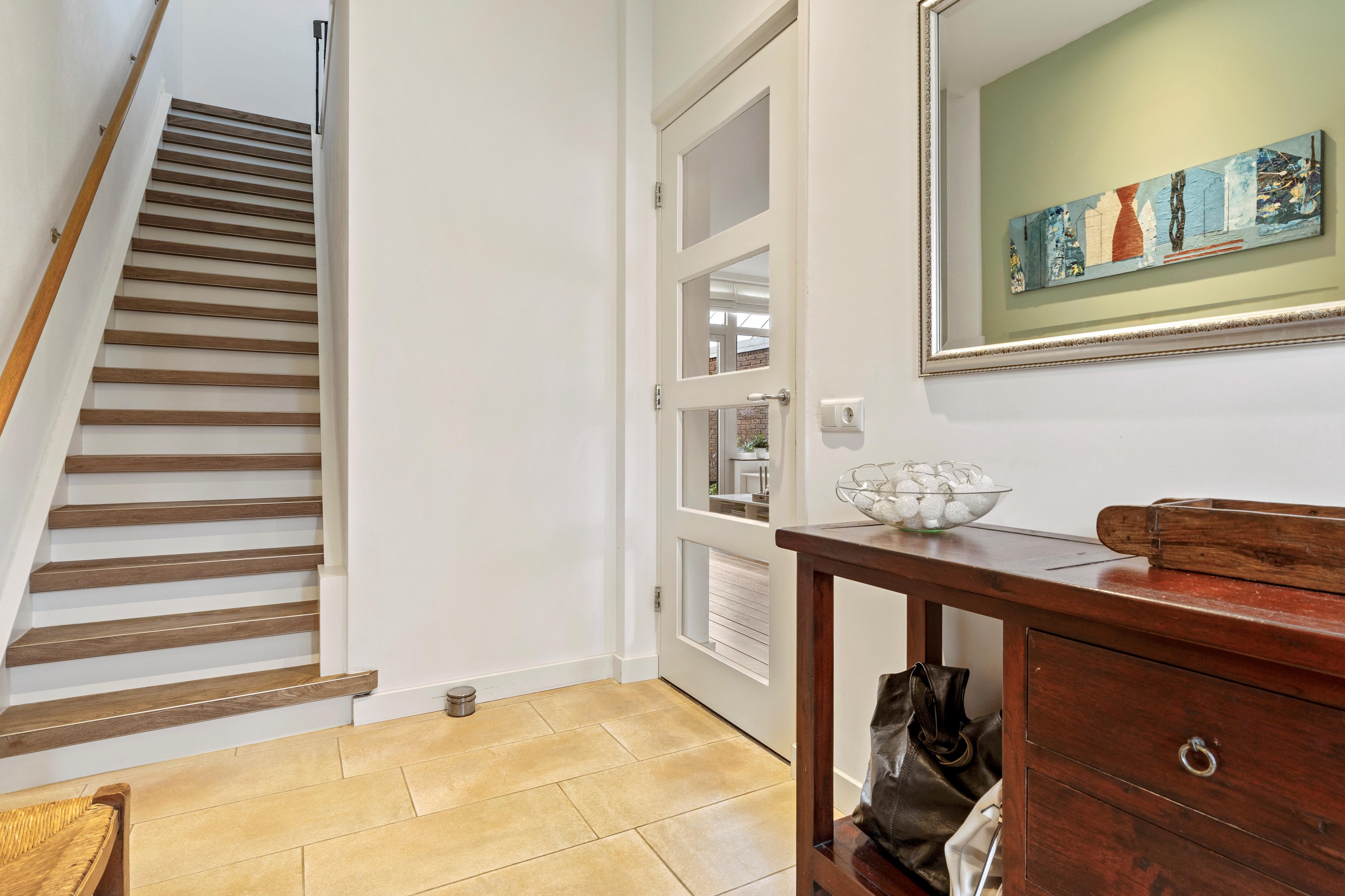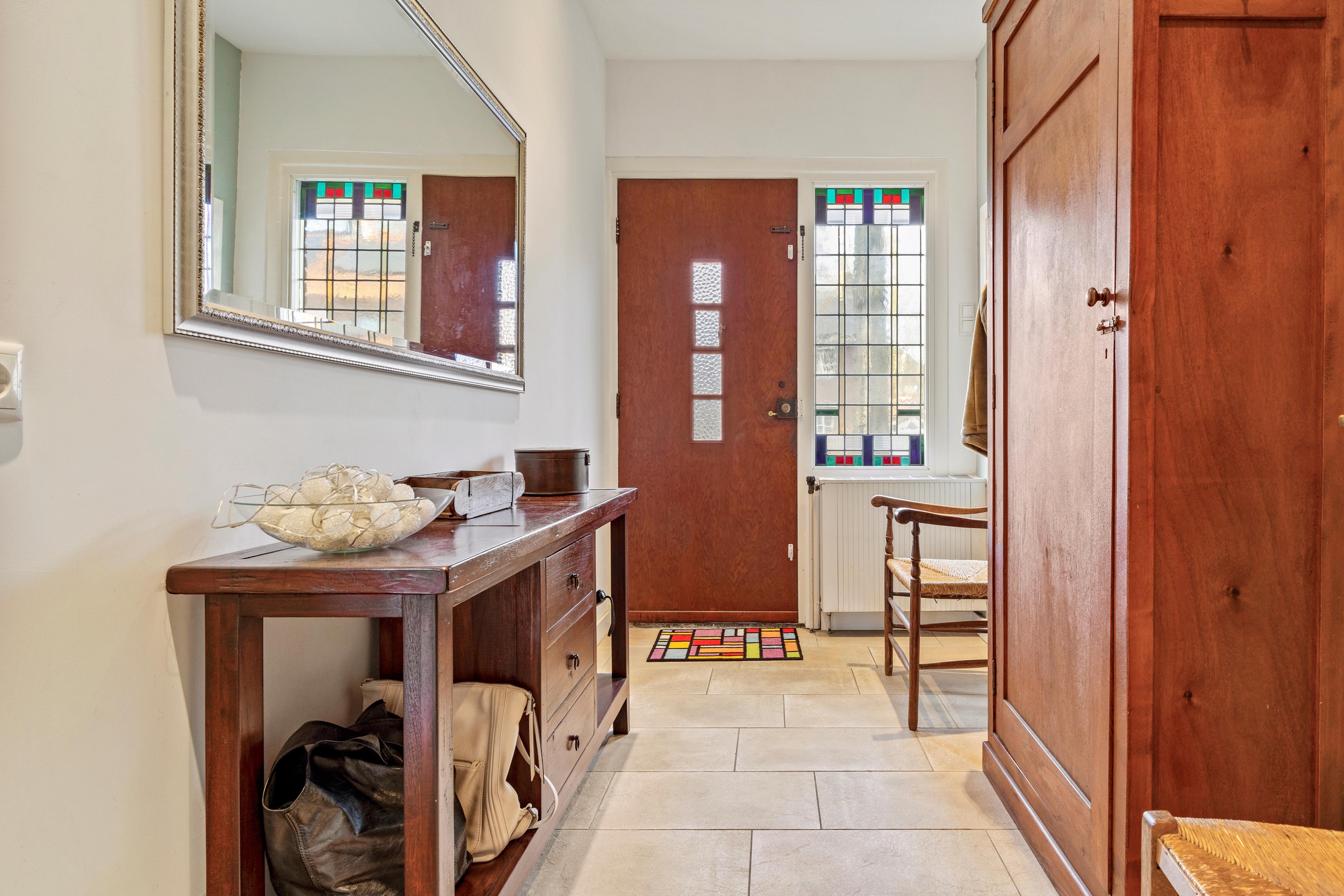 De woning beschikt over originele glas-in-loodramen en paneeldeuren.