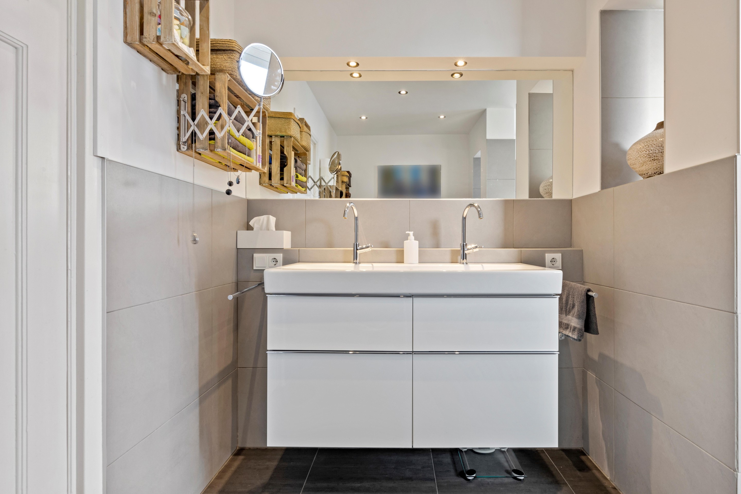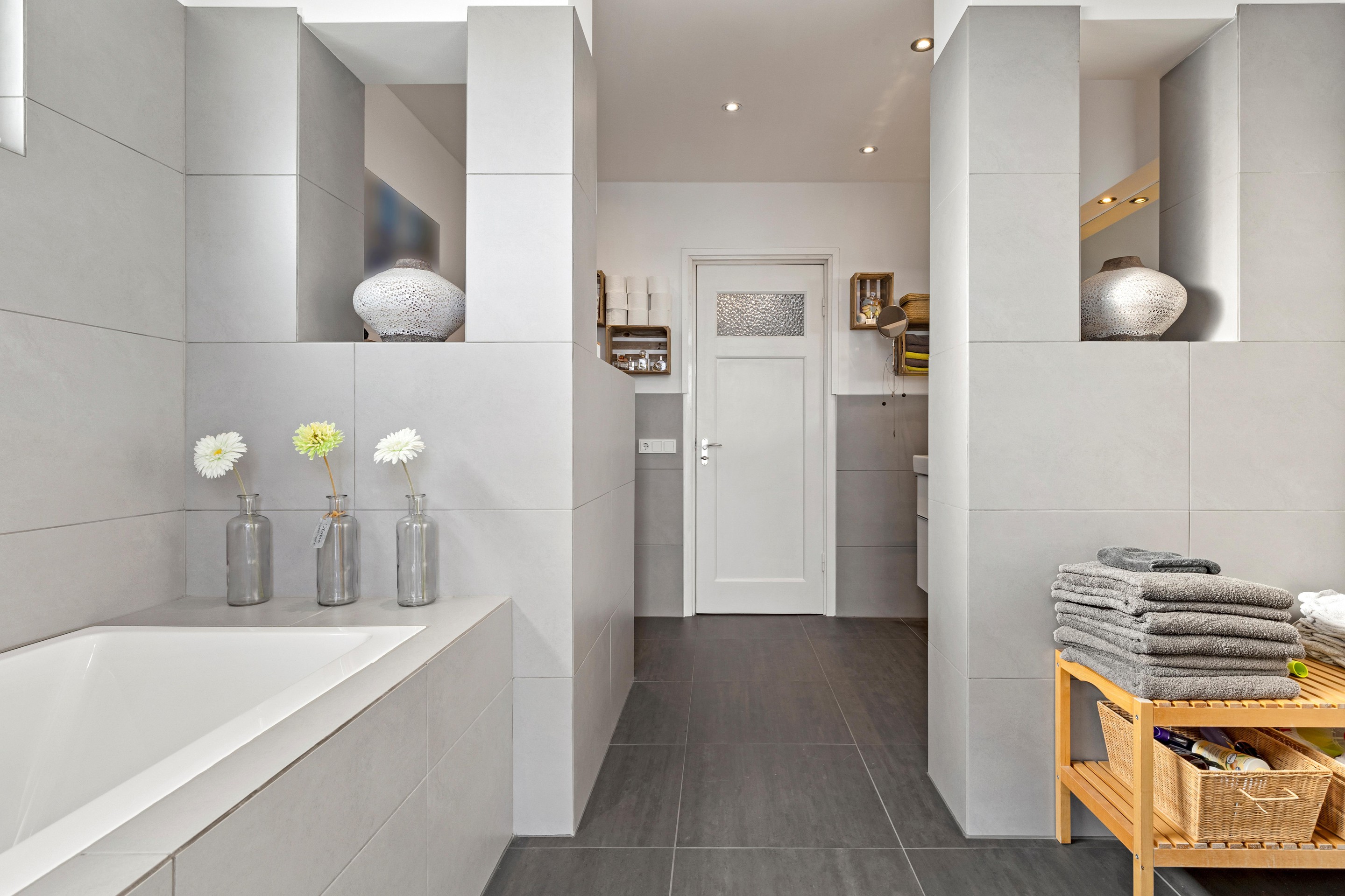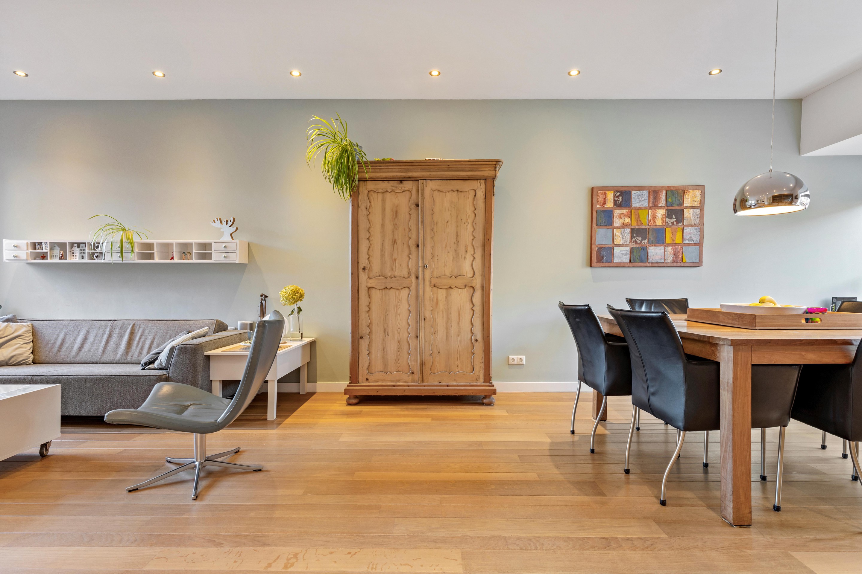 De hal, keuken en bijkeuken zijn afgewerkt met een tegelvloer; de woonkamer is voorzien van een massieve parketvloer. De keuken, bijkeuken en toiletruimte beschikken over vloerverwarming. Wanden en plafonds zijn strak afgewerkt en voorzien van inbouwspots. Het schakelmateriaal is vernieuwd.