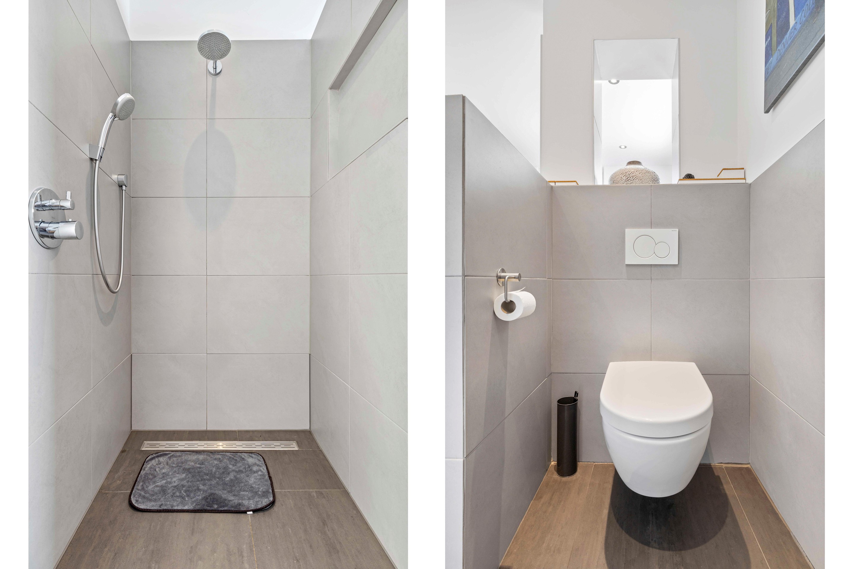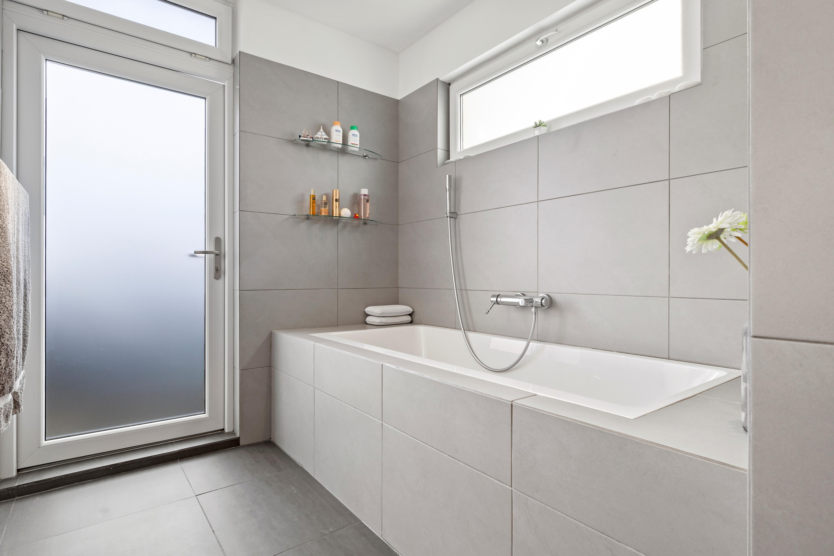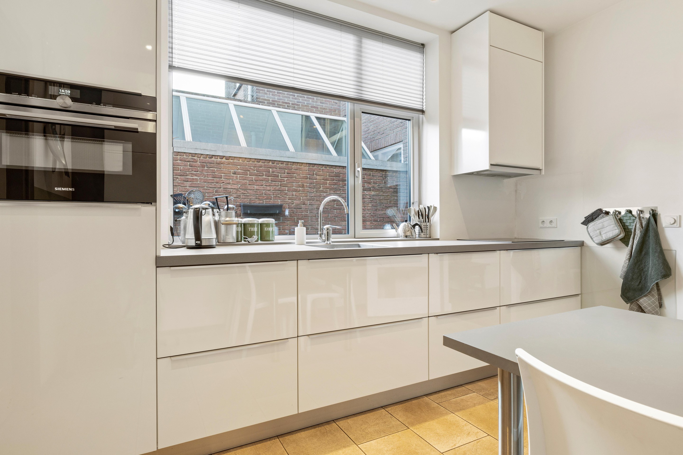 De keuken (ca.11,5m2) is ingericht met een modern keukenblok en voorzien van een inductiekookplaat met afzuigkap, koelkast en combi oven-magnetron. Daarnaast is er een vaste kastenwand met extra bergruimte. Vanuit de keuken is er zicht op het terras. Aangrenzend bevindt zich de bijkeuken (ca.8,5m2) met een loopdeur naar de tuin. In de bijkeuken zijn de aansluitingen voor wasmachine, droger en vaatwasser aanwezig. Vanuit de bijkeuken is er toegang tot de cv-ruimte en de toiletruimte. Het toilet is deels betegeld en voorzien van een staand closet, fontein en ventilatievenster.