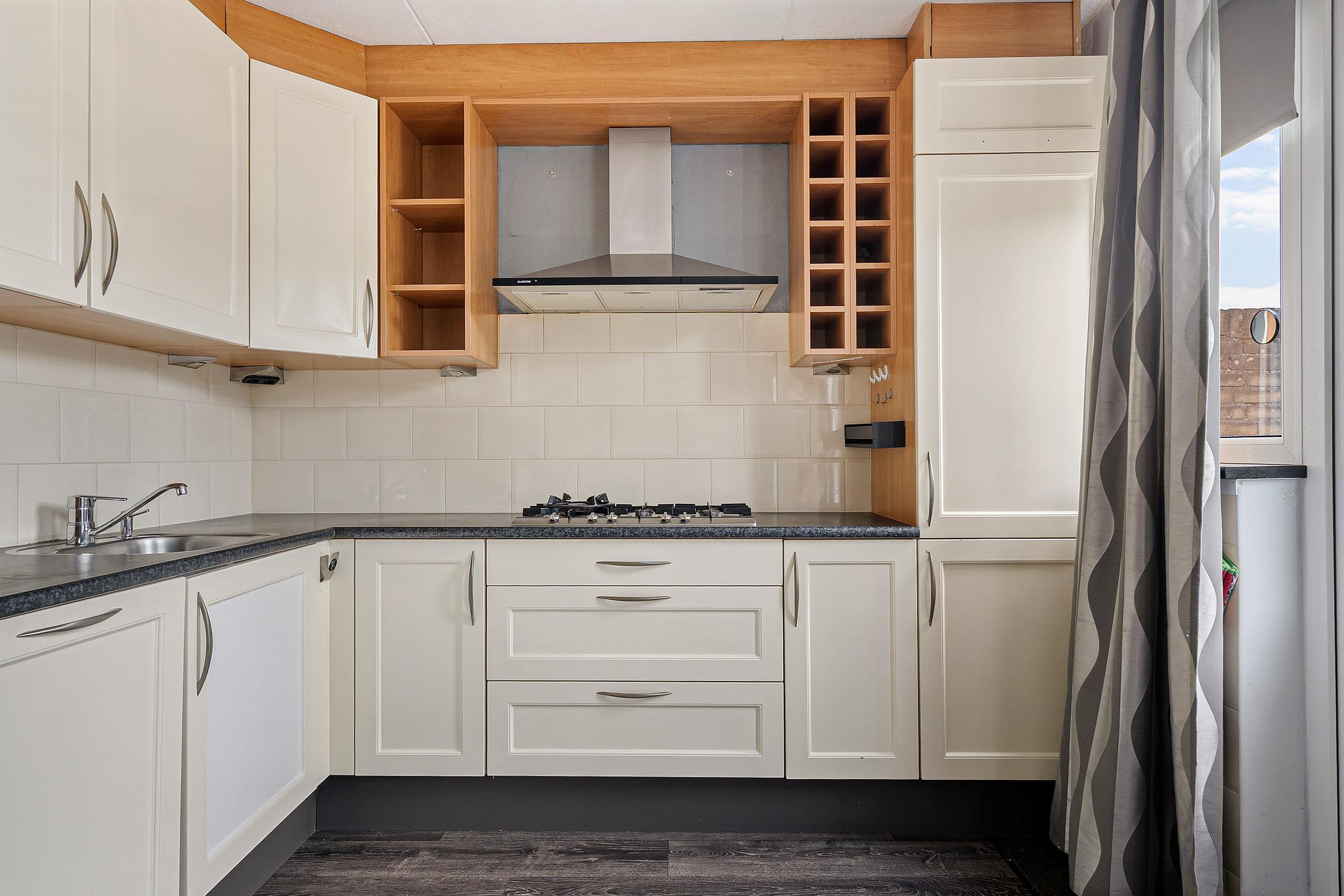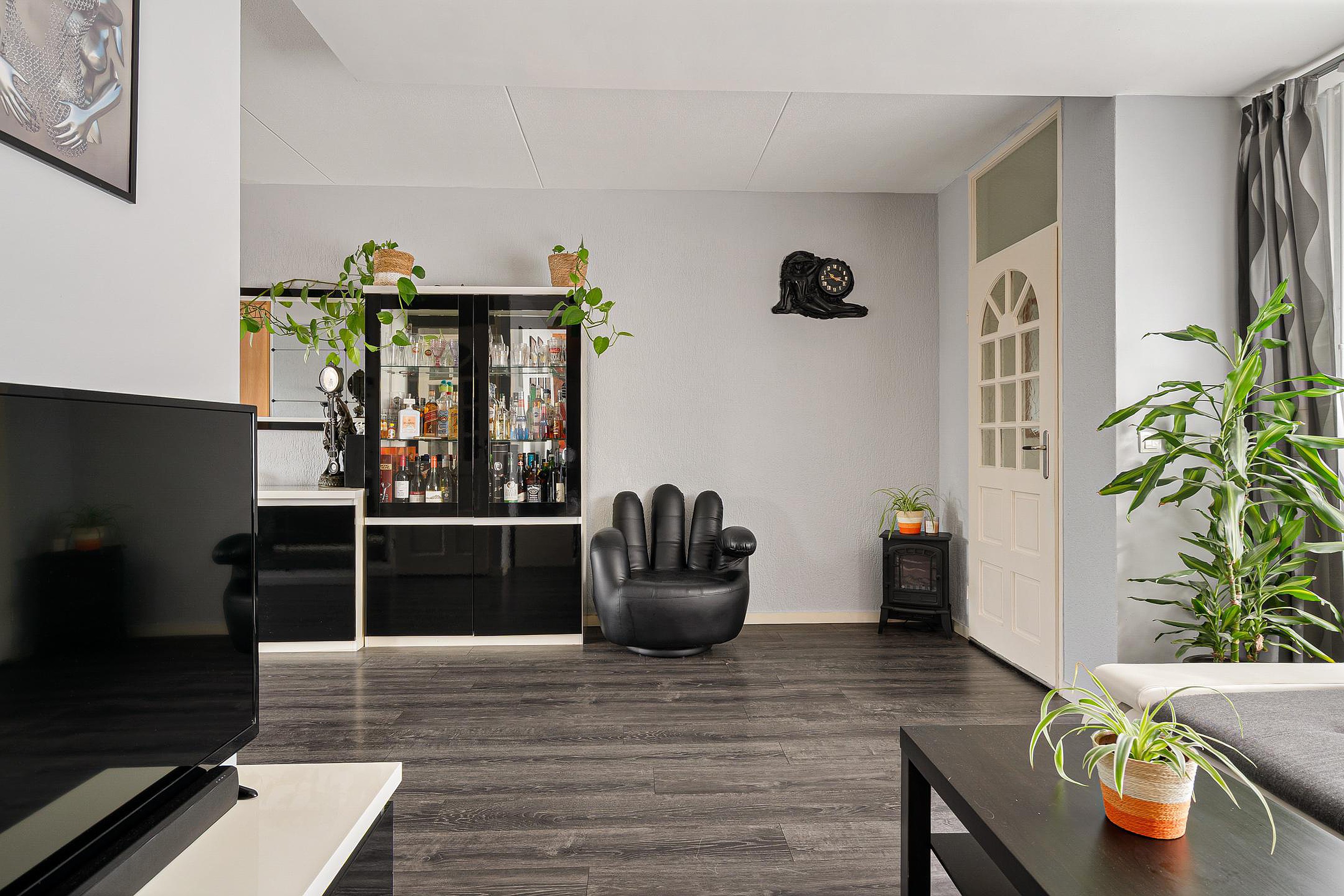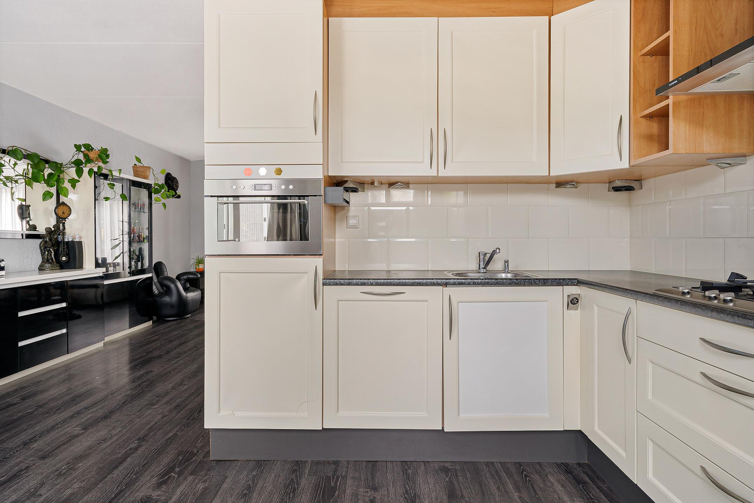Entree, hal met meterkast voorzien van aardlekschakelaar, diverse groepen. Royale woonkamer met laminaat vloer. Tussenhal met toiletruimte en trapopgang naar de 1e etage. De lichte, open keuken is uitgevoerd in hoekopstelling met boven- en onderkasten voor voldoende bergruimte. De keuken is voorzien van de volgende inbouwapparatuur: gaskookplaat, afzuigkap, koelkast met vriesvak, combi-magnetron en vaatwasser.