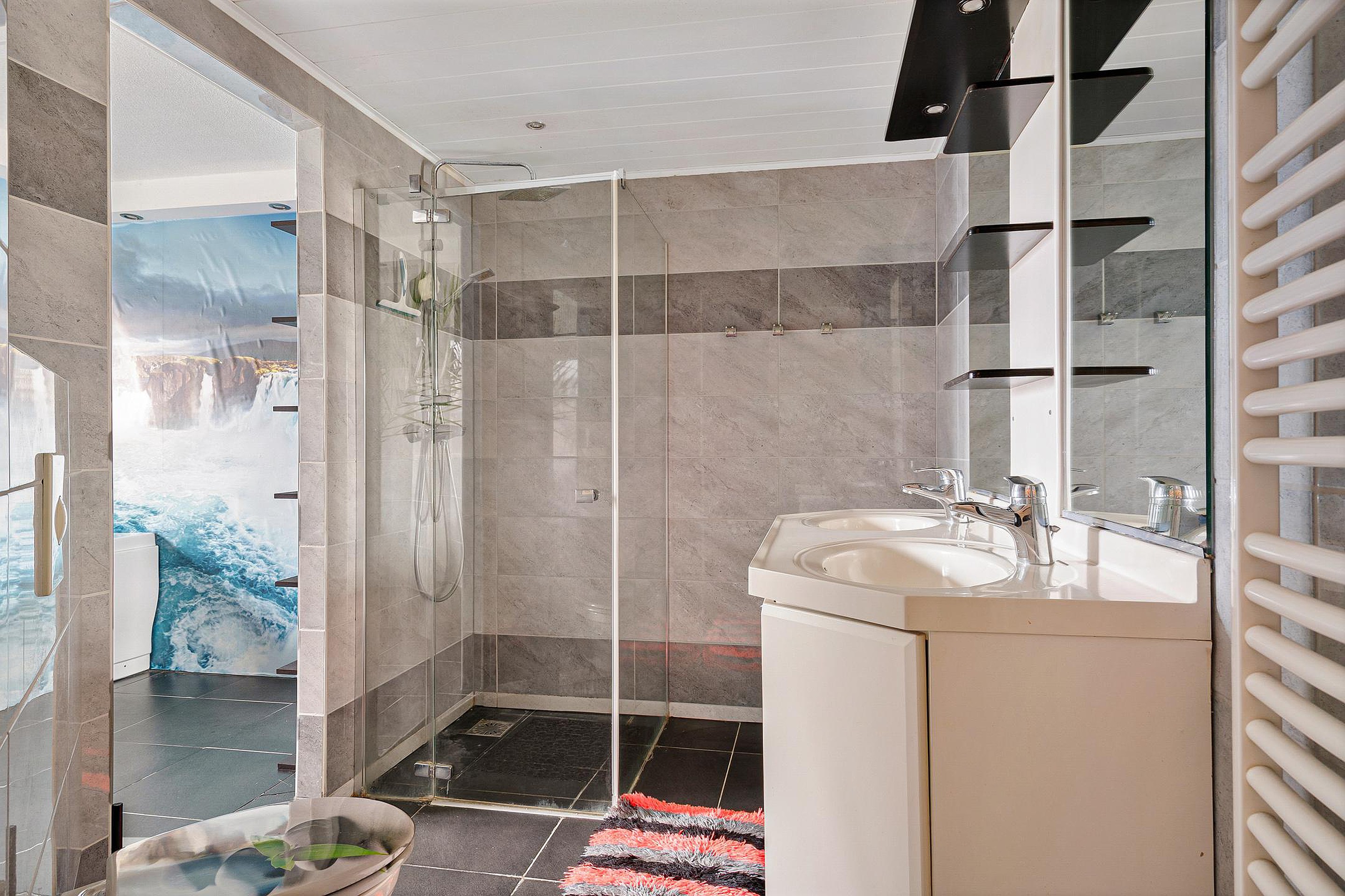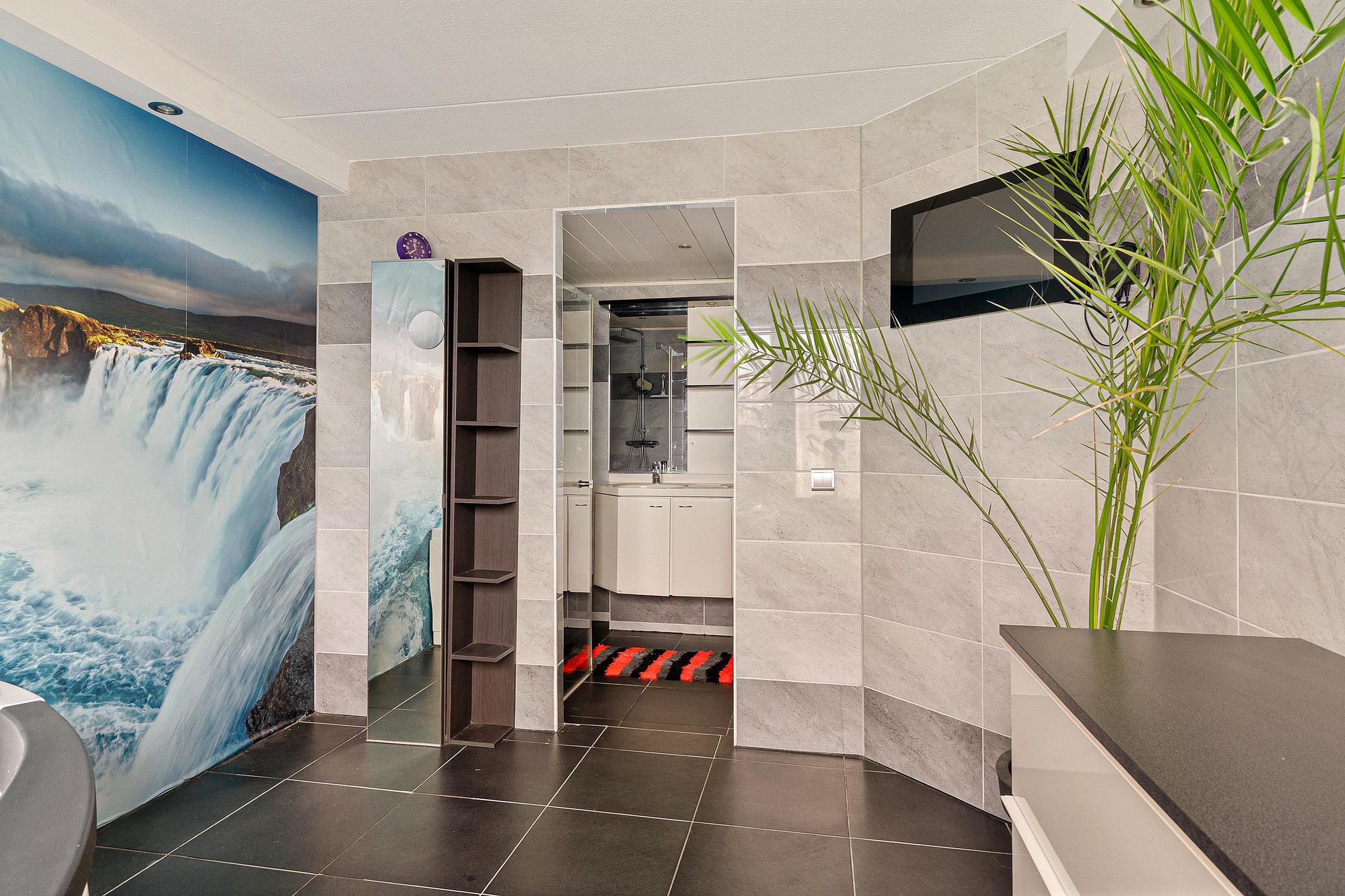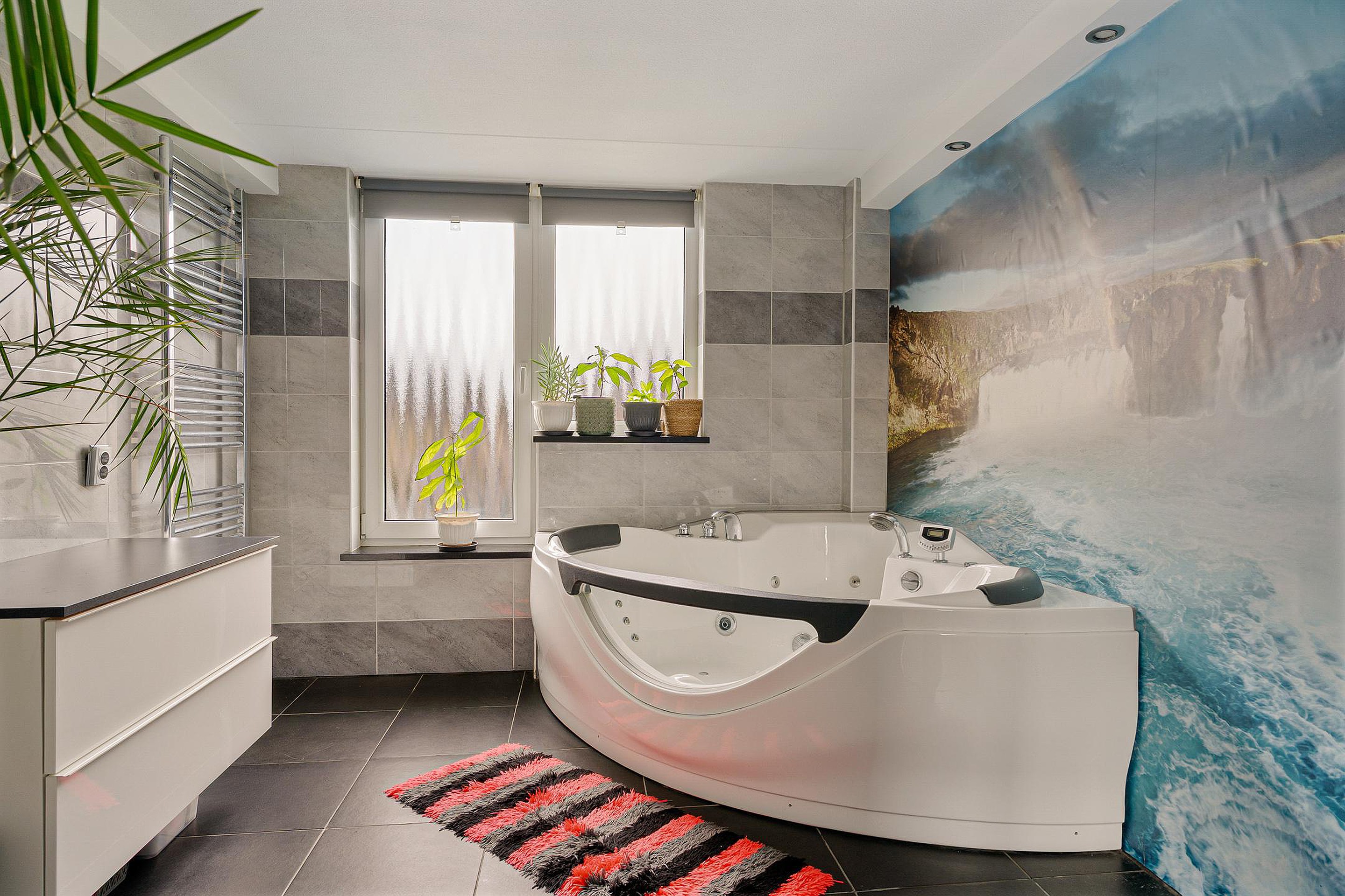 Een zeer ruime badkamer door het samenvoegen met een slaapkamer. De badkamer is voorzien van een hoekbubbelbad, aparte douchecabine, vaste wastafel met meubel, 2e toilet en designradiator.