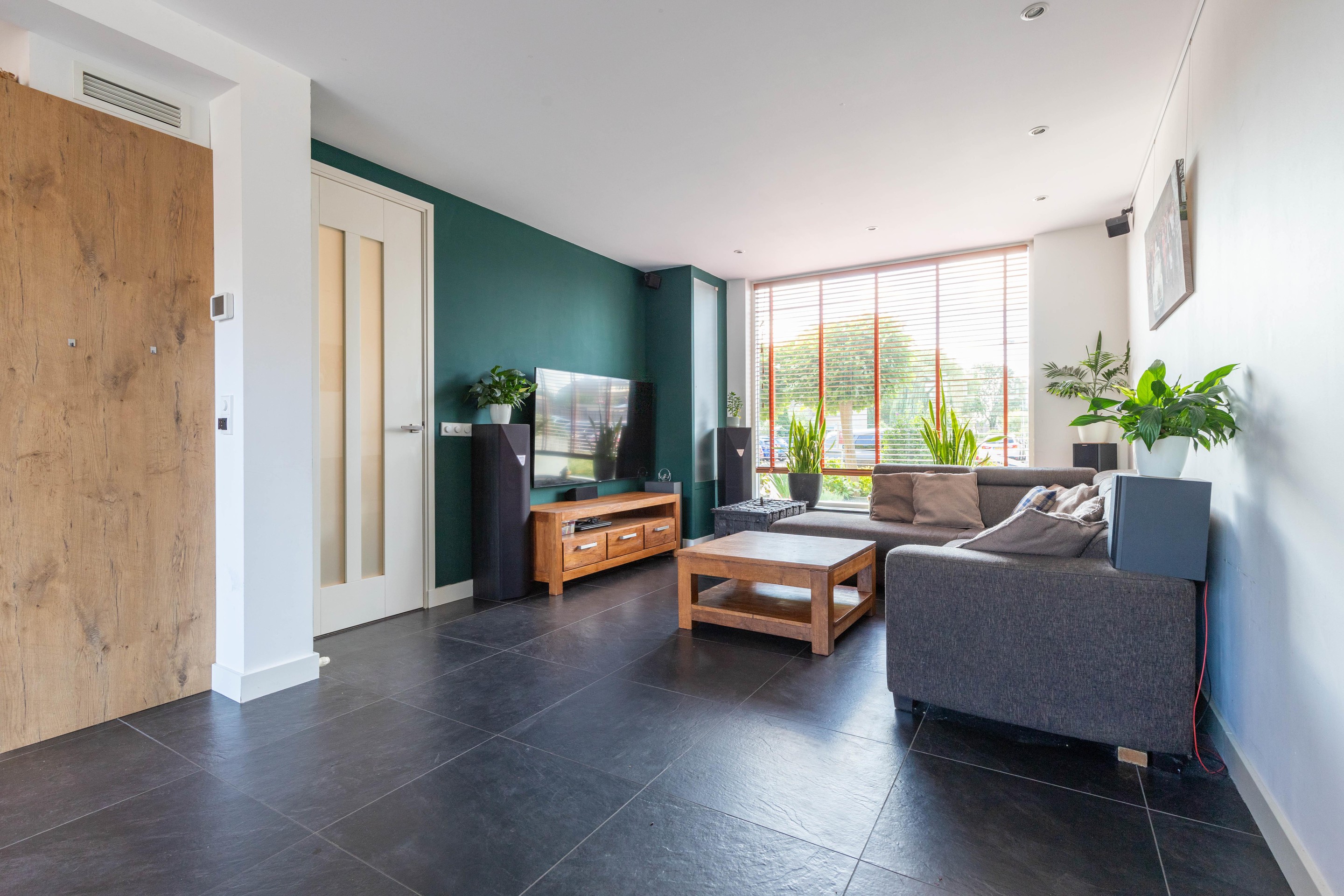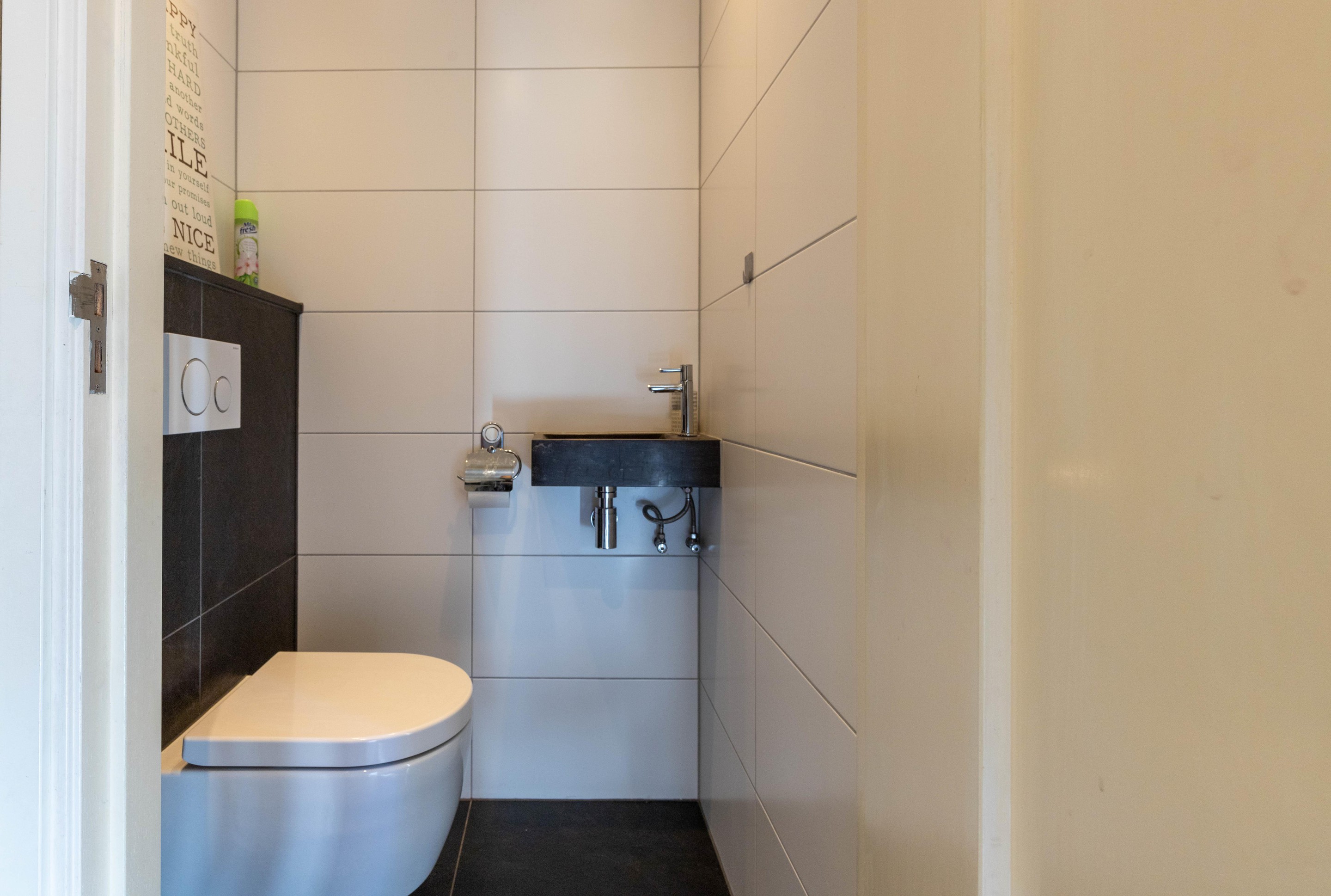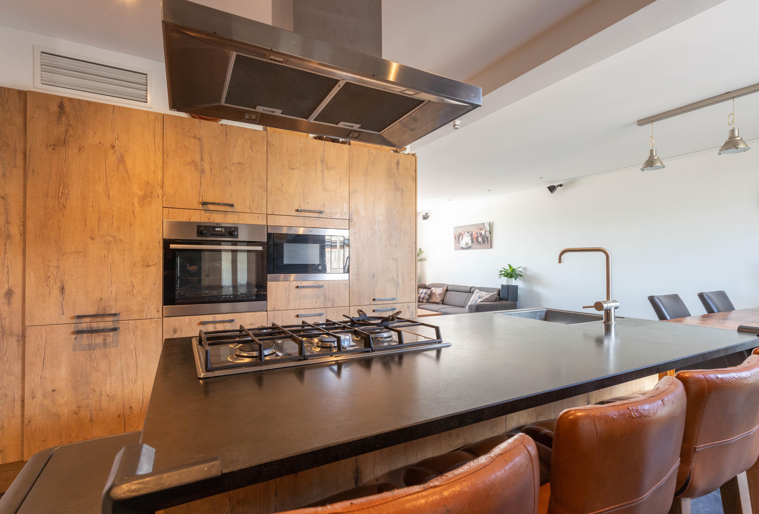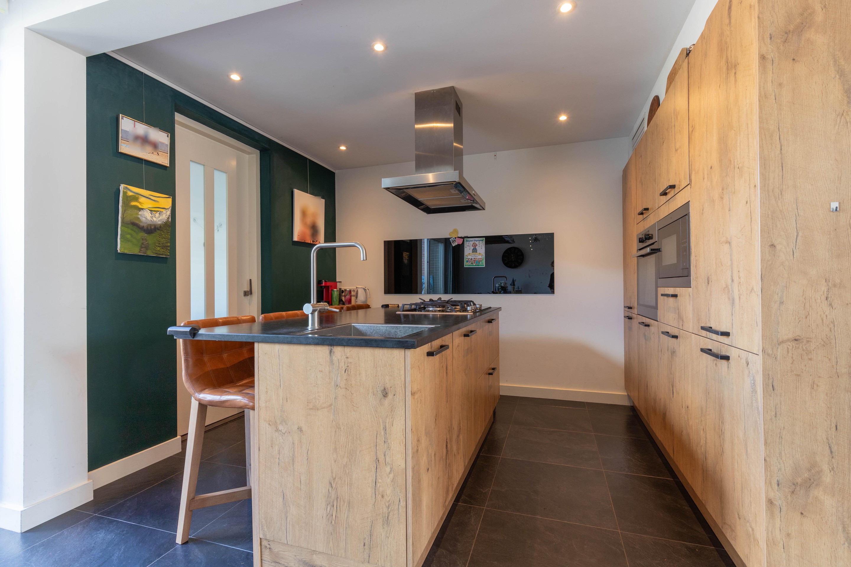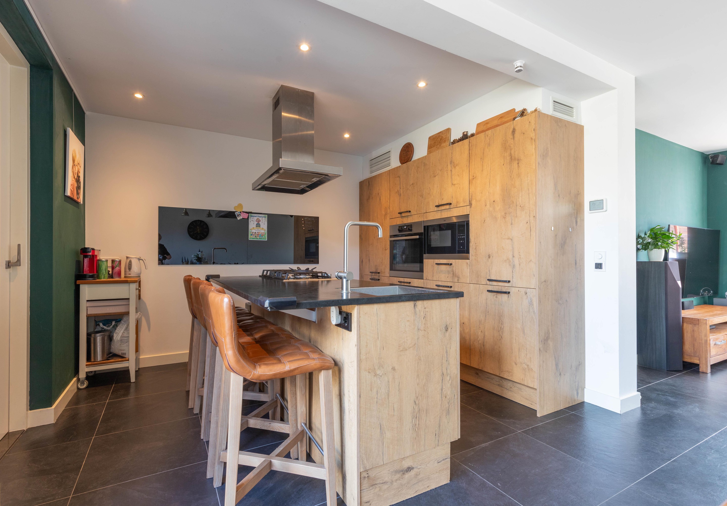 Begane grond Bij binnenkomst treft u de entree met garderobe, moderne toiletruimte, ruime bergkast en toegang tot de woonkamer. De woonkamer is heerlijk licht en beschikt over een riante woonkeuken en een bijkeuken/kantoorruimte. De luxe open keuken met kookeiland beschikt over diverse inbouwapparatuur: 5-pits gasfornuis met wok, koel-vriescombinatie, vaatwasser, oven, magnetron en een fraai keramisch blad.