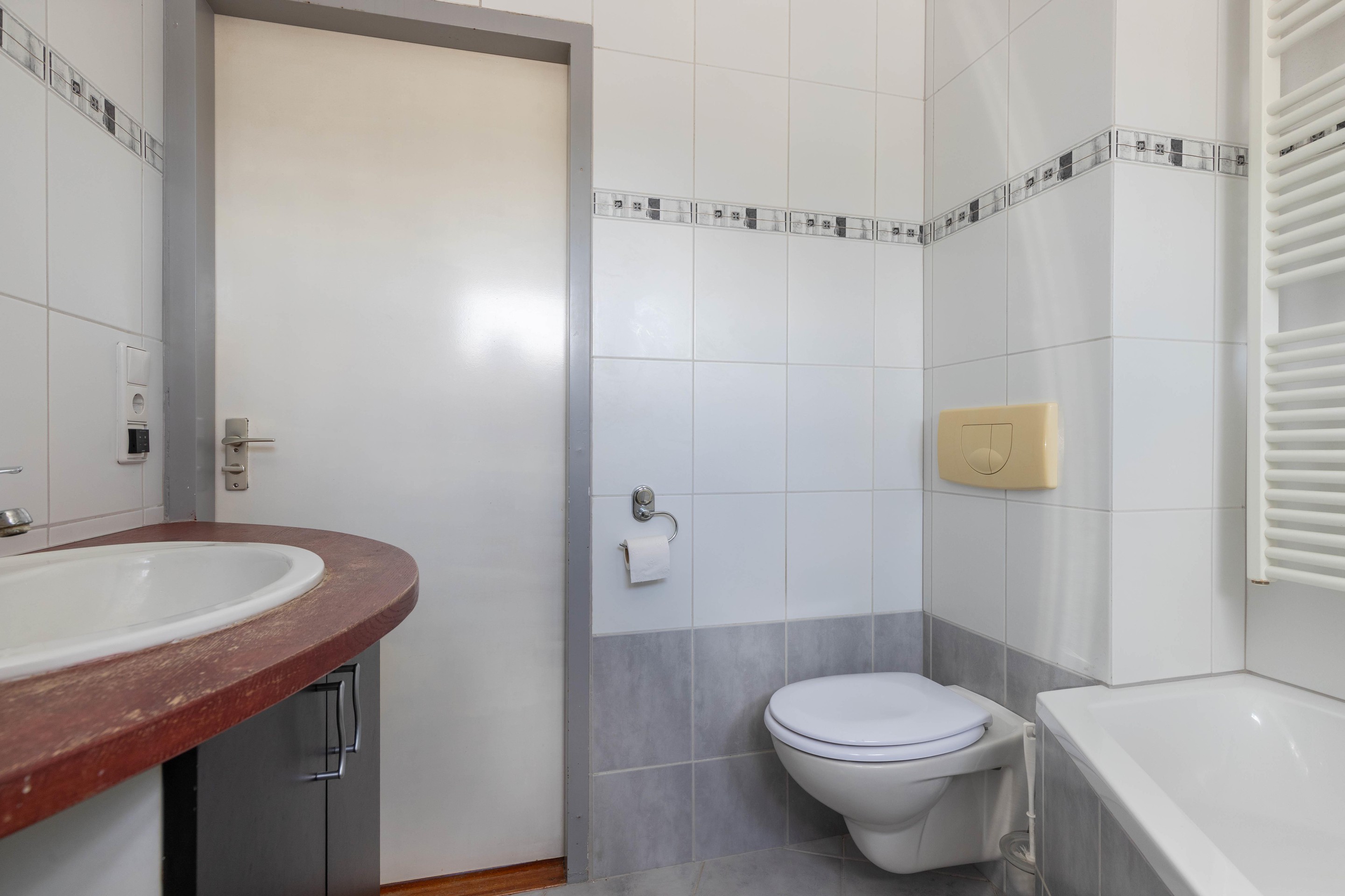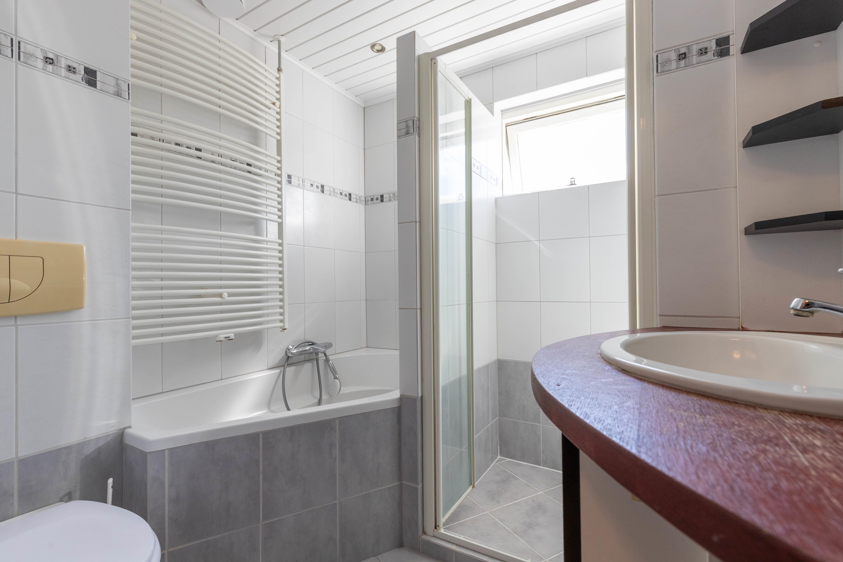 Eerste verdieping De eerste verdieping beschikt over drie slaapkamers: twee aan de achterzijde en één aan de voorzijde. De badkamer is eveneens aan de voorzijde gelegen en compleet uitgerust met ligbad, douche, hangend toilet, handdoekradiator en wastafelmeubel.