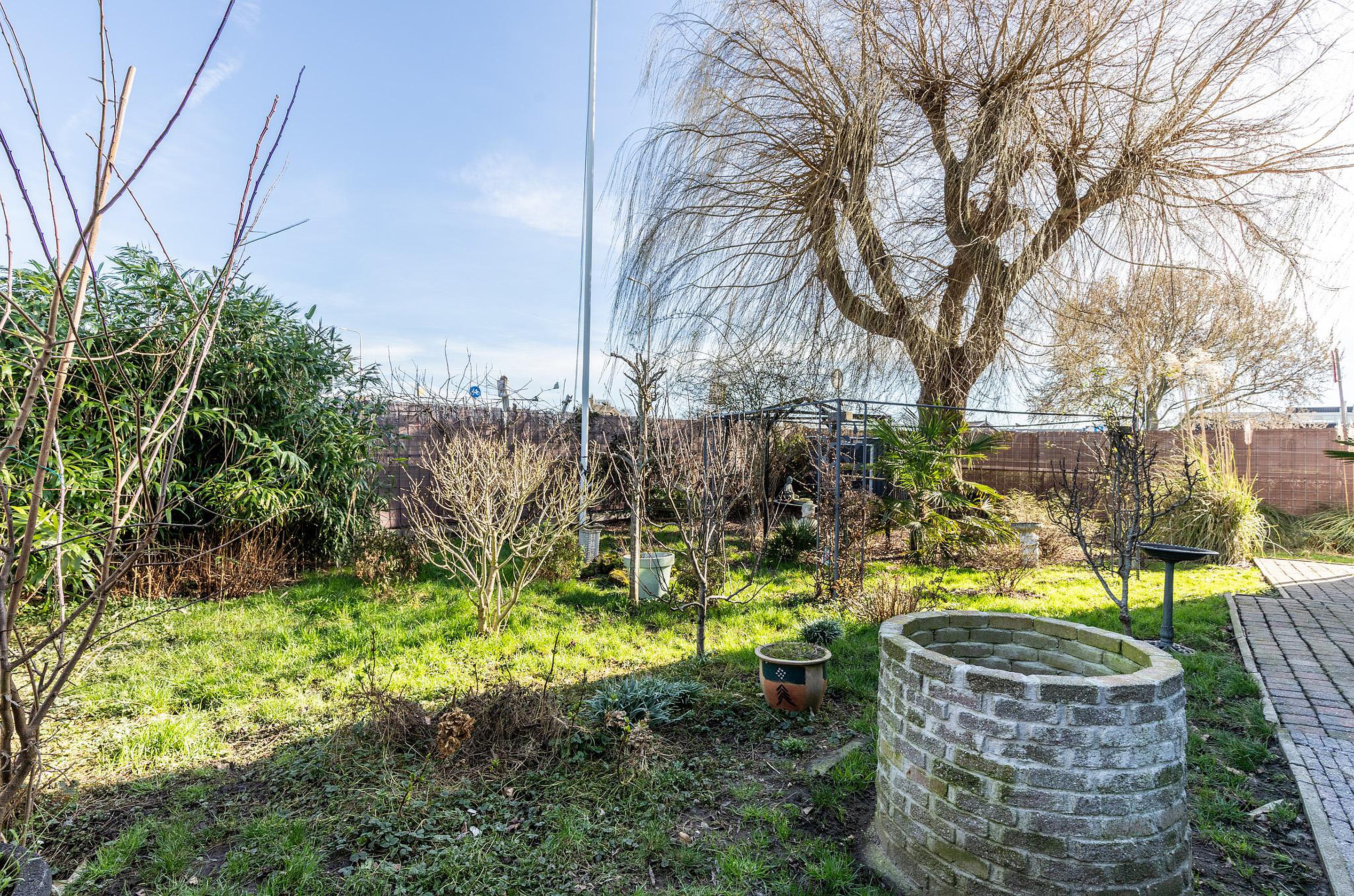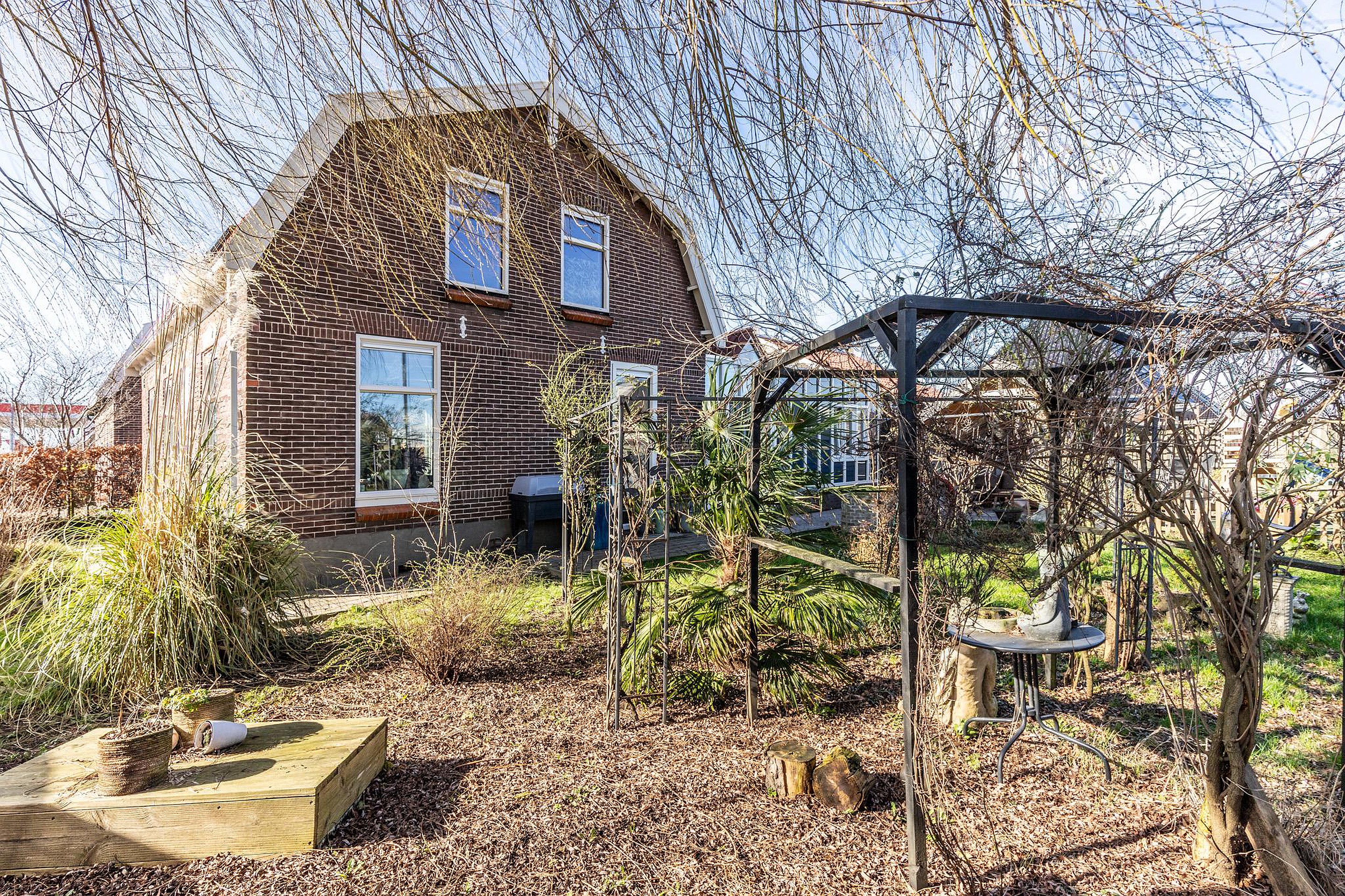 De tuin ligt rondom de woning, waarbij het grootste gedeelte zich aan de zij- en achterzijde van het huis bevindt. Door de gunstige ligging is er gedurende de dag altijd wel een plek in de zon te vinden, terwijl er op warme dagen ook voldoende mogelijkheden zijn om de schaduw op te zoeken.