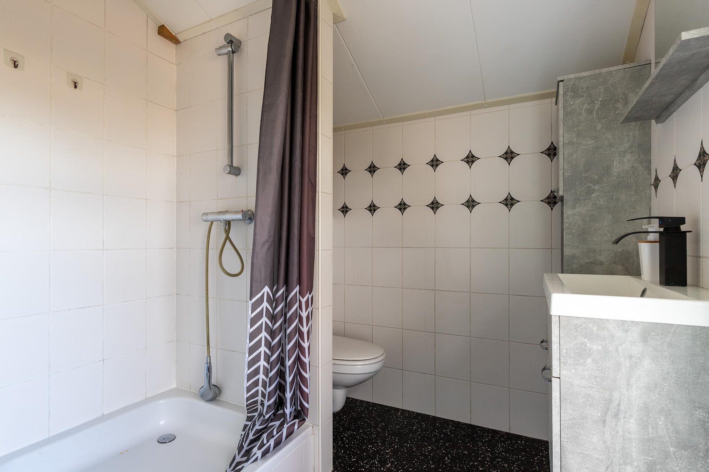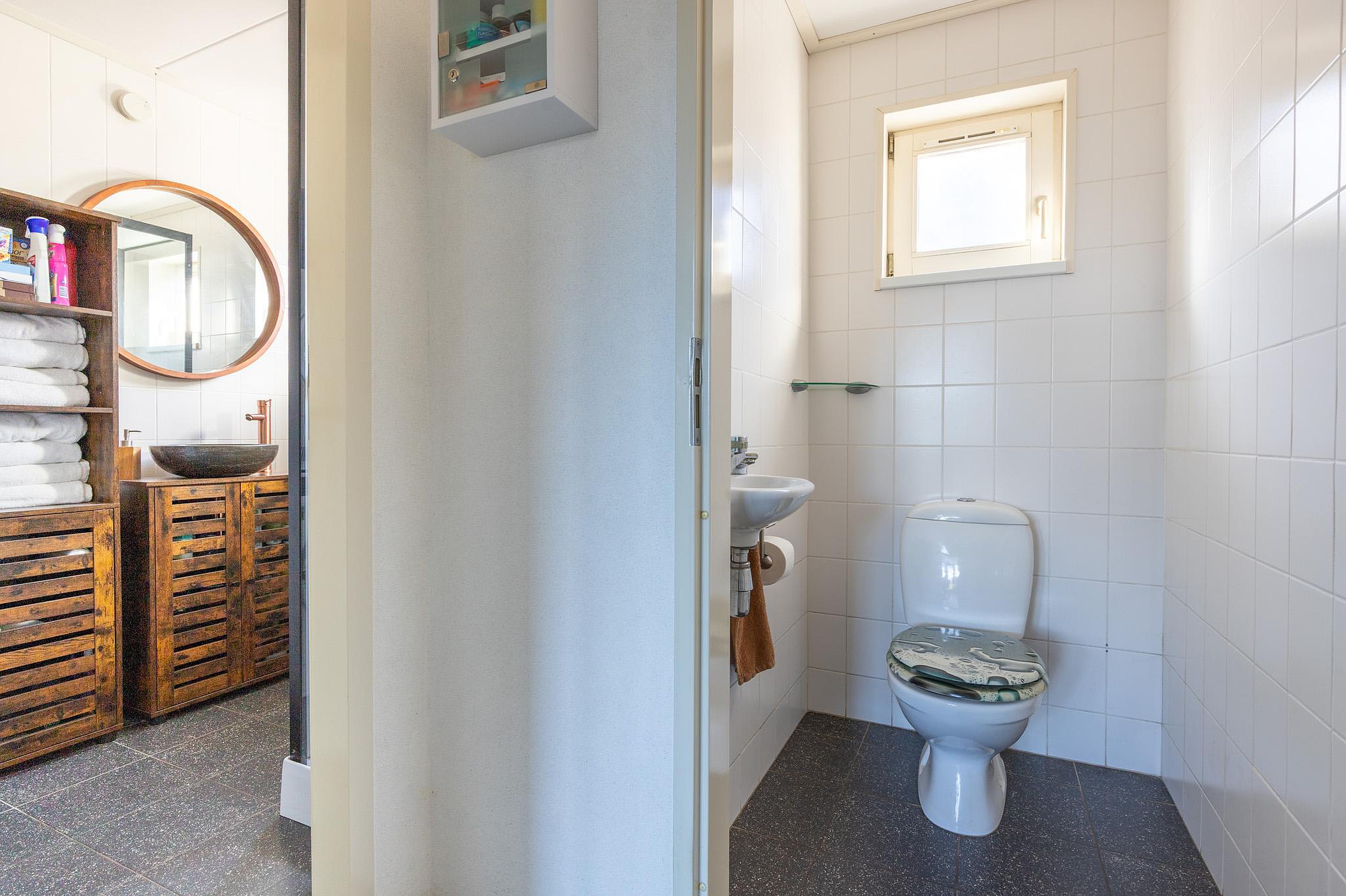 Terug in de keuken zijn ook de overige vertrekken op de begane grond te bereiken. Zo is er toegang tot een tweede badkamer, toiletruimte, een slaapkamer en een inpandige bergruimte. Vanuit deze bergruimte is er een deur naar de tuin.