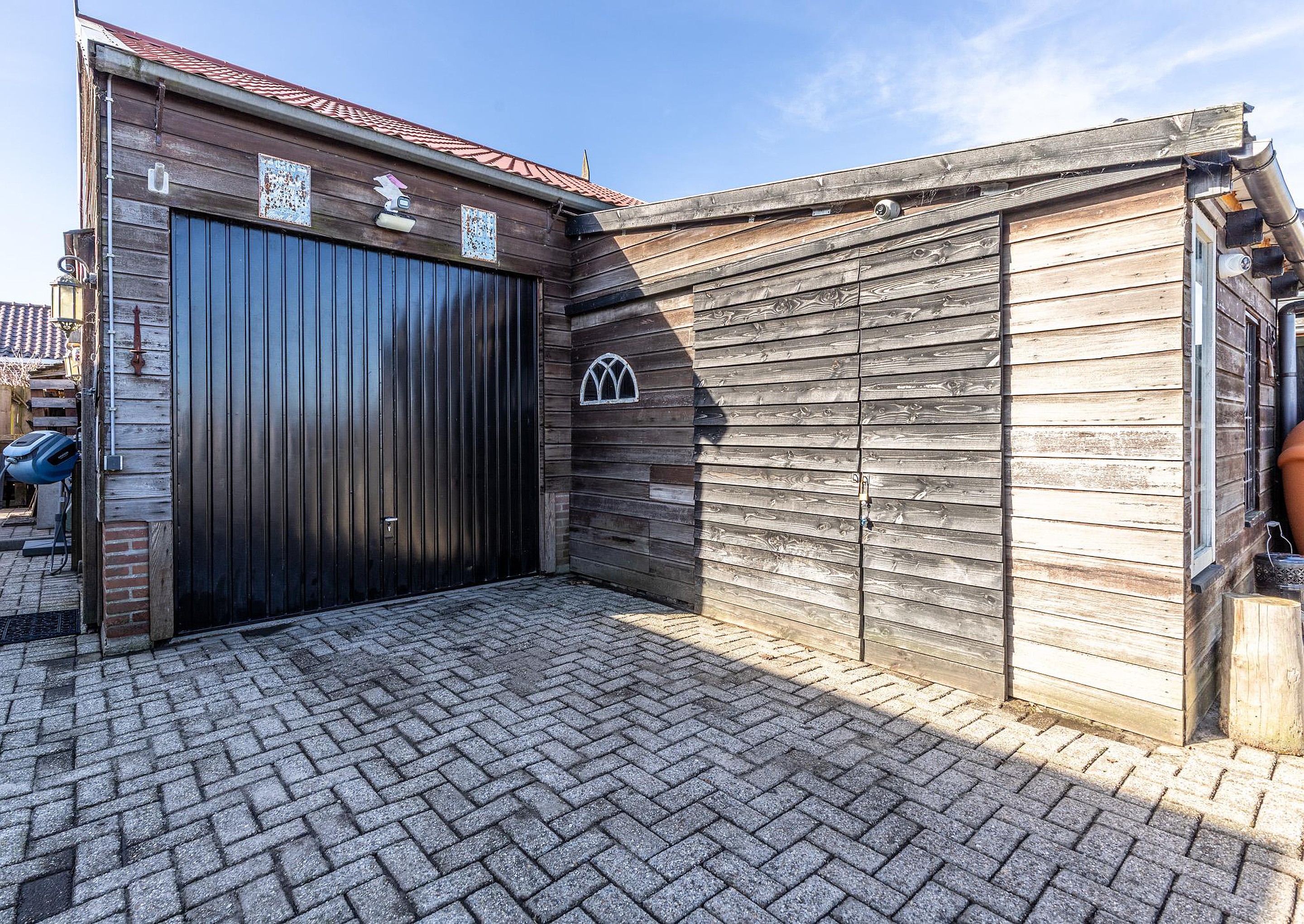 Achter op het perceel bevinden zich een ruime garage en een schuur met een gezamenlijke oppervlakte van circa 77 m2. De garage beschikt over een handmatige garagedeur en is voorzien van elektra. Daarnaast is er een oprit aanwezig, waardoor er voldoende ruimte is voor het parkeren van een auto op eigen terrein.